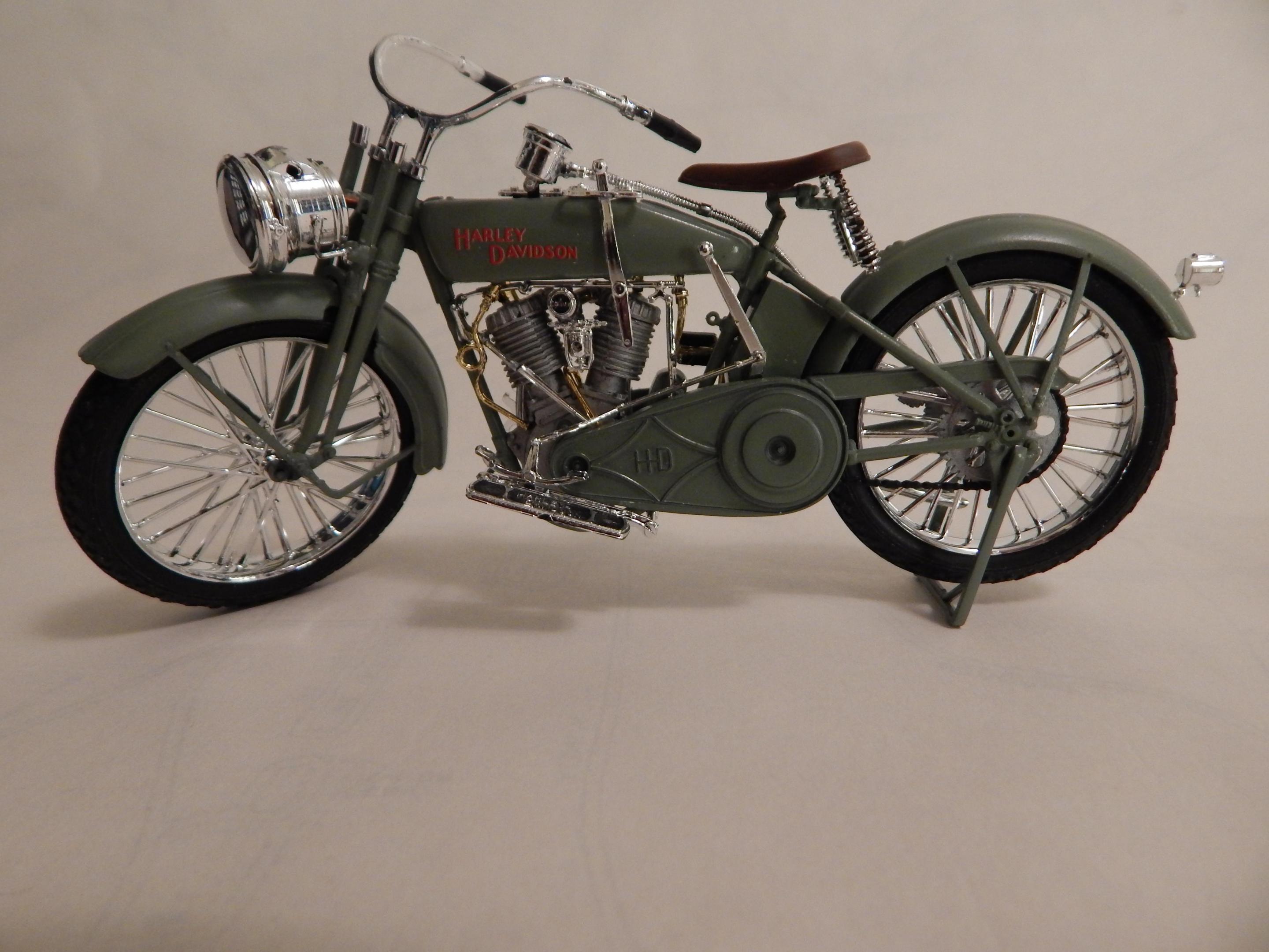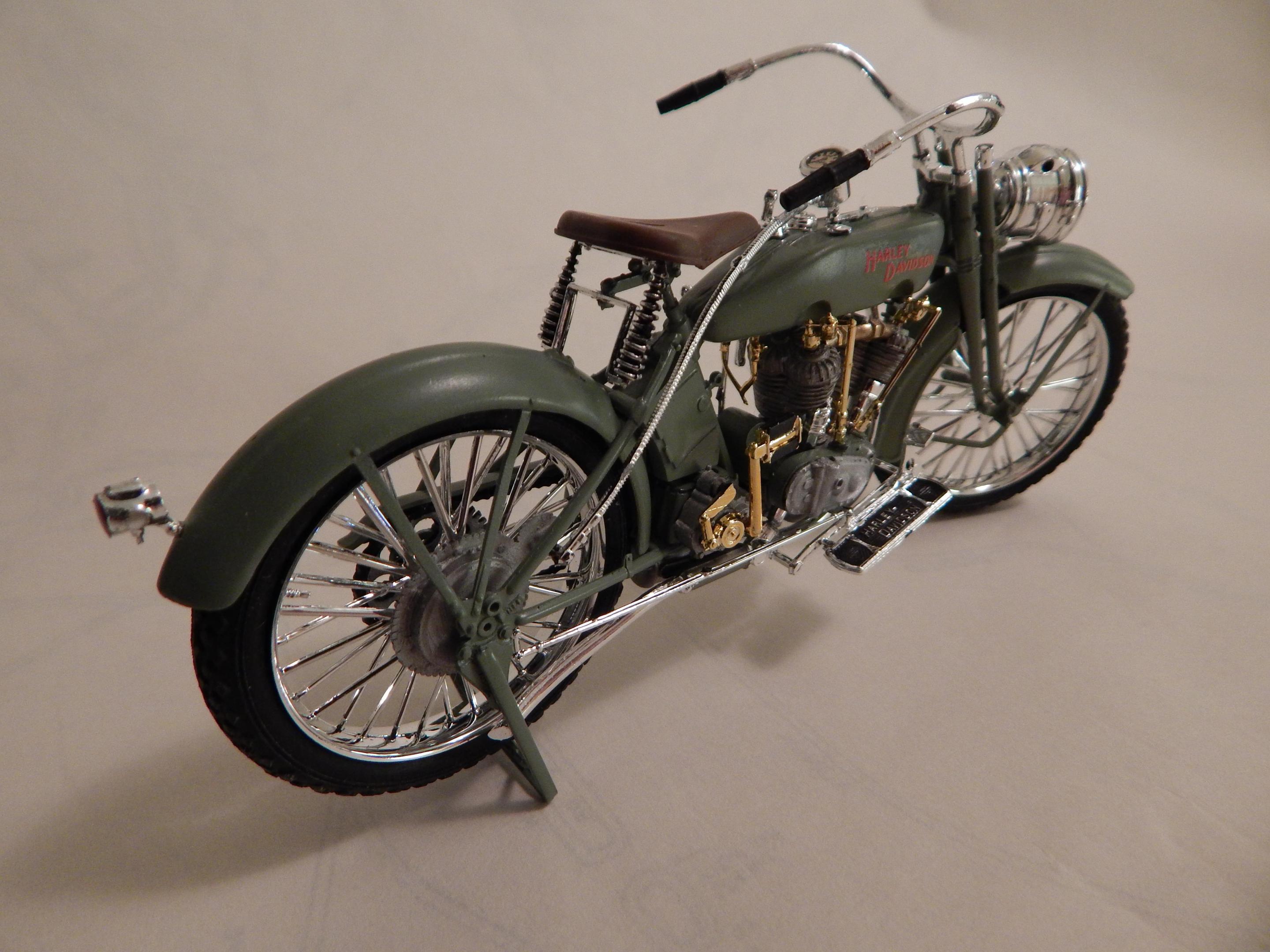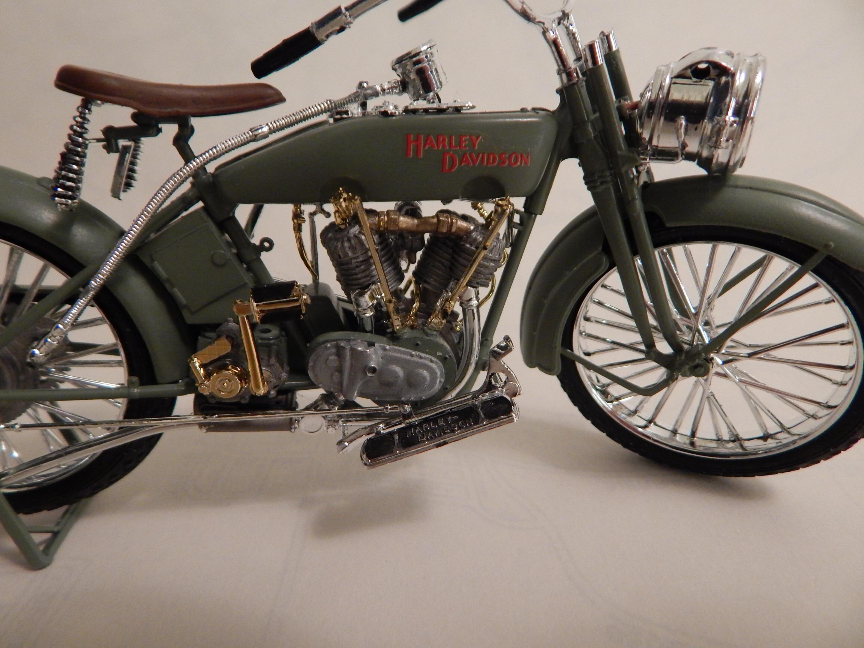 Happy spring to all,,just finished this up,,its actually 3 large scale Revell kits in one. Started with glue blob 1/2 assembled bag of parts from the swap meets. The Revell large scale police bike,circa mid to late 70's for the motor and frame,back wheel. And then I used some leftover parts from the large scale Triumph chopper kits for drive box,,rear fender + oil + battery box,, And drag style seat. Front springer ++ handlebars are from the large scale snap harley kit from the 1990's. Front wheel is from one of the ol Revell drag bike kits as is the speedometer+light. Scratch built the rear grab bar + and plate/rear light setup. Sprayed rattlecan testors orange,,hand painted everything else. Decent results from glueblob bag for 5 $ Thnx for lookin.