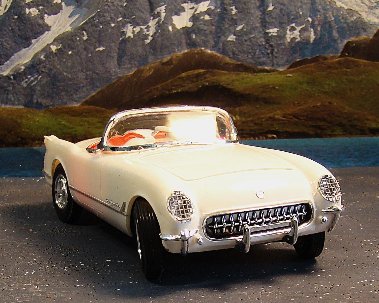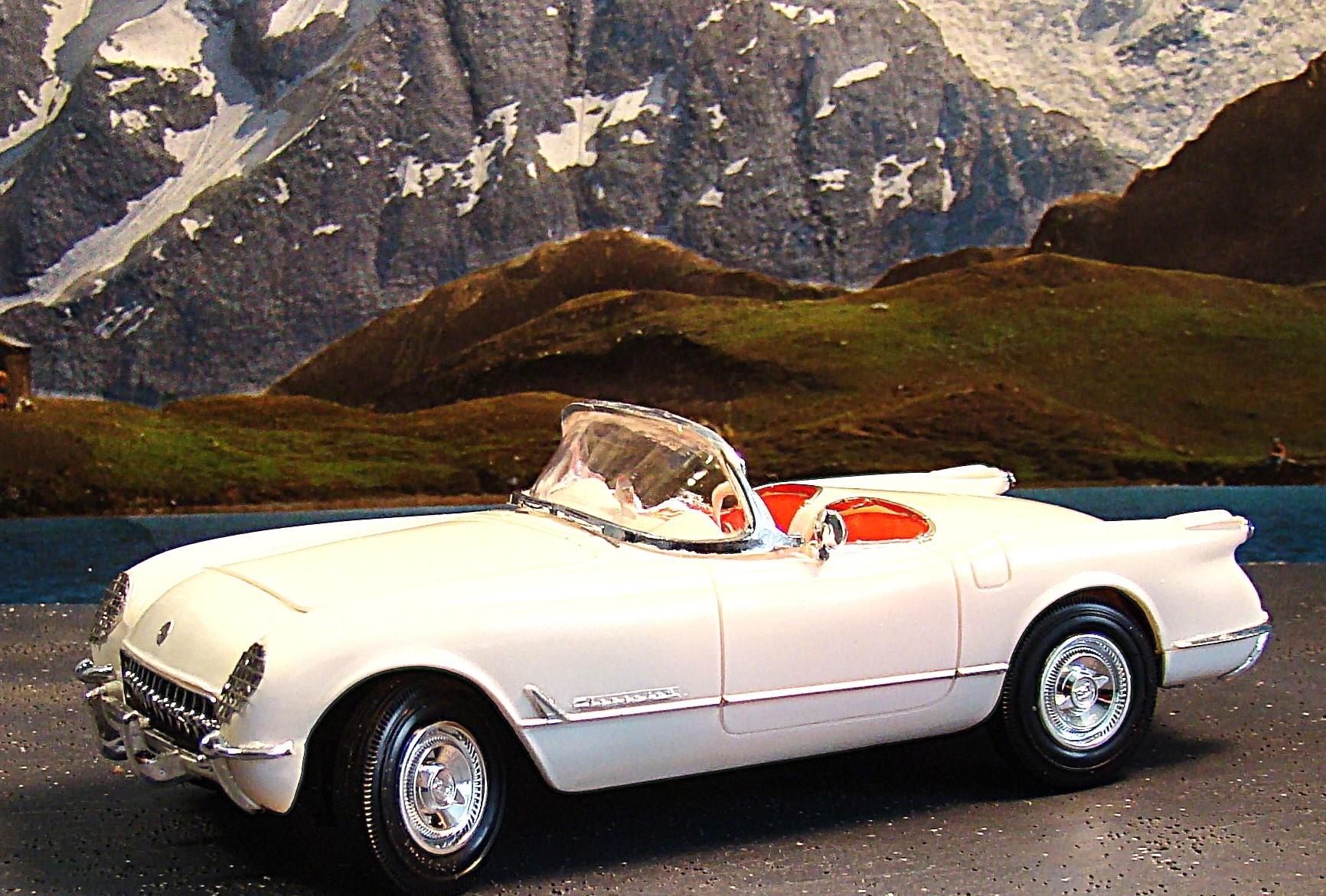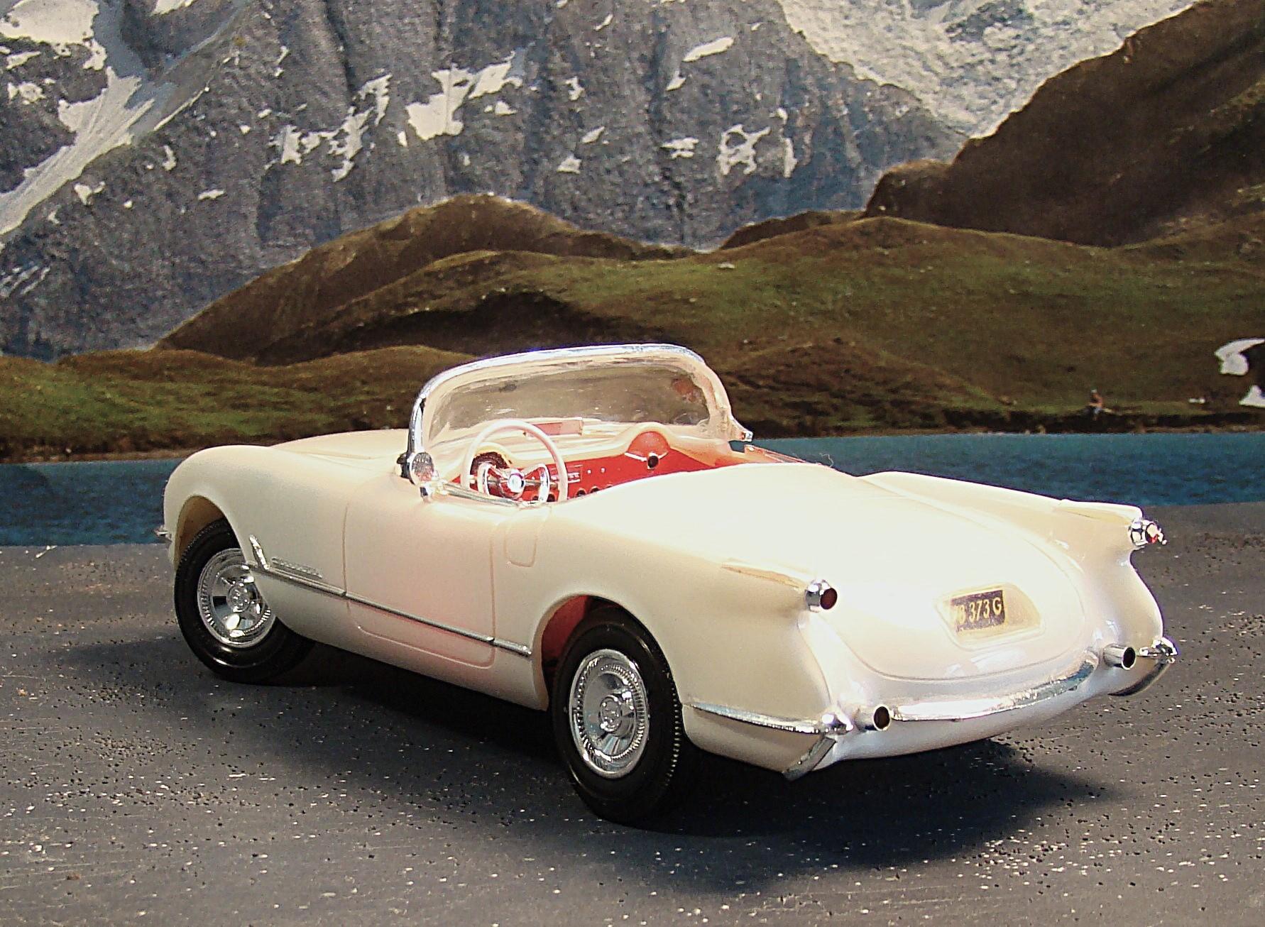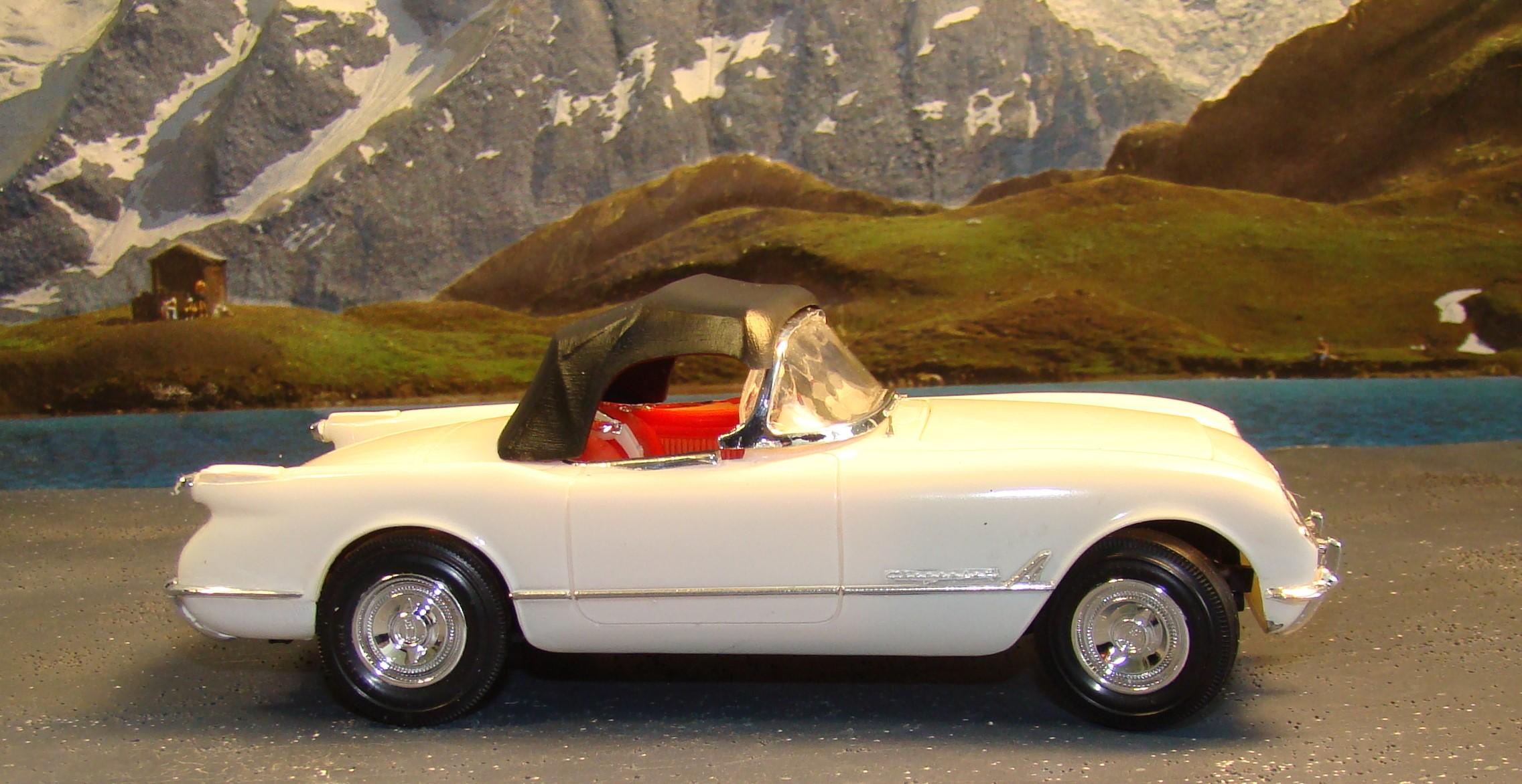 This is the last of my series of Corvette builds. And the only one I hadn't previously painted. This is AMT's 1953 Corvette. Color is Tamiya TS26 white. Not a bad kit it for AMT. Everything went pretty well except for the chassis which had to be pinned and wired in to place to get the ride height right. And a lot of flash and ejection pin marks, par for the course for and early AMT. Other than that, I am fairly pleased with the result. I want to thank everyone who commented on my last 14 posts of Corvettes. Thanks for looking and feel free to comment on this one. Lot of nice exterior detail on this iconic Vette. Interior color is MR Color 108 character red. Kit hweels steered but the tie rod had to be hinged. Interesting feature of the back end is the glass covered licence plate. Exhaust pipes are chrome antenna tubing. The soft top was included in the kit and was sprayed with a combination of Nato black and gloss black from Tamiyas LP line. This car was powered by Chevrolets Blue Flame 6 of 236 cu. and rated at 150hp. It was mated to a powerglide 2 speed auto transmission. It was no speed demon but was unique with its handmade fiberglas body. Only 300 of these were made in the Flint MI plant. Production was eventually moved to St Louis. I replaced the clear lenses with real mesh, a feature found on Corvettes until 1955.