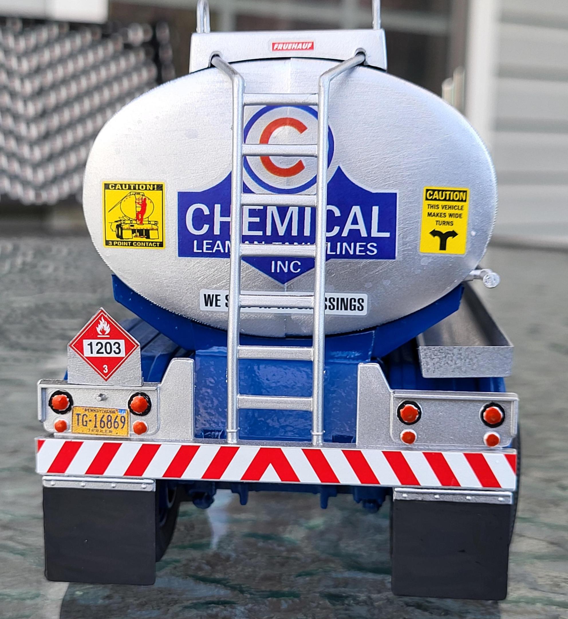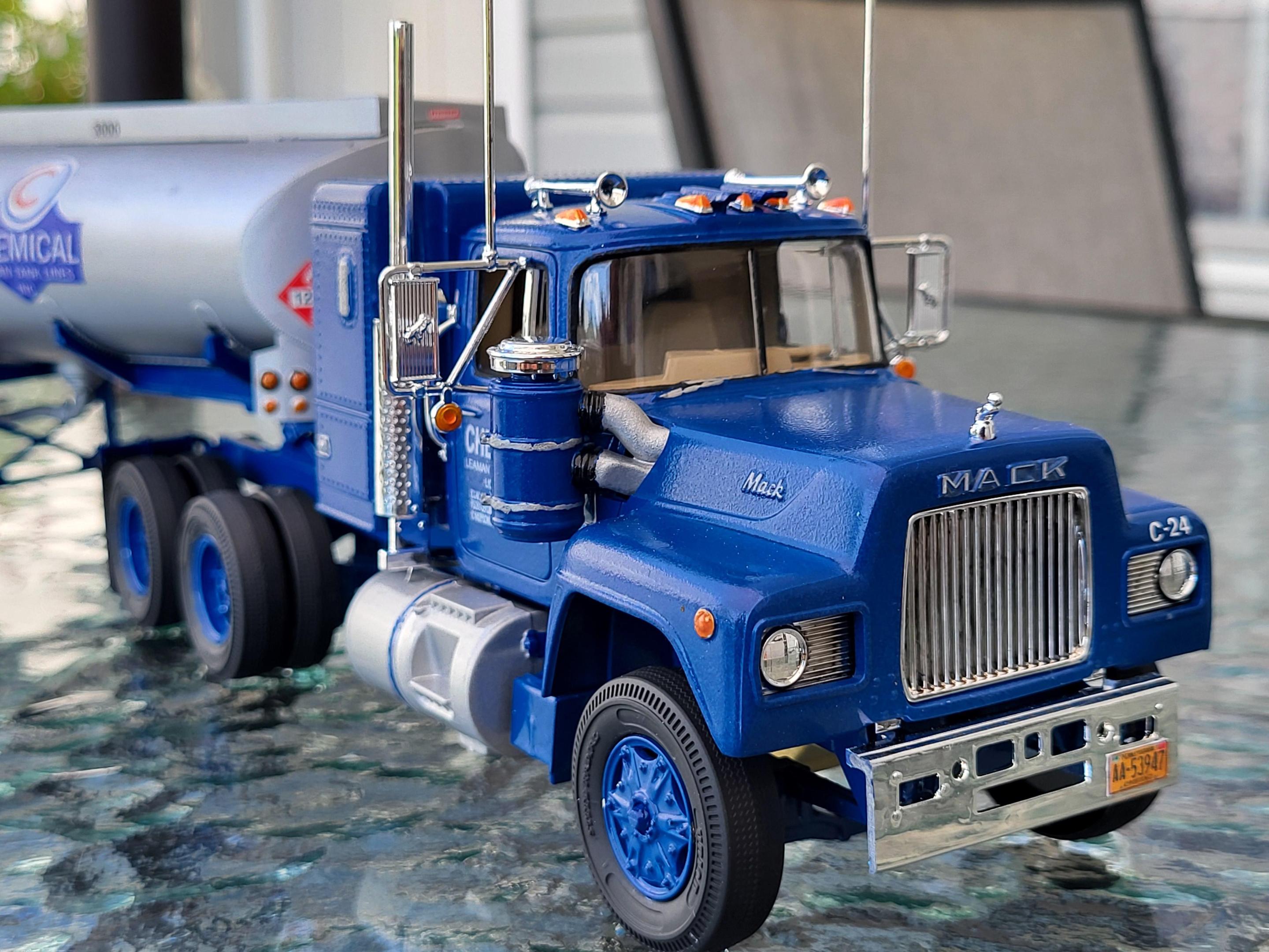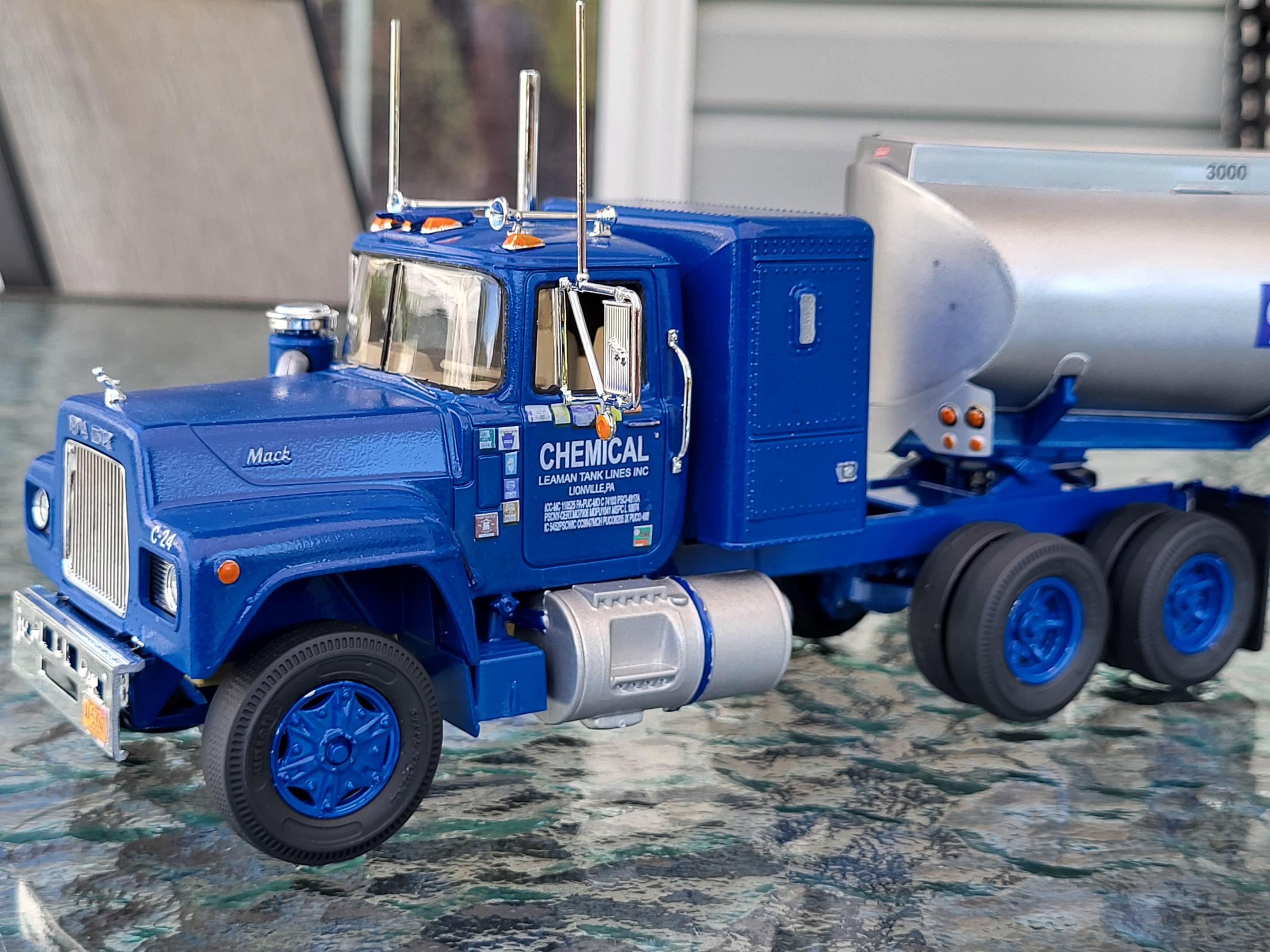 A very long time ago, I purchased the Monogram 1/32 Mack “R” Conventional & Fruehauf Tanker. It’s a nicely detailed snap kit, and for the most part went together well. That’s an awful lot of tape, glue, & rubber bands for a snap kit. The kit came with stickers to detail the tractor & trailer, so those had to go. I picked up some Chemical Leaman decals from Model Truckin’, & I was in business. Revell graciously provided the decal sets from their recent reissues of the Mack & tank trailer. The kit came with 10-hole disks all around, so I swapped them for spokes from the Mack C600 fire truck (Thanks, Greg.) & the Fruehauf reefer. I also bobbed the front bumper & corrected the fit of the rear mud flaps. Fleet Unit Number on the tractor is from Microscale, the Pennsylvania license plate on the tractor was downloaded from Rick Kretschmer’s License Plate Archive, and the Pennsylvania plate on the trailer is from The License Plate Shack. I also made the little bracket for the DOT hazmat placard on the rear of the trailer. I don’t know if Chemical Leaman ever hauled gasoline, or used this type of trailer, but they do now! Color is Testors Dark Blue. Here are some of my inspiration photos from Hank’s Truck Pictures (remember them?): Here is the model. Enjoy! Interior: "Engine: