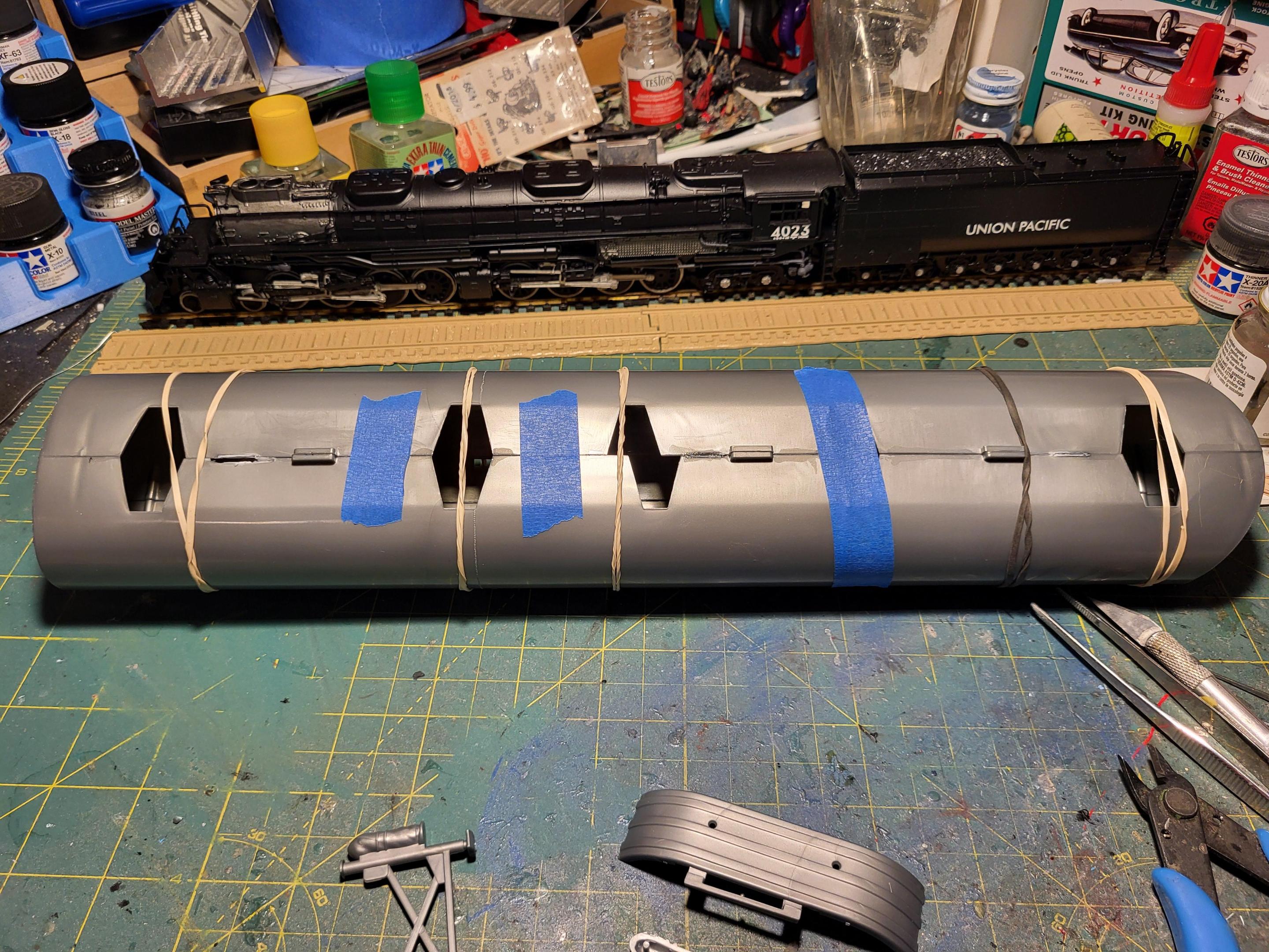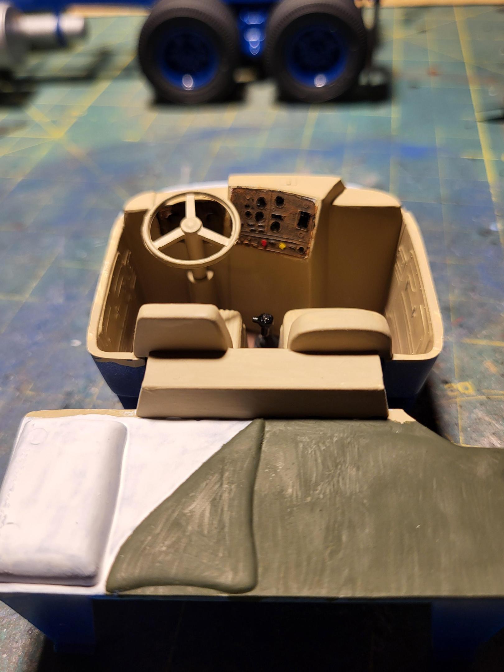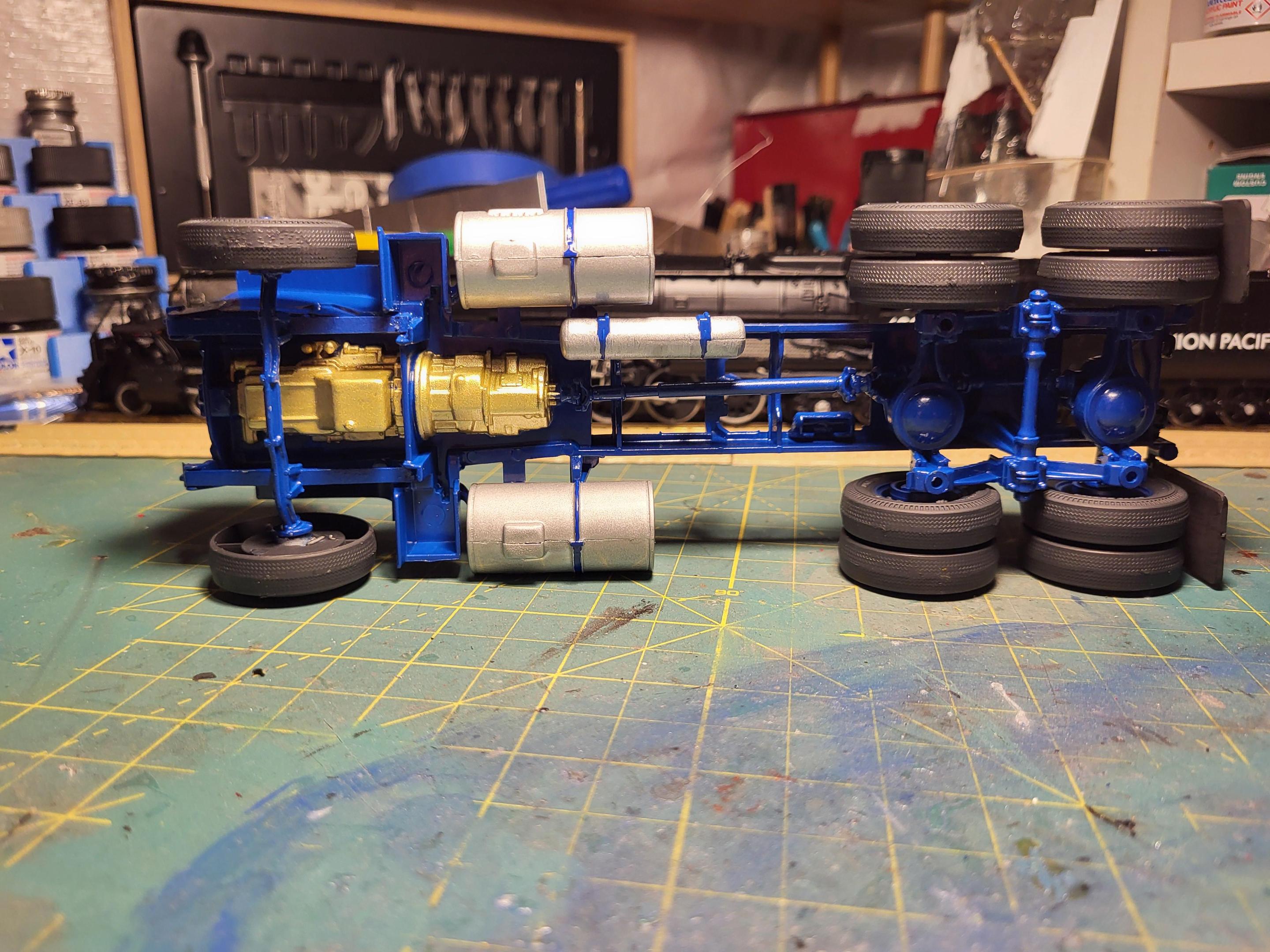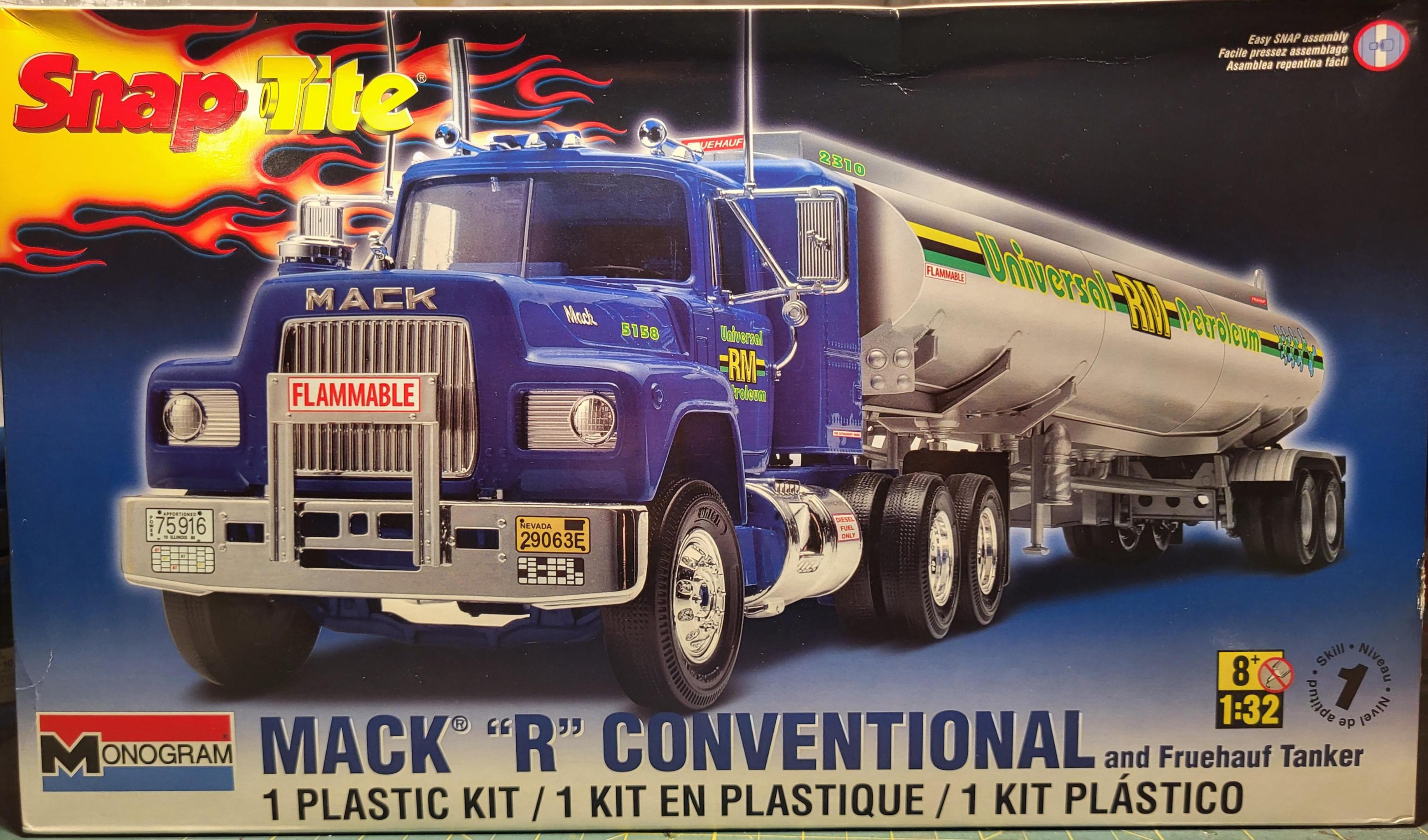 A very long time ago, I purchased the Monogram 1/32 Mack “R” Conventional & Fruehauf Tanker. It’s a nicely detailed snap kit, and for the most part went together well. That’s an awful lot of tape, glue, & rubber bands for a snap kit. The kit came with stickers to detail the tractor & trailer, so those had to go. I picked up some Chemical Leaman decals from Model Truckin’, & I was in business. Revell graciously provided the decal sets from their recent reissues of the Mack & tank trailer. The kit came with 10-hole disks all around, so I swapped them for spokes from the Mack C600 fire truck (Thanks, Greg.) & the Fruehauf reefer. I also bobbed the front bumper & corrected the fit of the rear mud flaps. Fleet Unit Number on the tractor is from Microscale, the Pennsylvania license plate on the tractor was downloaded from Rick Kretschmer’s License Plate Archive, and the Pennsylvania plate on the trailer is from The License Plate Shack. I also made the little bracket for the DOT hazmat placard on the rear of the trailer. I don’t know if Chemical Leaman ever hauled gasoline, or used this type of trailer, but they do now! Color is Testors Dark Blue. Here are some of my inspiration photos from Hank’s Truck Pictures (remember them?): Here is the model. Enjoy! Interior: "Engine: