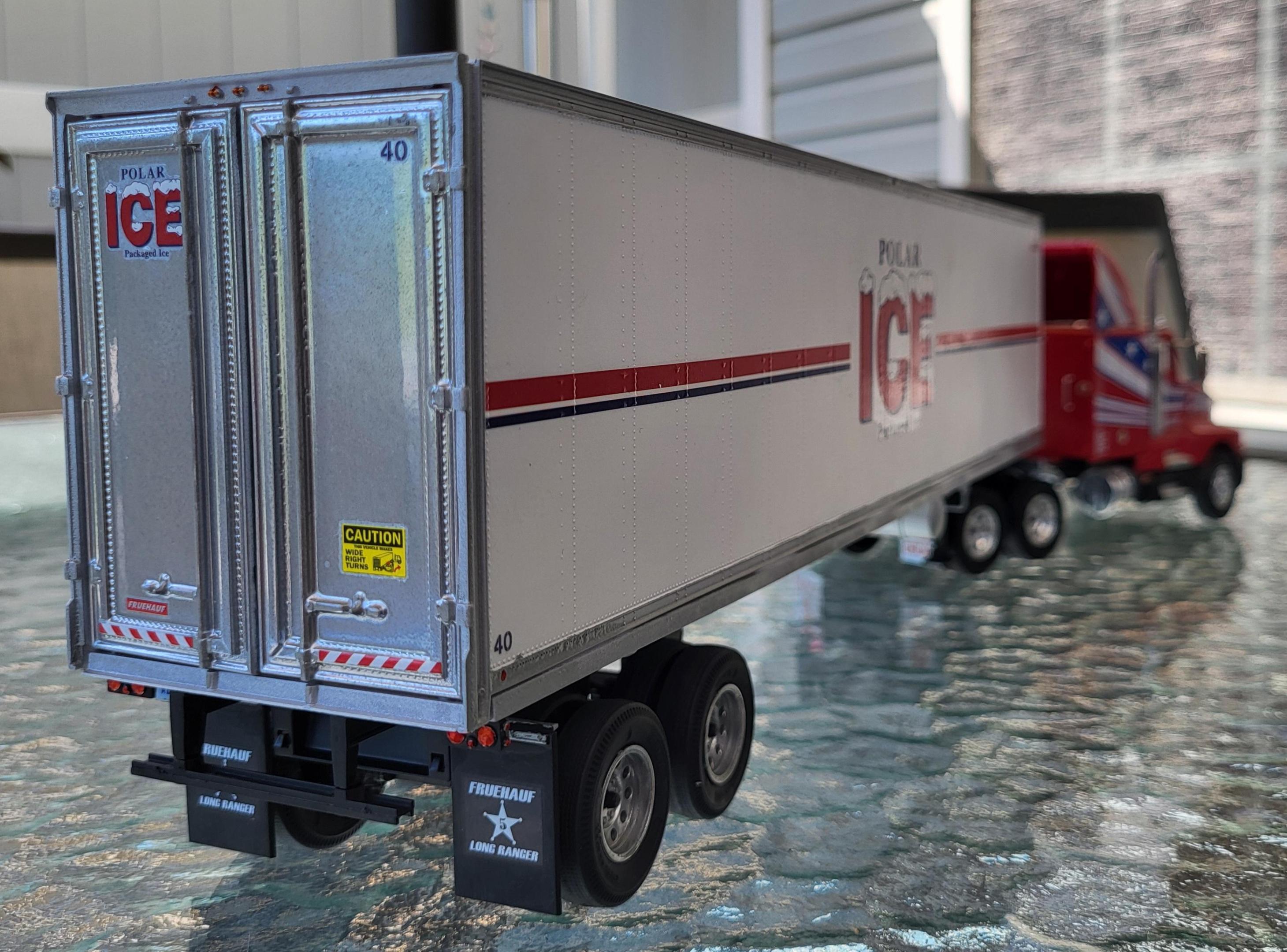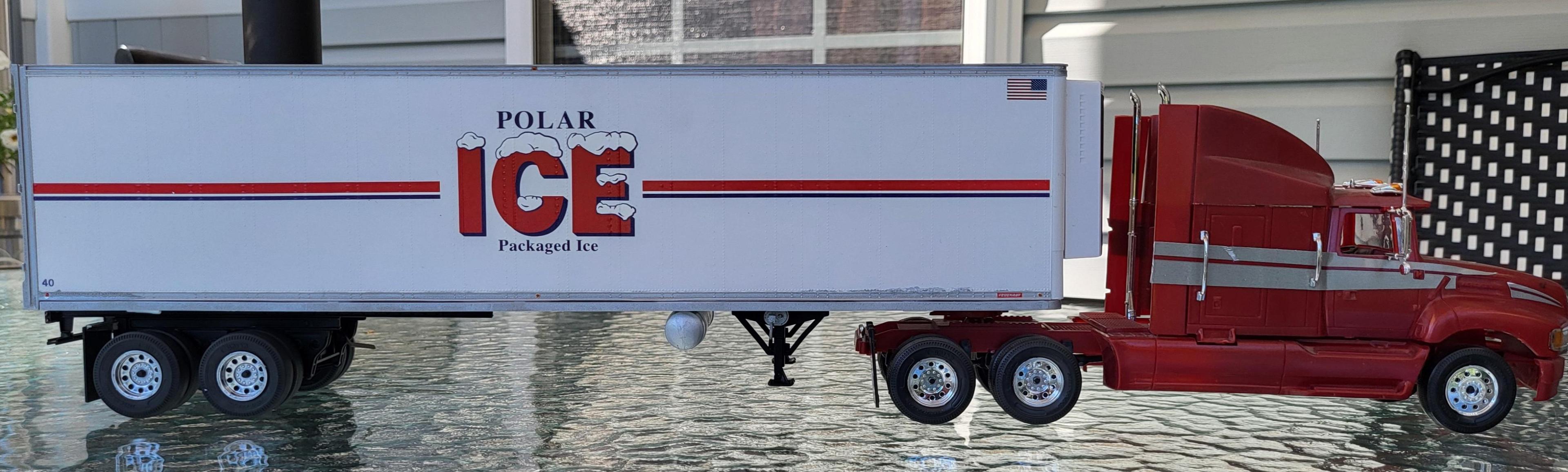Here is my completed Revell 1/32 Fruehauf Reefer trailer. It is essentially box-stock with the exception of the 10-hole disks from the Monogram Fruehauf Tanker Trailer. The main color is Rust-oleum Semi Gloss White, and the wheels & rear doors are Rust-oleum Chrome. Reefer unit is Tamiya Gloss Pure White. Also, since The Polar Ice Company is located in Troy, MI, I put a Michigan plate from the Model Truckin’ Chemical Leaman decal sheet on the trailer. Here it is being pulled by the Monogram Kenworth T600A I finished in 2008: And here it is behind the Revell Ford LTLA9000 Aeromax my son built in 2012: Riddle me this: why do the Revell-Monogram 1/32 trailers have a big ole’ kingpin while some of the tractors have fifth wheels with pins sticking out of them?