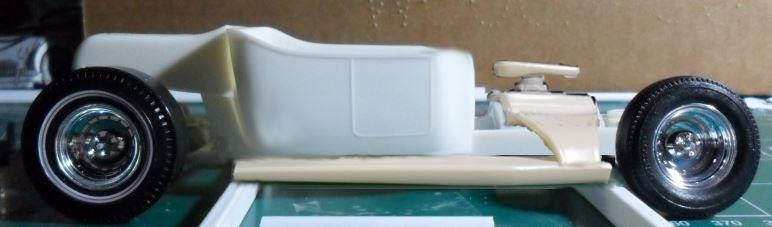 What do you get when take the frame and front suspension from the AMT L'il Hot Dogger, the engine block/trans, intake maniold, carb and rear end from the Raiders Coach, the AMT 23 T Racing body, rims from the Monogram 31 Ford A, some parts bin tires, a can of Rustoleum Gloss Seaside paint, and a couple of plastic spoons? Well, here's the first dry mockup.