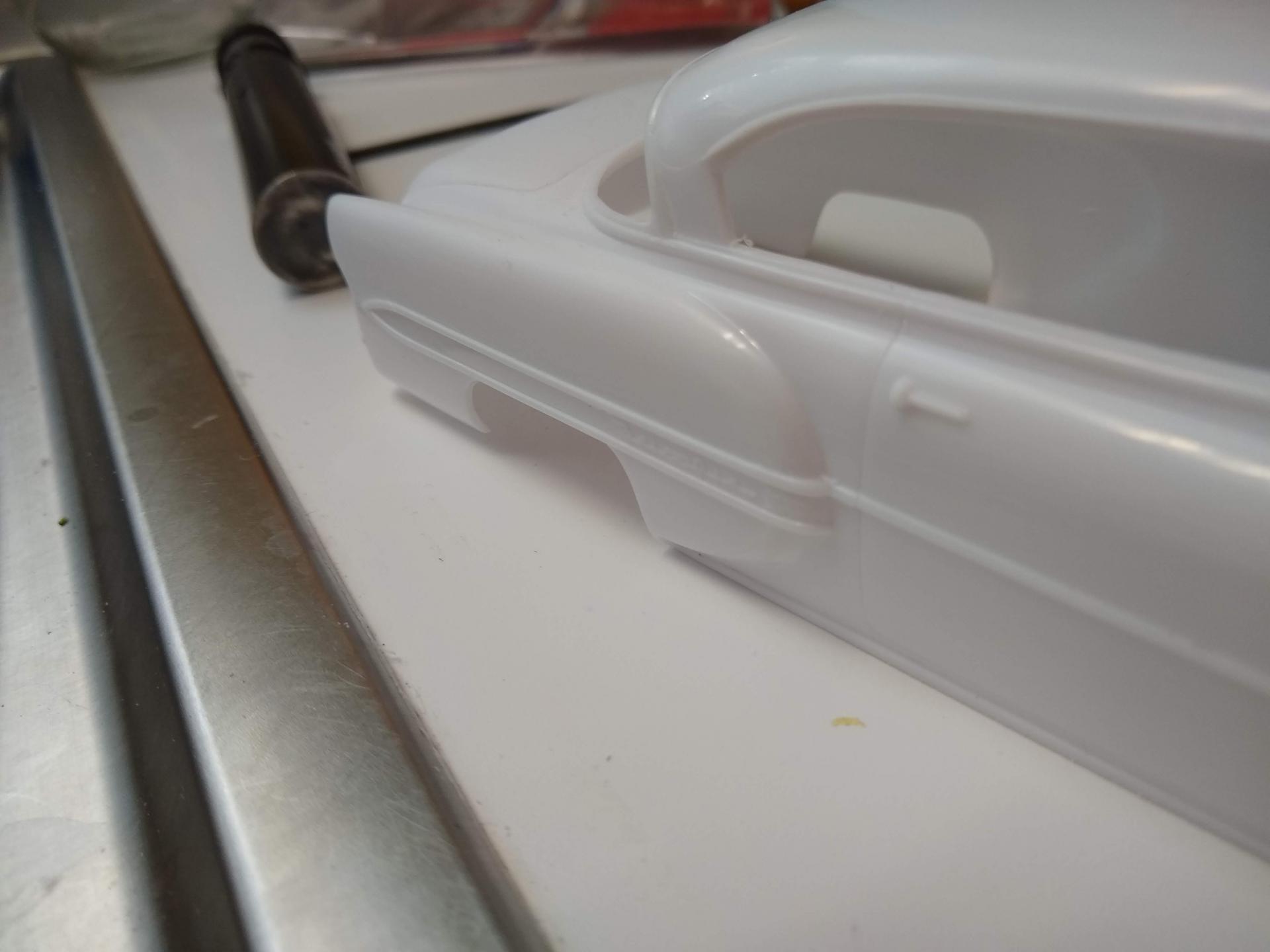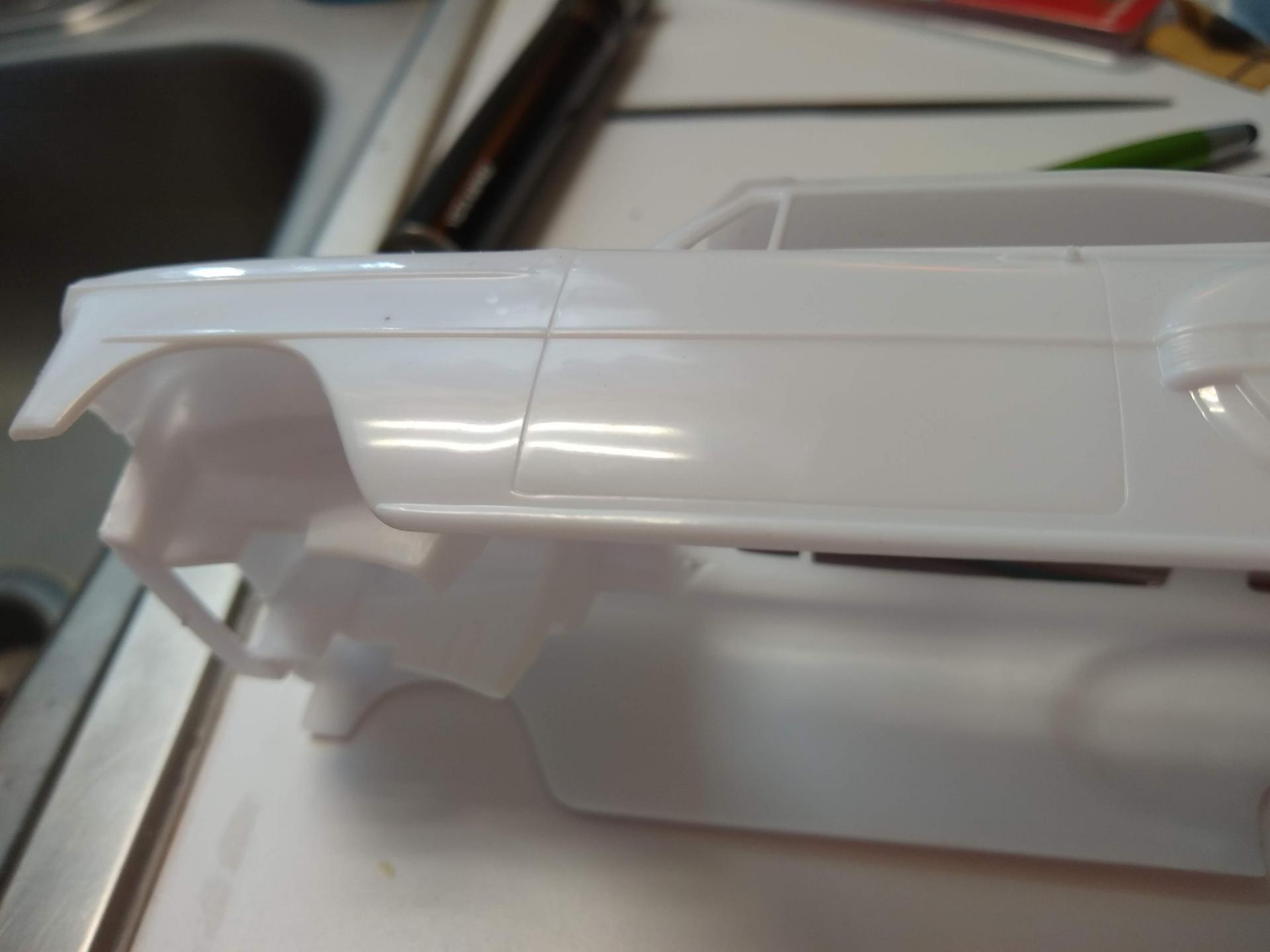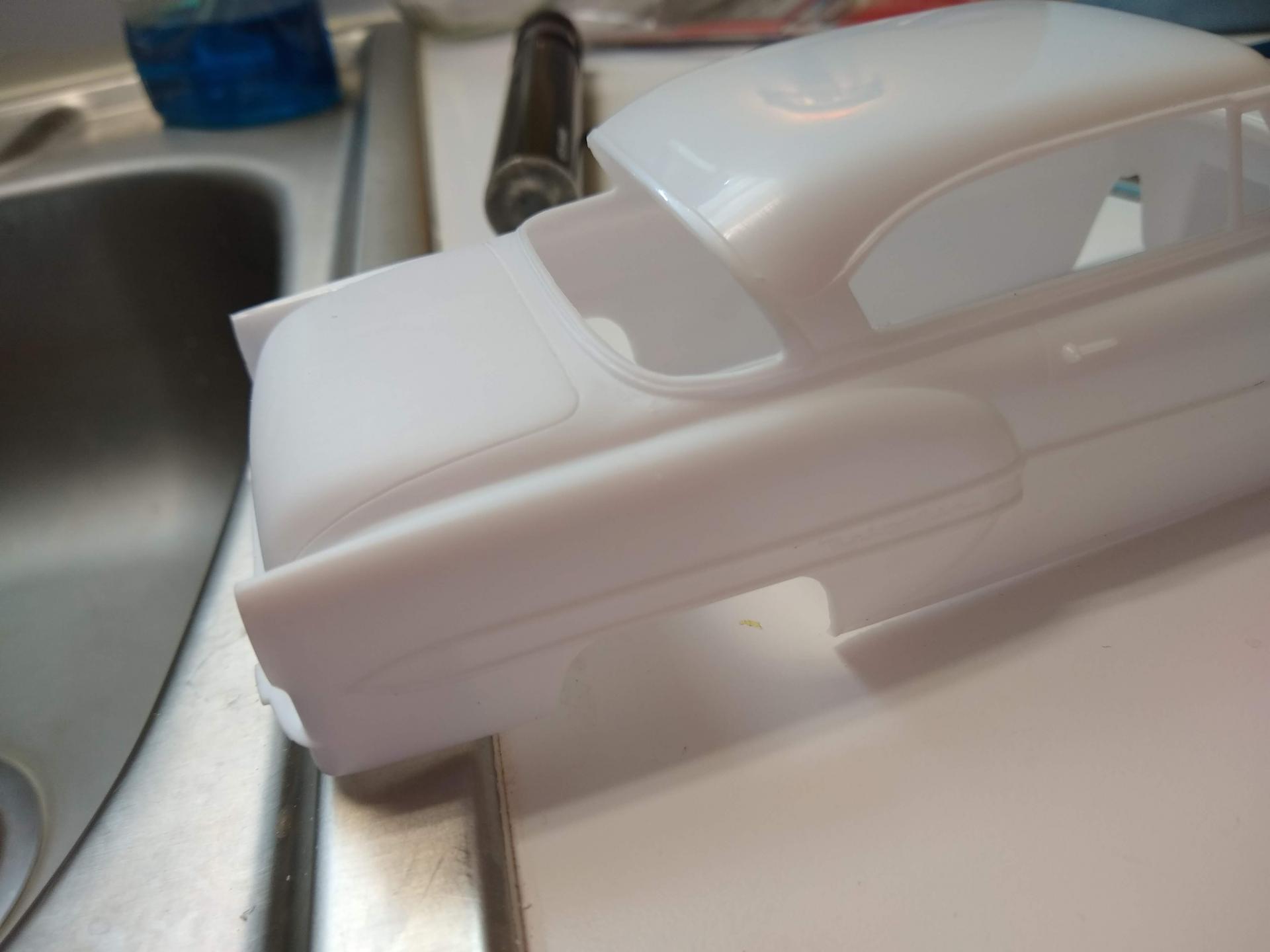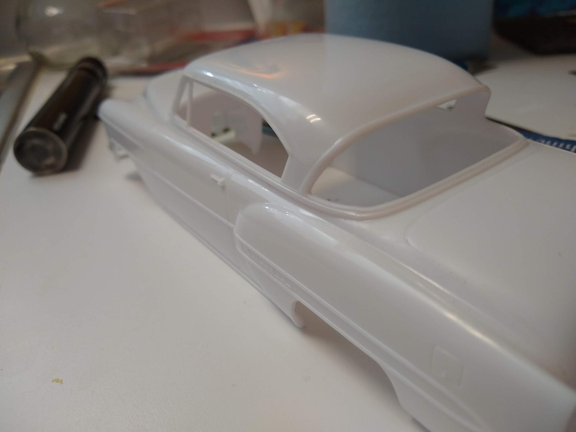 Nothing too exciting here. Just an easier build for me while I'm working on the Lotus for a friend. The Esprit is kinda intense. This should be an easy build of a generation of BelAir/Chevy I don't have enough of. Probably a metallic green with a cream top - not sure on the wheels yet. Maybe the lowered suspension and wide whites? If it will fit. Just opened the box yesterday. Maybe a few Custom touches. Very mild. These photos may not show but the panel lines and trim is all soft as molded. The panel lines are barely there - mostly a guide. Can't imagine painting it this way. So I'm cleaning up the gaps and mold lines and trim edges. I have a couple hours in this so far and haven't progressed beyond the trunklid. Just saying there is alot of cleanup and sharpening to be done. I think this will pay big dividends at the far end of the build. I can't see that far yet. I barely have an idea what color this thing will be. But my goal is to look at least as good as a "mint" diecast. In the phtos, the passenger side is the one with the most work. The driver's side door has had a couple passes with scribing tools (Xacto with a broken tip mostly). Nice square groove. Same blade on past 4 builds. I use dental picks, regular Xacto tip, and a triangular file for the panel lines. Same for hte chrome trim. Mark Gustavson recommended scribing the edges of trim years ago and he's really right - it does help sharpen the edges.