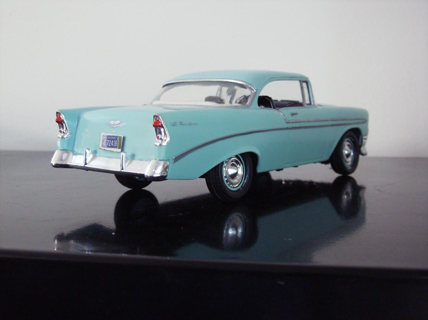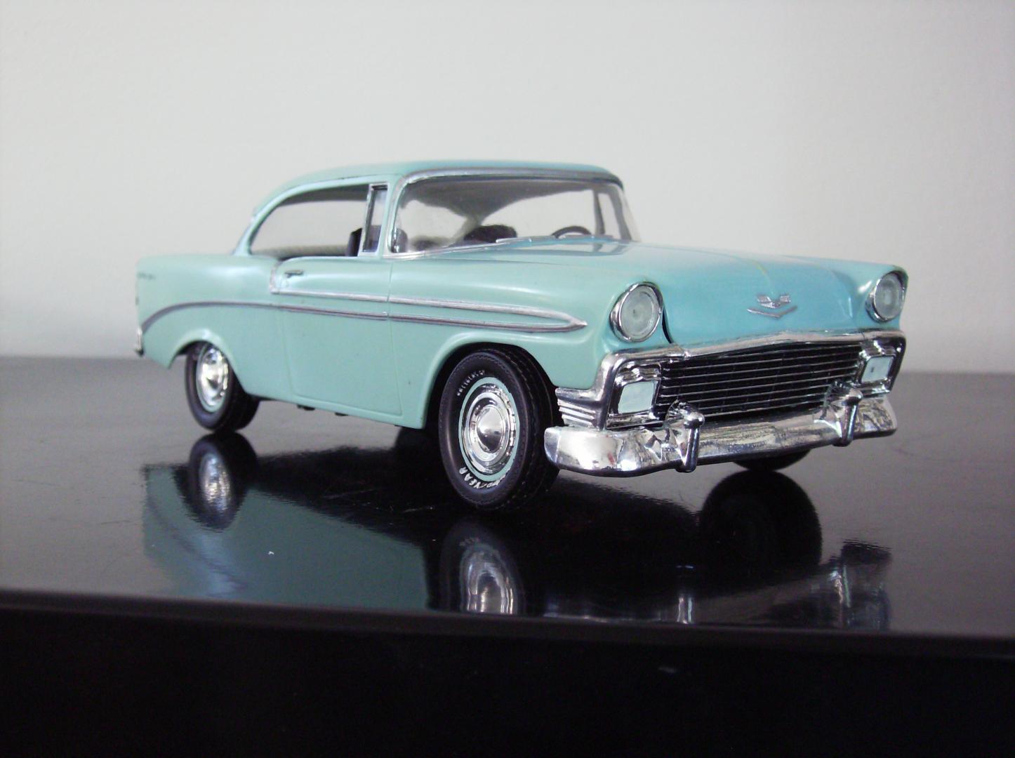 Hallo together, today i want to show you a smooth built from a perfect fitting kit. (My opinion) It is the 1956 Chevy Del Ray from Revell. I had made no changes or detailwork, because my first paintjob (darkred body, silver top) was a fault and so sometimes i'm happy, if a mismatched builtup is ready. Only wiring the engine, thats it. Some Pics: