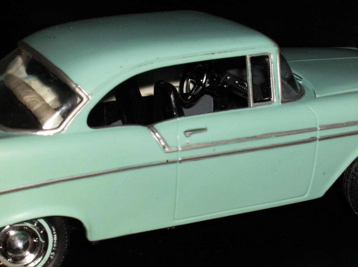 Finally finished this one, after 41 days on the workbench. Paint is Testors One Coat White Lightning Pearl. Lucas "Flame Thrower" headlights from the AMT 55 Nomad kit. Custom Lenses from the 53 Studebaker kit. Scratchbuilt steering column and turn signal lever. Shifter made from a straight pin. Bucket seats from the AMT 53 Corvette. Vertex magneto from the 57 chevy kit, Plug wires have correct firing order. Scratch built fuel log and gas line. License plate made in Photoshop that says "Cristi" - my wife's name. And yes, she is quite pleased with her belated Christmas present. Off the bench and on the shelf! Since I'm in here, a few new bonus photos... Here is a link to the build process... http://www.modelcars...o=new_post&f=18