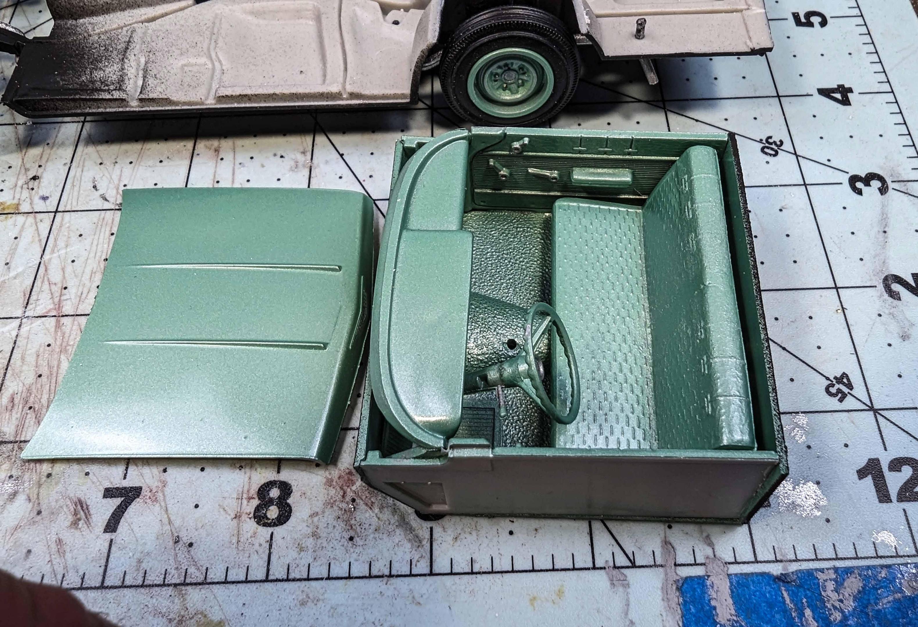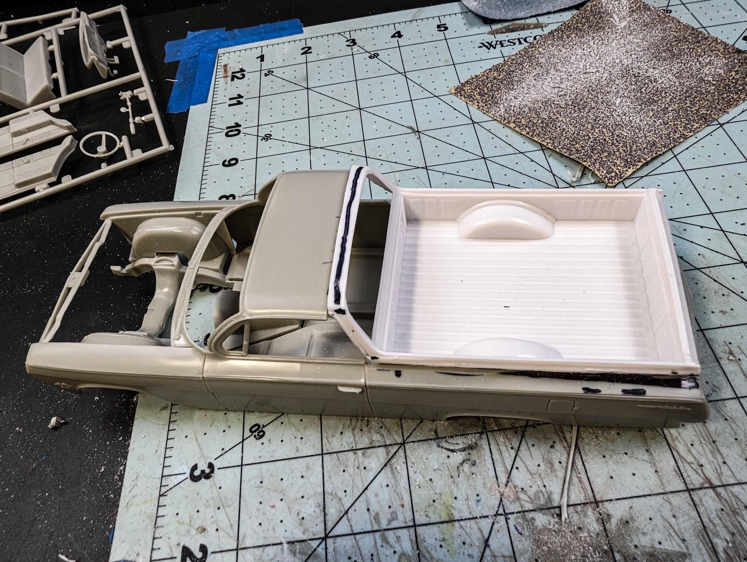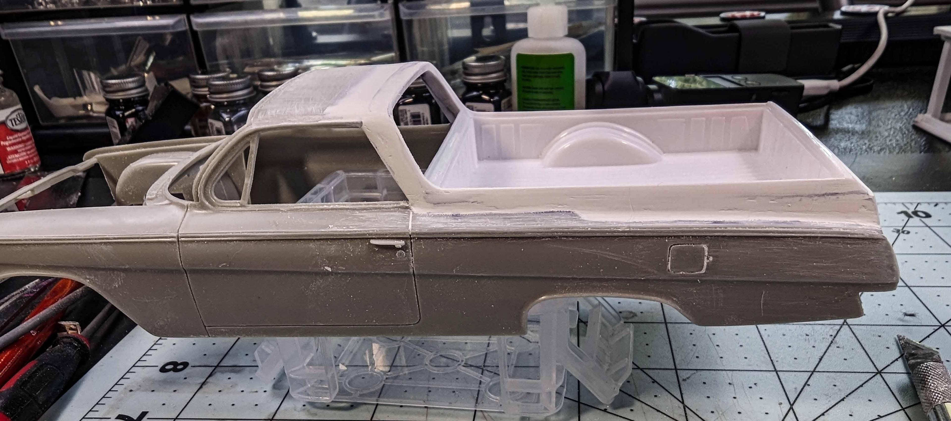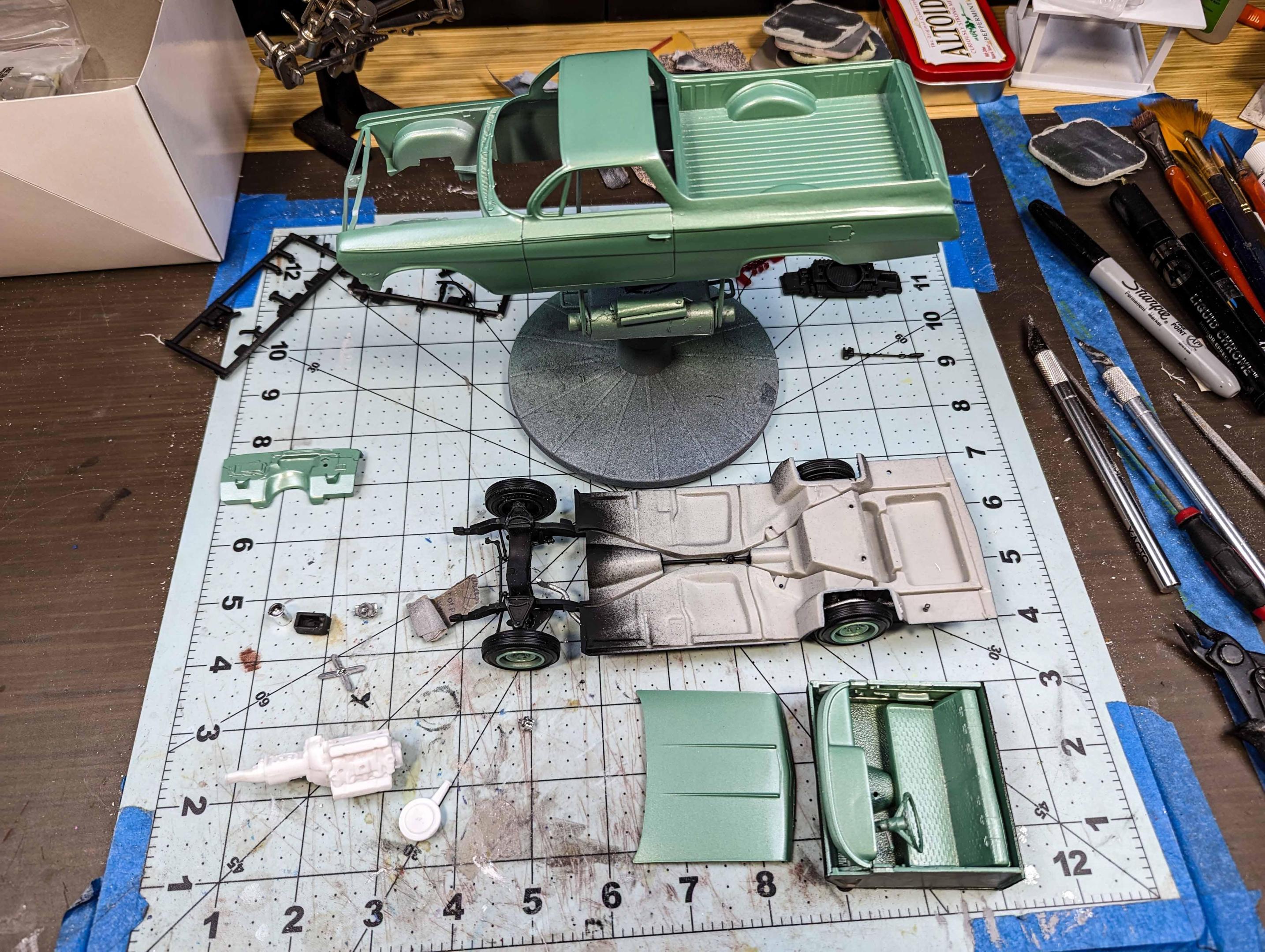 Many years ago, I built my version of a model of a 1962 Chevrolet El Camino. There were some glaring issues with the model, so I'm beginning a new version. By the time that I'm starting this thread, I already have a good start on the project, but I'll include early pictures too. These two kits are the starting subjects. There was considerable slicing and dicing. The fitting begins. That's a large gap to fill, but I have lots of plastic pieces. She's not going to win any beauty contests at this stage, but the gaps are filling in. It looks rather anticlimactic, but that was a lot of hours of filling and sanding. The next stage is painting. Some assembly has been accomplished as well as painting. The interior was quite straight foreword. I chose to use Tamiya's TS-60 Pearl Green to represent Chevrolet's Surf Green.