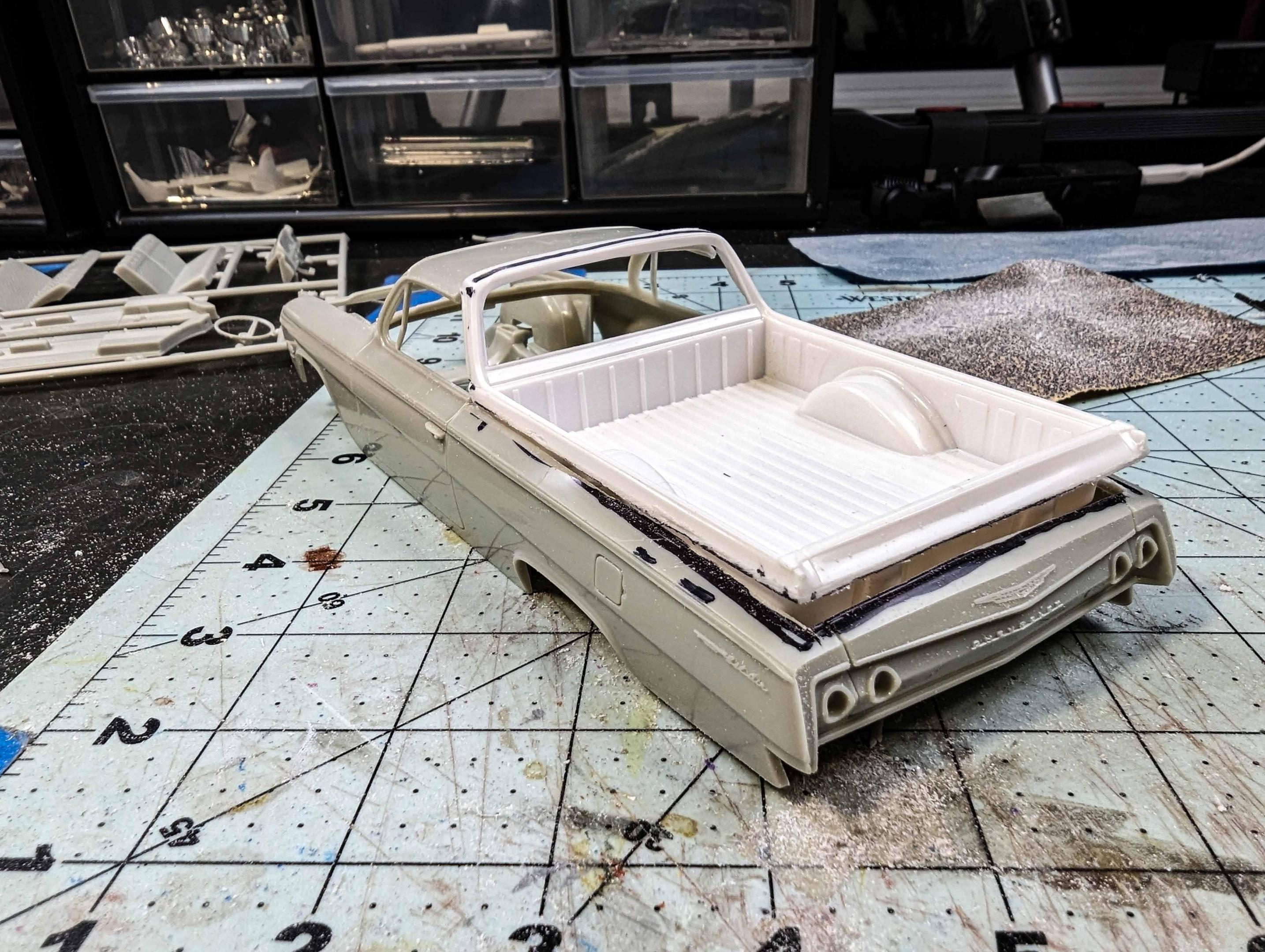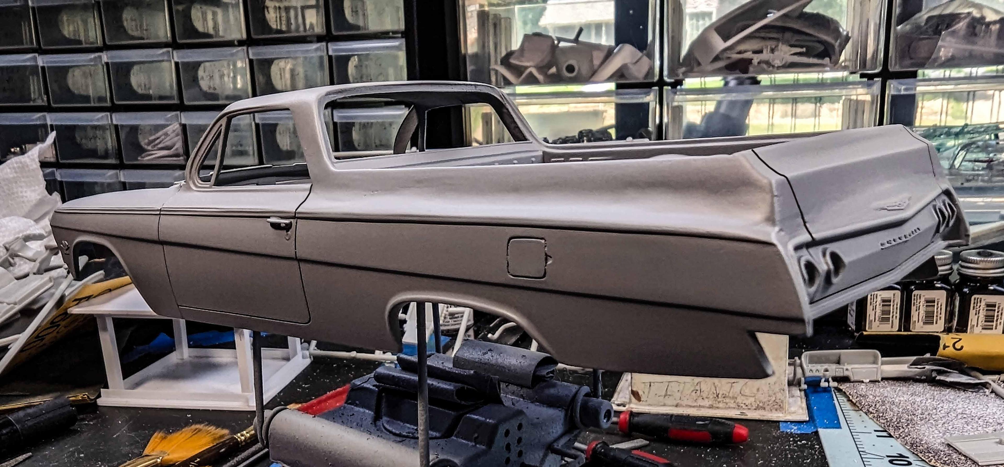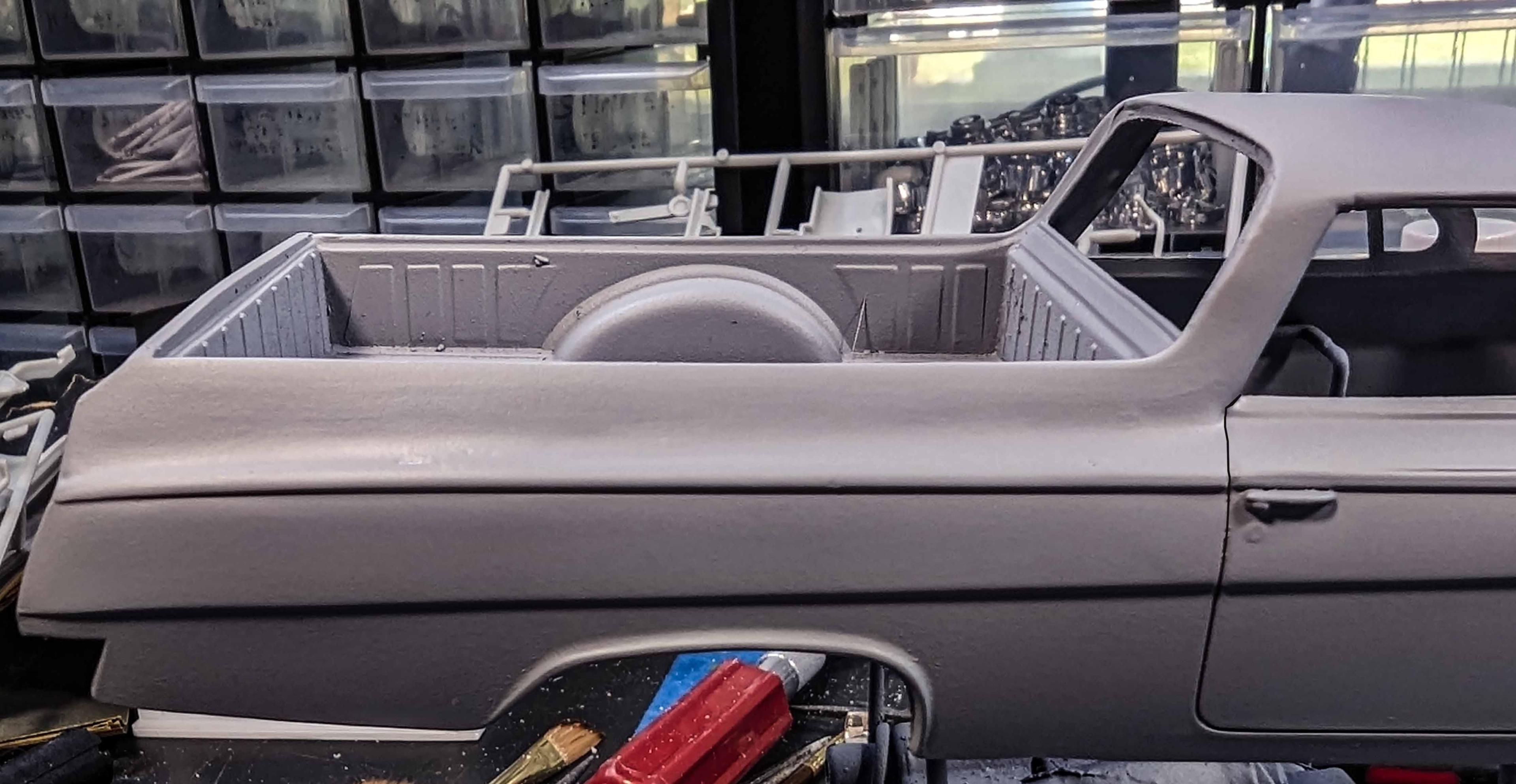 Many years ago, I built my version of a model of a 1962 Chevrolet El Camino. There were some glaring issues with the model, so I'm beginning a new version. By the time that I'm starting this thread, I already have a good start on the project, but I'll include early pictures too. These two kits are the starting subjects. There was considerable slicing and dicing. The fitting begins. That's a large gap to fill, but I have lots of plastic pieces. She's not going to win any beauty contests at this stage, but the gaps are filling in. It looks rather anticlimactic, but that was a lot of hours of filling and sanding. The next stage is painting. Some assembly has been accomplished as well as painting. The interior was quite straight foreword. I chose to use Tamiya's TS-60 Pearl Green to represent Chevrolet's Surf Green.