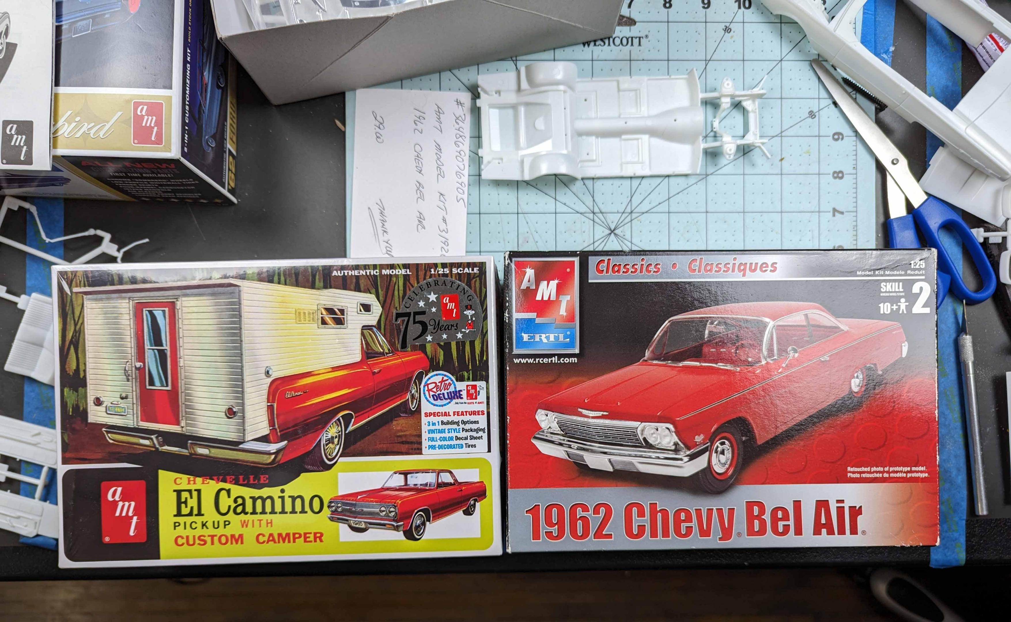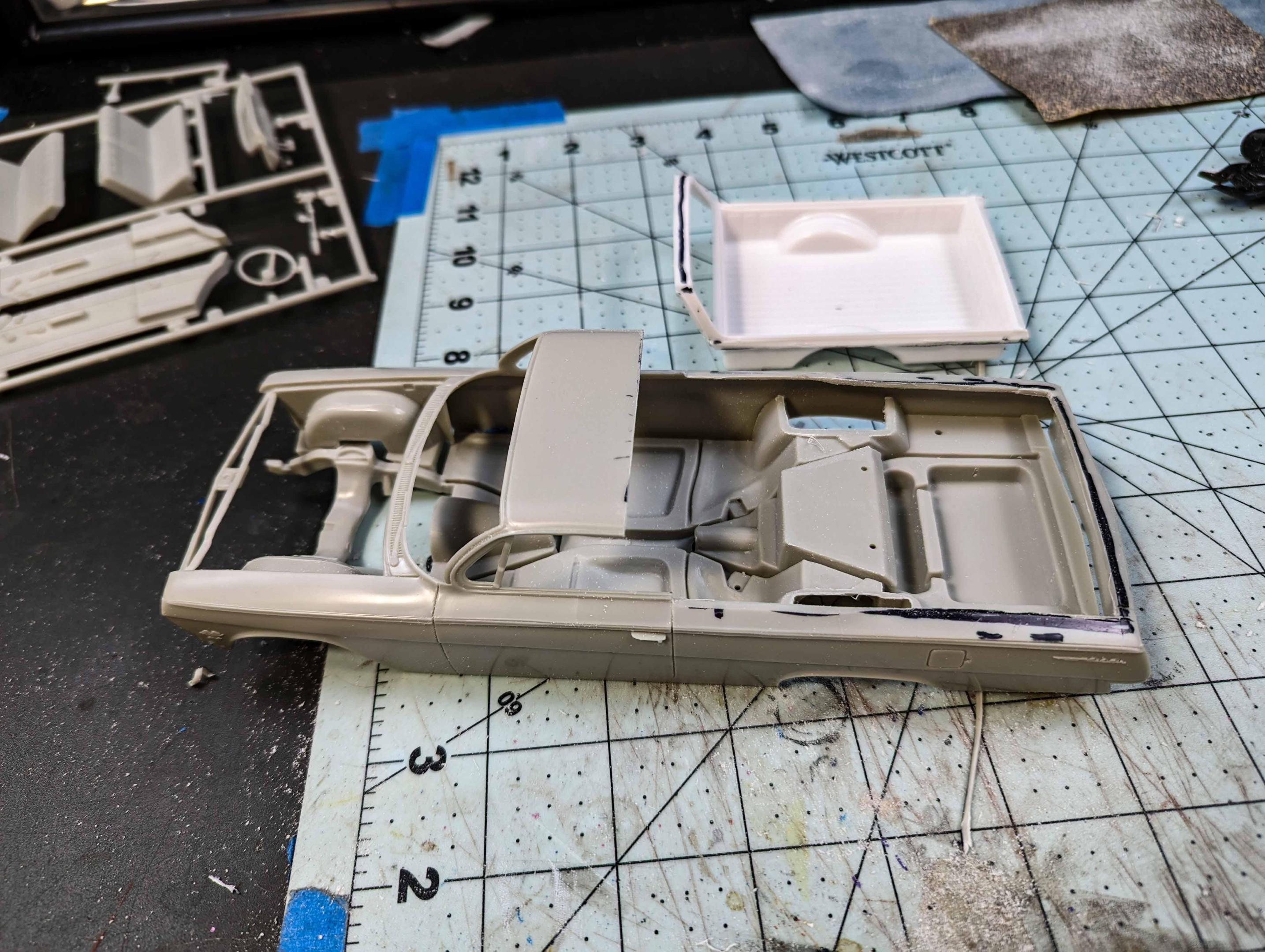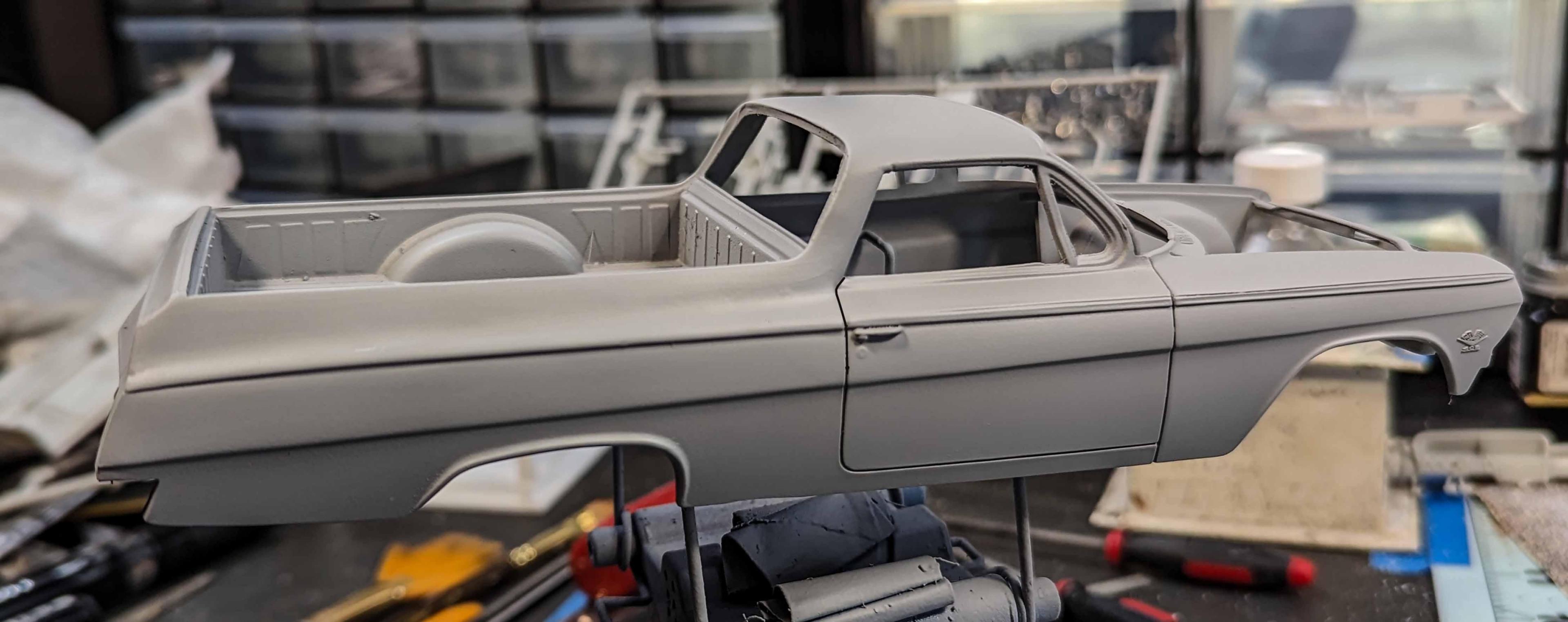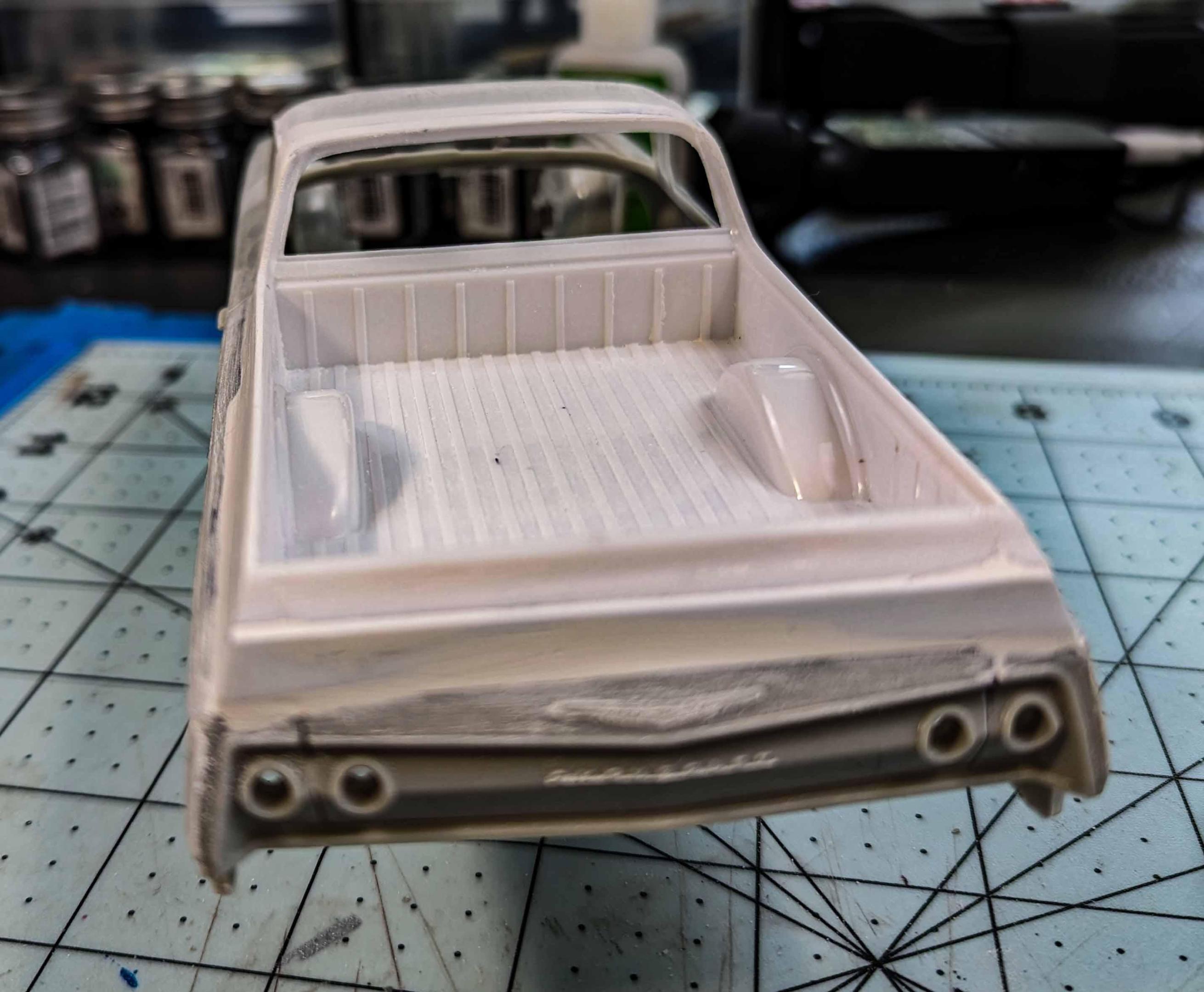 Many years ago, I built my version of a model of a 1962 Chevrolet El Camino. There were some glaring issues with the model, so I'm beginning a new version. By the time that I'm starting this thread, I already have a good start on the project, but I'll include early pictures too. These two kits are the starting subjects. There was considerable slicing and dicing. The fitting begins. That's a large gap to fill, but I have lots of plastic pieces. She's not going to win any beauty contests at this stage, but the gaps are filling in. It looks rather anticlimactic, but that was a lot of hours of filling and sanding. The next stage is painting. Some assembly has been accomplished as well as painting. The interior was quite straight foreword. I chose to use Tamiya's TS-60 Pearl Green to represent Chevrolet's Surf Green.