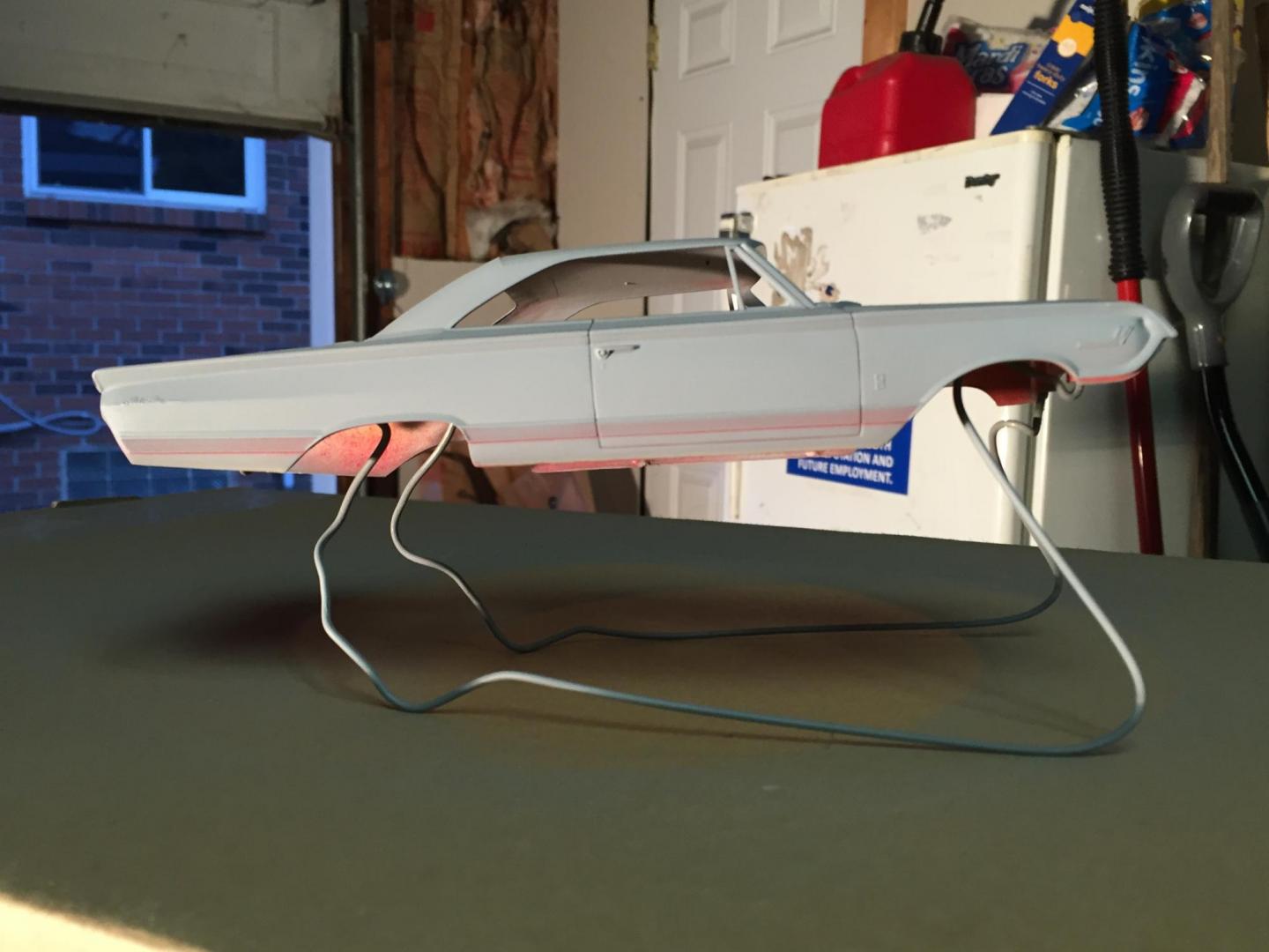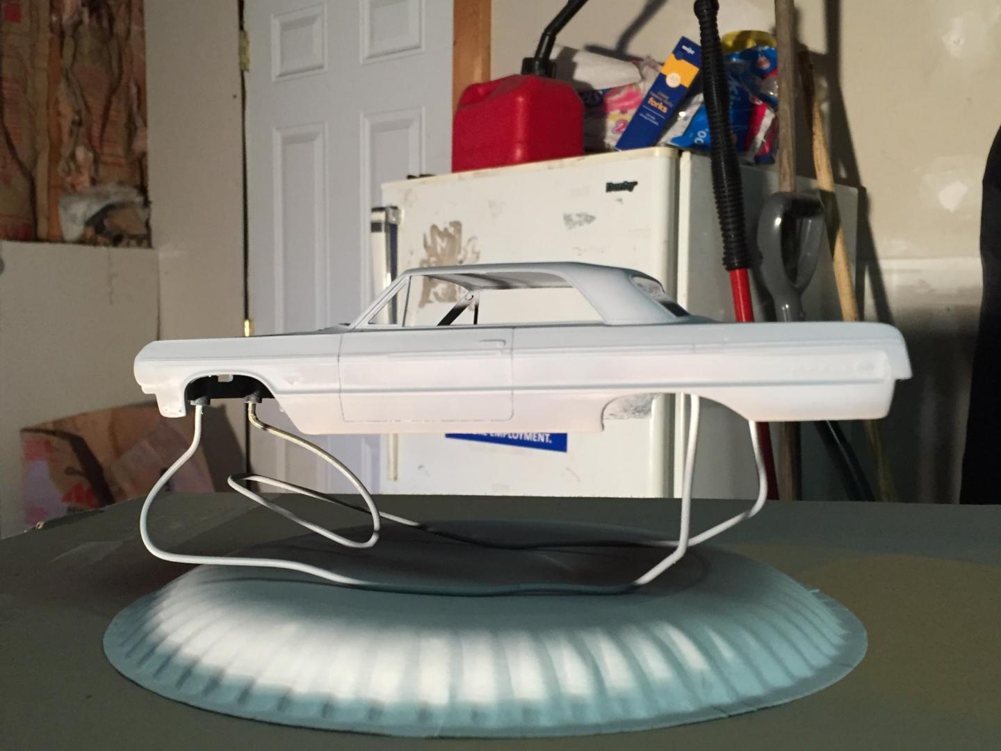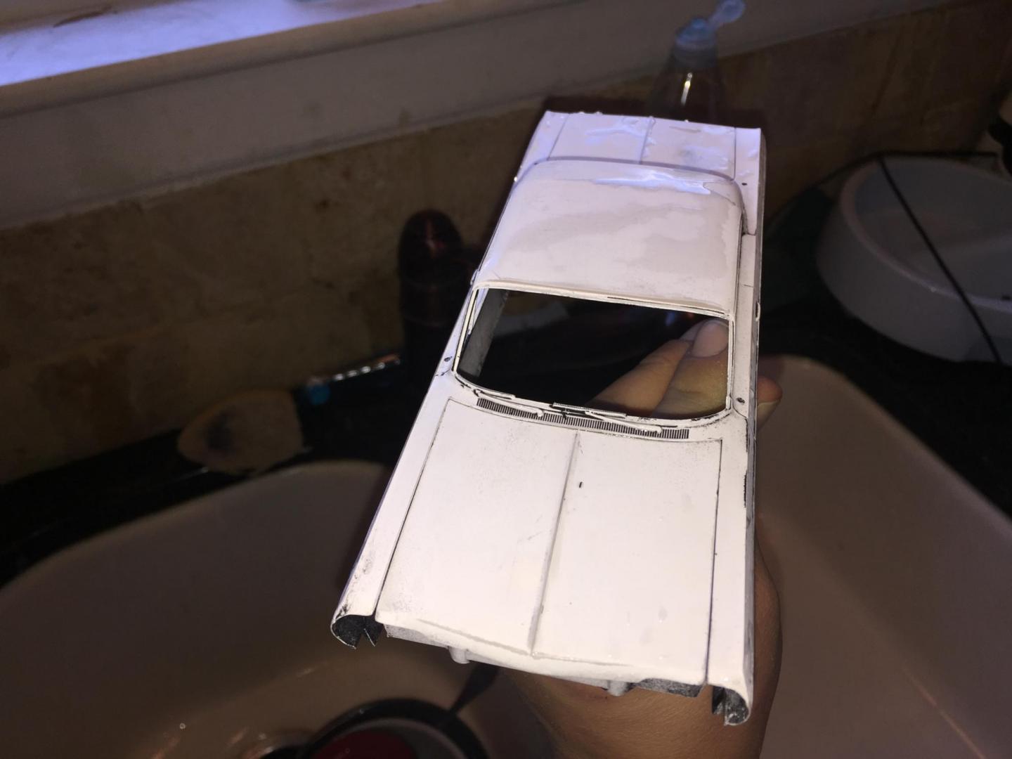 I was almost finished with the paint on this car and made some pretty dumb mistakes. This was the first car I chose since getting back into the hobby. She spent a few days in the purple pond and then Dawn Detergent and water. I've decided to spray Duplicolor Primer/Sealer to hopefully ensure that I don't have ant issues from the previous work. I'll sand her down tomorrow and shoot the second coat. Then it'll be time for Duplicolor Universal Black! I'm posting from my iPhone and it isn't very friendly with the text box and adding attachments. Here's some before and after and then after the strip down pictures. After those are photos with the new primer.