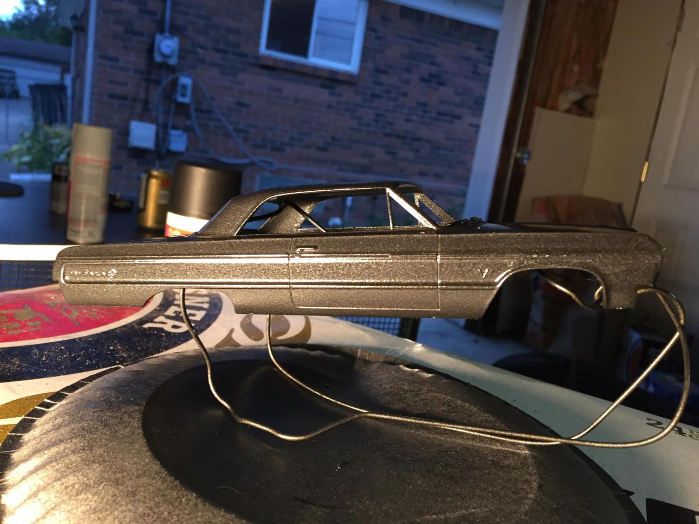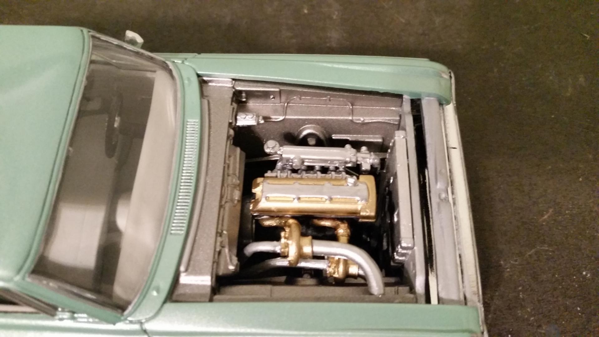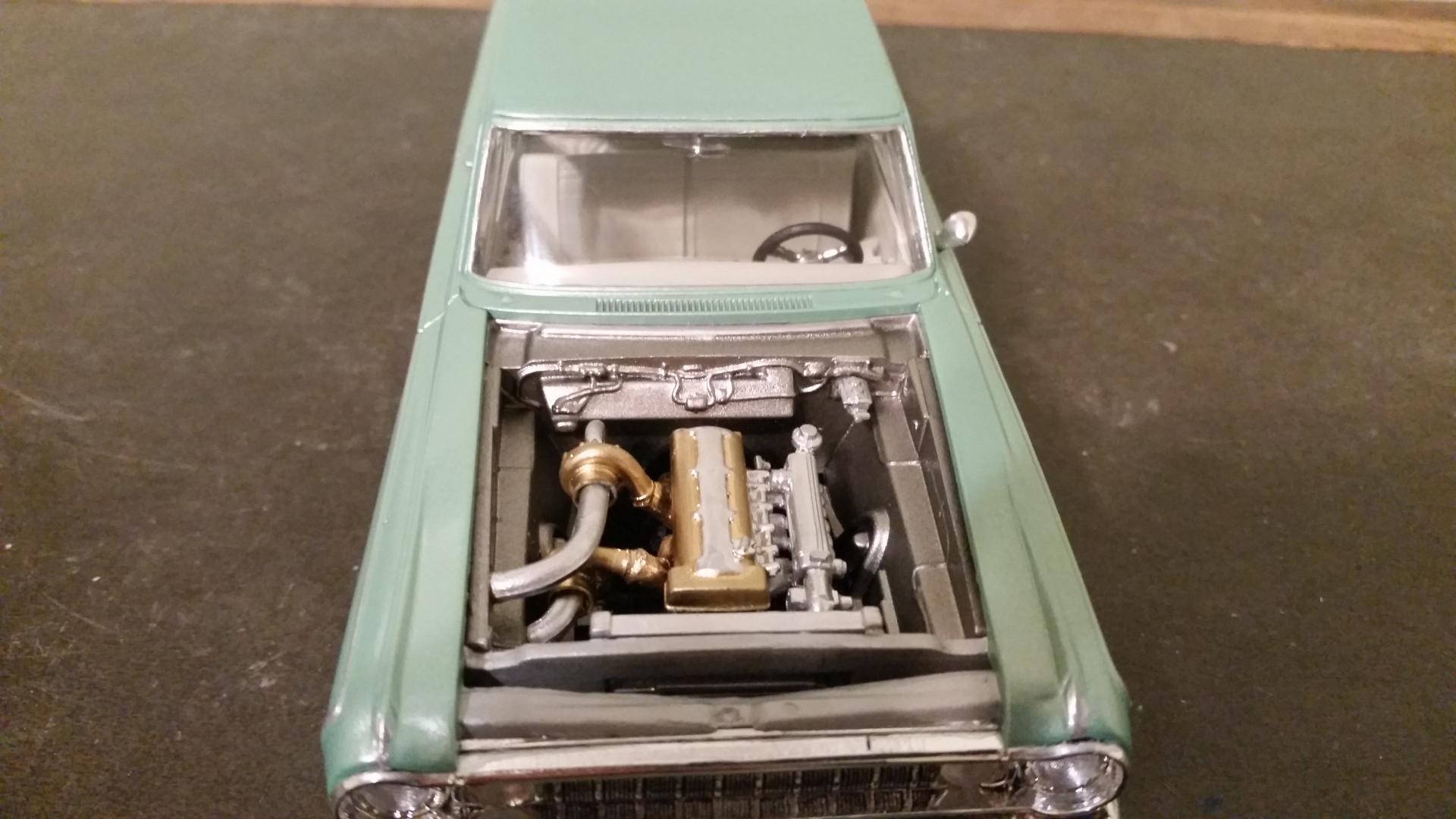 My latest project, a Revell '64 Impala SS done as a street machine. I am taking the engine and tires/wheels from the AMT 68 El Camino Street Machine kit and transporting them onto the Revell Chevy. I am going to use the lowered suspension for this build. The tires are big and littles so I will have a rake once it's done. Color I think will be Mythical Maroon. 396 Big block with street blower from El Camino kit. I'm still in the process of building the engine. Tires, wheels, from El Camino kit with headers from AMT 70 Impala kit. I had to move the transmission crossmember back for proper alignment of the engine.
