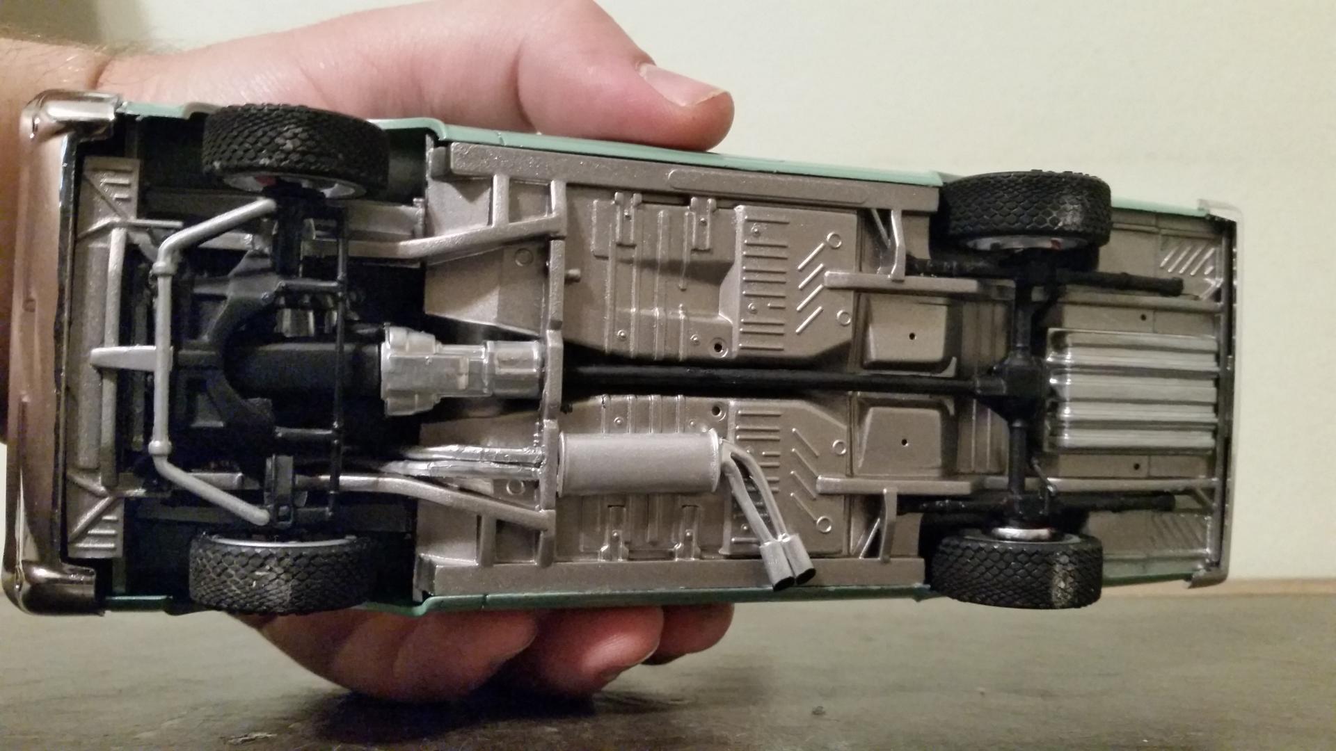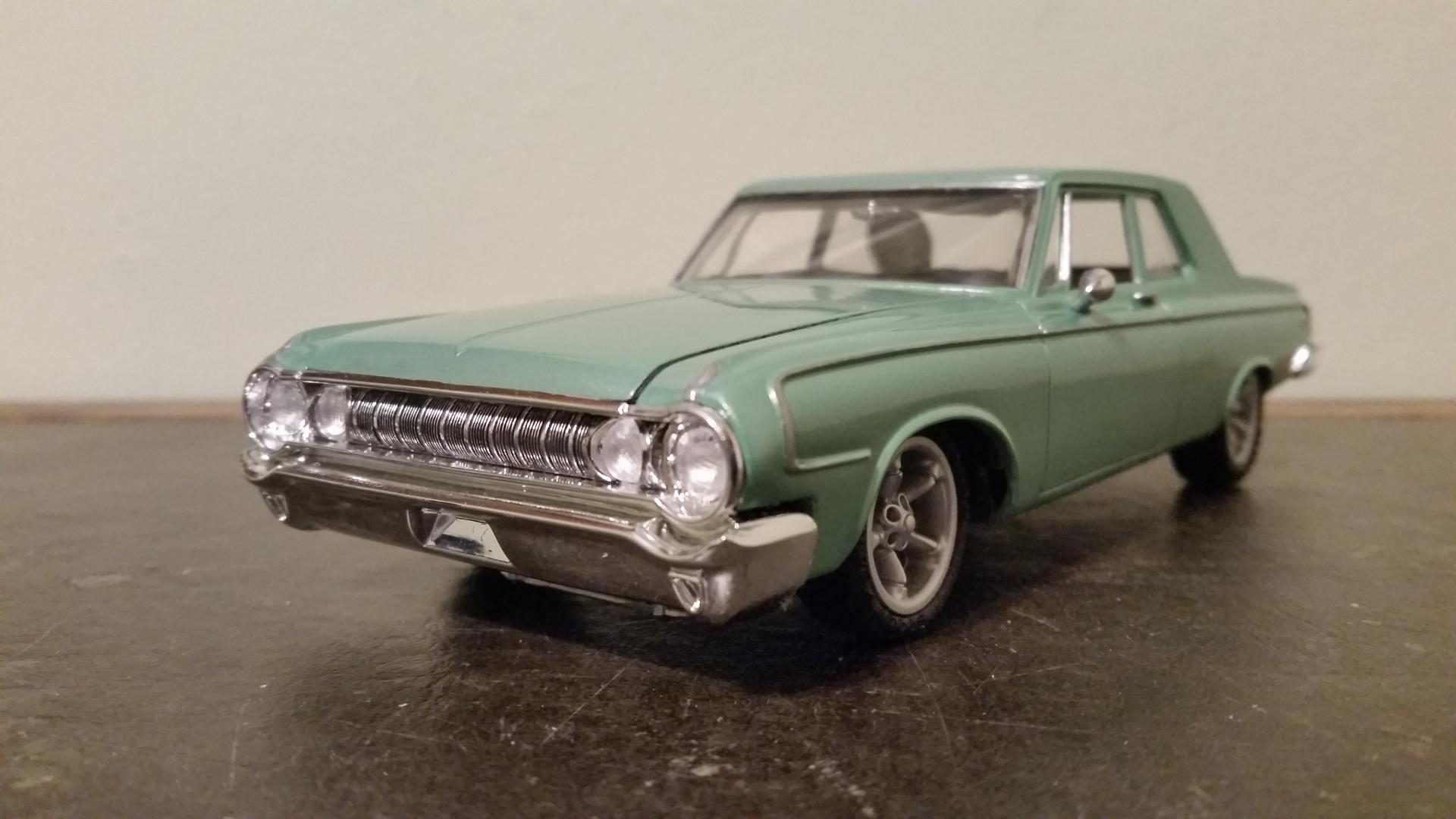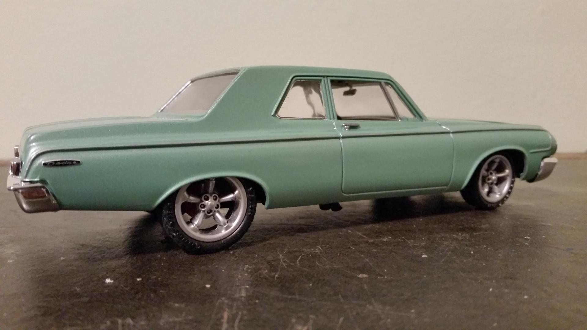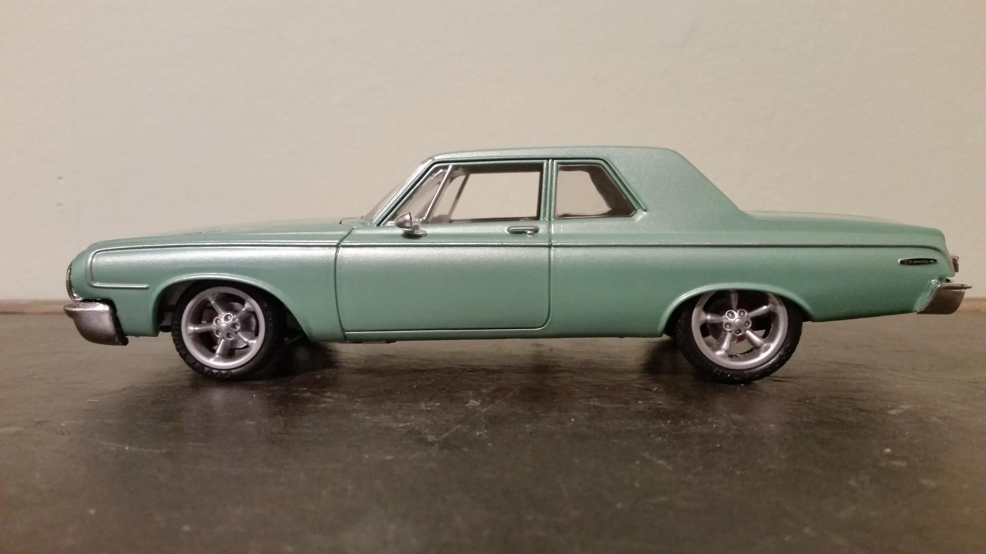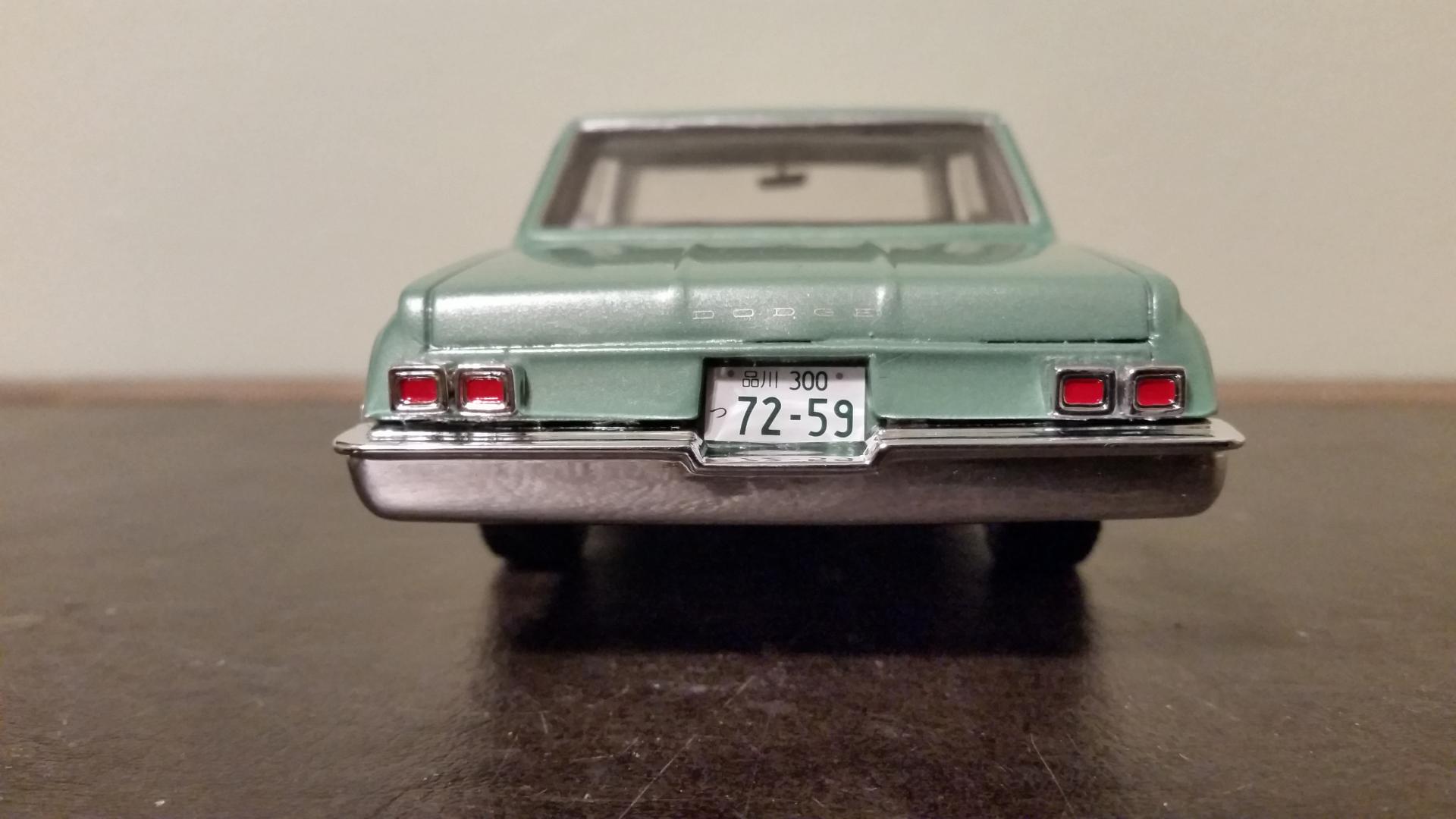 I understand this isn't for the faint of heart Mopar nuts and some of ya are gonna spout out "YOU PUT A WHAT IN THAT POOR OLD DODGE?!". But, since the 330 had a slant six on the base models this combo pays a modern homage to those slant sixers with a twist. This was the AMT boxed Lindberg kit i got on markdown for $7.50 at HL, and since I rarely do things OOB I brainstormed some customizing ideas on what to do with it. I found a resin 2JZ and resin turbos that a friend gave me a while back in my stash and that got the spark going for my next project on top of a closet full of kits i plan to chip away at. Interior is Testors light gray rattle can and basically OOB, added a dash gauge cluster piece (from a Revell pro stock of some sort) and a 57 'Vette steering wheel with a custom stick on the steering column to replicate a shiftier on the wheel type config. 2JZ resin motor has resin twin turbos mounted on modified headers from a Ferrari Boxer 12, plastic tubing as intake pipes, and a custom side exhaust made from a Mustang muffler and Lamborghini exhaust tips. Cadiator from a AMT Dodge Viper, and suspension is pretty much stock but added new drive shaft to go to 2JZ tranny and modified engine mounts on suspension and transmission brace. Wheels and tires are from a AMT Dodge Concept Car builder (that looked as some child did his/her own "crash testing" as it's body all broken, but wheels were intact for only $1). Paint is Tamiya TS-60 Pearl Green cleared with Pledge, and the frame is Krylon Stainless Steel Finish. I also added a Japanese Licence plate from a Aoshima Skyline of some sort because why not. To those who appreciate homages, I hope you enjoy!