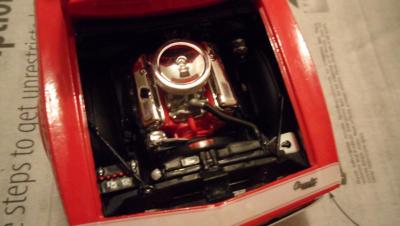 Built this as a gift for a friend, whose daughter is in the Naval Academy. They love Corvettes, I asked what her favorite color is, so tried to match it. It was a free kit, was brush painted, and no engine. I had an engine from a '39 Chevy model done last century. I didn't know the engine was 1/24 scale, until it wasn't fitting! Had to thin out the tunnel until it was paper thin. So I guess it's a 507. LOL I wasn't happy with the paint in some spots, needed to sand and primer as if it's been repaired. The steering wheel is from the parts box, hub is from the decal for the hood spear. I made the antenna retractable. I made a box for it. Got a ribbon at the county fair, just because. It's wired to a Corian base, the wood supports hold it down. Her name is Sarah. GO NAVY!