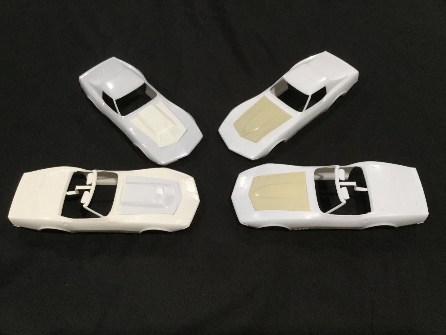 I have always felt that Revell’s 1968 and 1969 Corvette kits captured the look and feel of that C3 body style the best. My only beef with this kit is that the rear window is incorrect. But I don’t feel the need to correct all of them. Maybe just the replicas of my father’s car. Over the years, they have been offered in many different variations. The 68 has been offered as a convertible only. A couple times with the “rare” small block hood. Oddly, I never cared much for the big block 427 hood. I did like the L88 hood much better. I may be biased because my father has an aftermarket L88 hood on his 69 Corvette. Here is an assortment of just some of the issues of these cars. It is not by any means all of them. Since the 68 was only offered as a convertible on 69 only offered as a hardtop, I will be swapping parts from one to the other to make the missing links. The 68 hardtop is currently in prime at work. And may be in paint by tomorrow night. 69 convertible is also there and will probably be in prime tomorrow. Two of the cars are earmarked to replicate my father‘s car. The first one will be a medium blue metallic with a small block hood in place, and the rally wheels that came with it. The second one will have the L88 hood and American Racing Vector wheels that are currently on his car. All in all, there should be at least six builds in this thread along. Probably more! Lord knows I have enough kits. Can anybody really say that? Anyway, here is four of the first six. Correcting the small block hood was a bit of a challenge to make correct, or at least to my standards. I bought one off of eBay that somebody had resin cast a few years ago. To say the least it was horrible. For some unknown reason they sanded down the front and rear of it. It fits like garbage. And that’s being kind. The hood out of the box has a depression in the middle of the insulation on the underside. This was so you could cut out a giant rectangle for a blower to stick through the hood. On a convertible? Really? Is that a thing? I know, I’ve seen it. But it looks real dangerous! Anyway, the seller made a halfhearted attempt to fill that area but it was still smooth. So I did my best to fill that area with a section from an extra hood so that it would have the insulation texture. I don’t think it came out too bad. So I made a mold and cast more of them in resin. I resisted the urge to sand down the front and back of them like the other guy did! LOL! I think it came out pretty well! That’s it so far. I’ll take some more pictures of the other two at work tomorrow. Questions and comments always welcome good or bad!