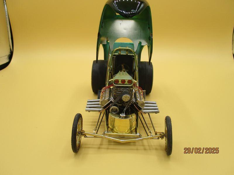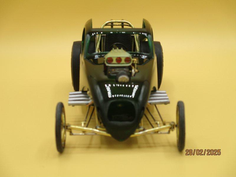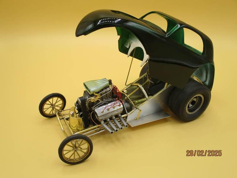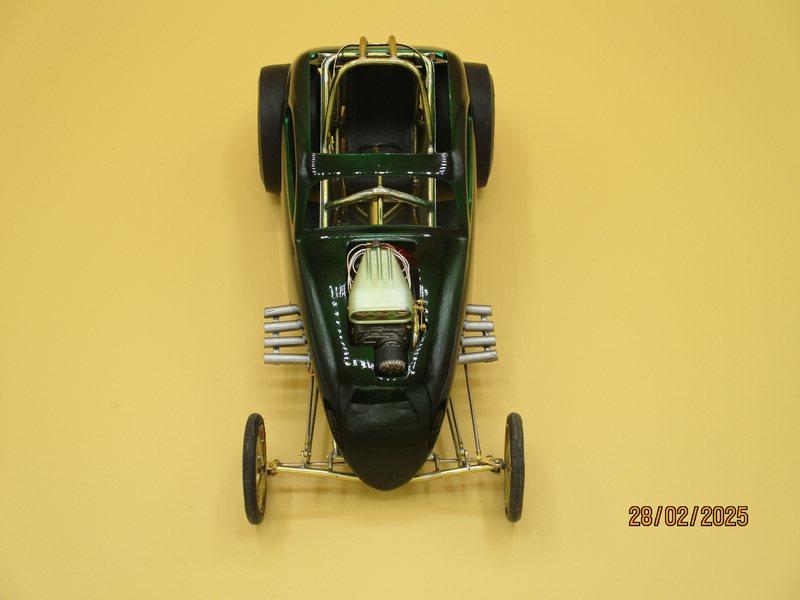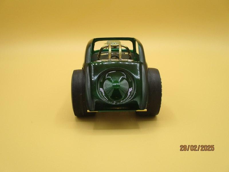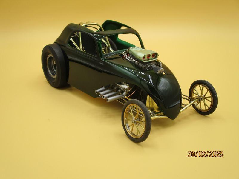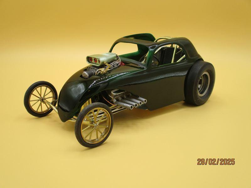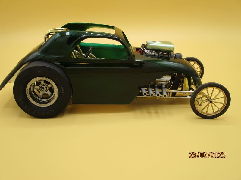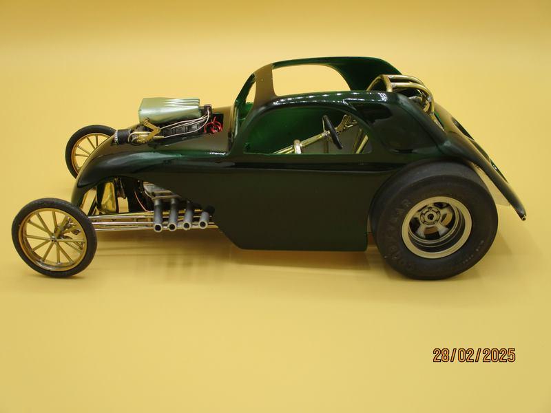 Time to show the finished Fiat. Paint is House of Kolors, blue candy over gold base = nice, deep green. Clear coat has intensive green modifier to add depth. Blower hat has only clear w/ modifier. Many, many coats here. Thanks for viewing. Mike..
