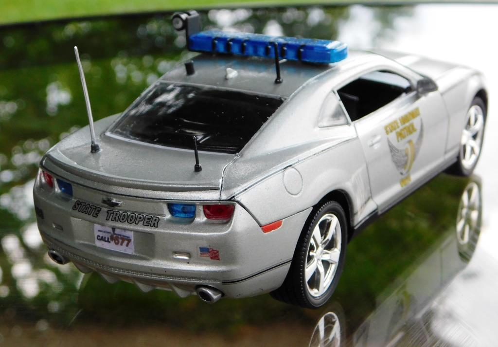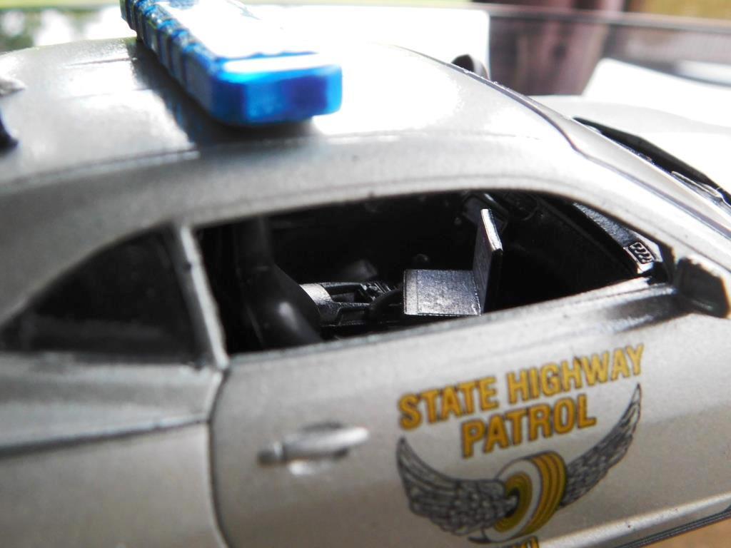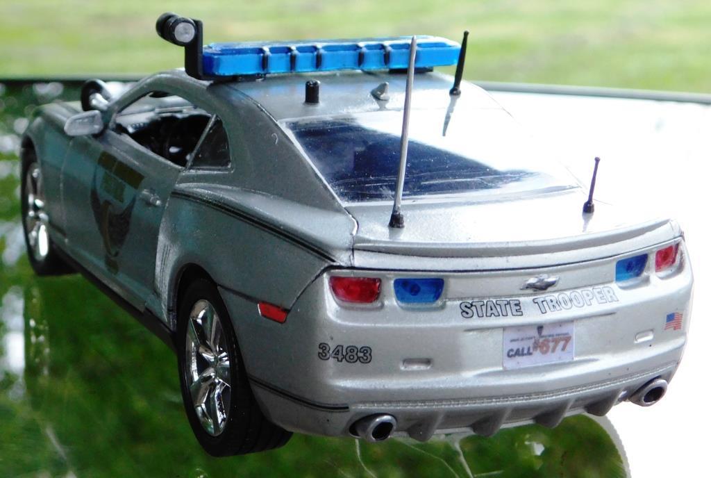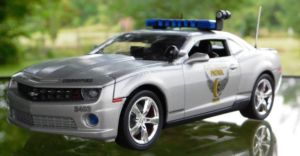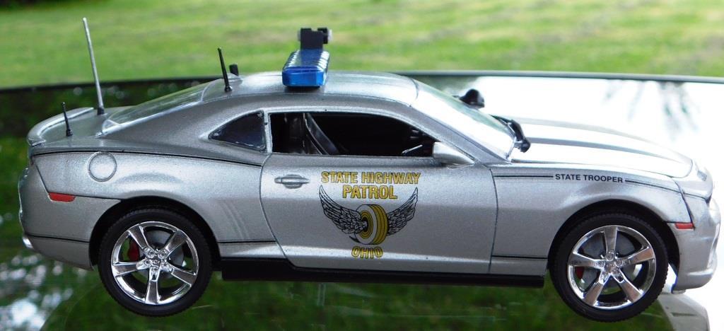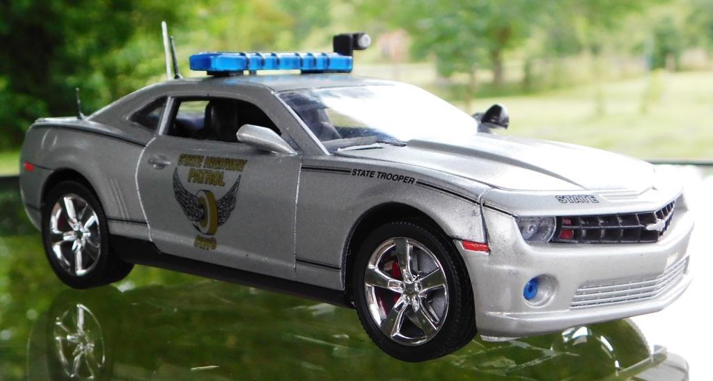 Got this 2010 Chevy AMT Showroom Replicas Camaro kit from eBay a long time ago and final had a cool idea. I ordered the decals from Bill Bozo and painted the car with German Silver metalic. The decals are top notch and well worth the almost month long wait. Took some artistic license in placing the decals on the front. The words could not be placed together as they are in the Chargers because of the vent on the front. Took a bit of artistic license with the blue interior tail lights. Found a "Call #677" plate and scaled it down. The two antennas on the drivers side are custom built, while the ones on the passenger side I found in a box or spare parts. You can see the radar display mounted to the dash behind the windshield. The radar itself is made from various sizes of styrene with pieces of clear sprue in each end. The spotlight is made from a head light from a '29 Ford Roadster. I made the computer out of a piece of styrene in which I printed a screen and keyboard then attached it to a piece of round styrene and attached it to the center console. Hard to see in this picture, but there is a custom CB radio in the center console, just in front of the cup holder. Caught some young whipper snappers out driving their '66 El Camino on the back roads. Thank you for looking.