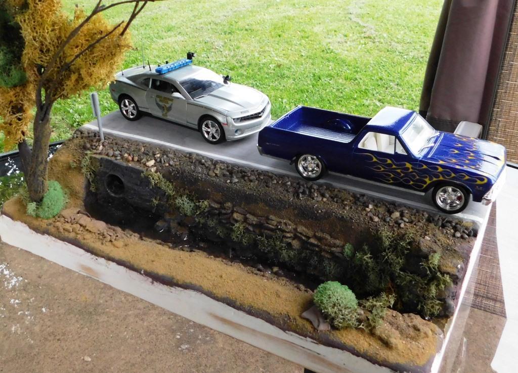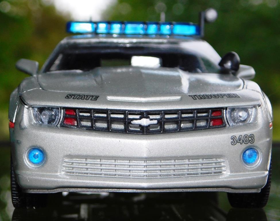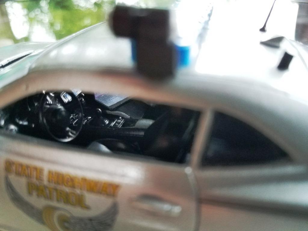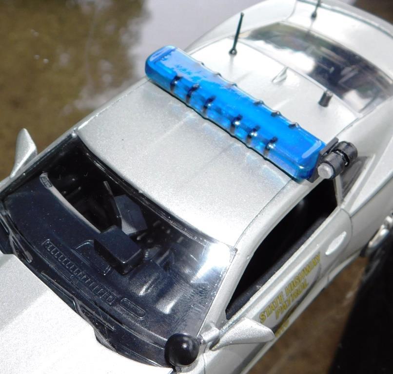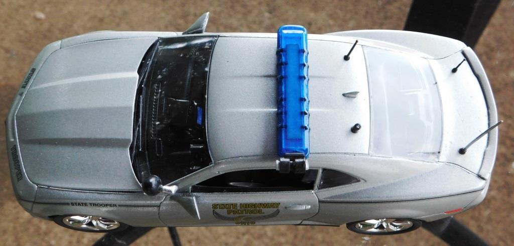 Got this 2010 Chevy AMT Showroom Replicas Camaro kit from eBay a long time ago and final had a cool idea. I ordered the decals from Bill Bozo and painted the car with German Silver metalic. The decals are top notch and well worth the almost month long wait. Took some artistic license in placing the decals on the front. The words could not be placed together as they are in the Chargers because of the vent on the front. Took a bit of artistic license with the blue interior tail lights. Found a "Call #677" plate and scaled it down. The two antennas on the drivers side are custom built, while the ones on the passenger side I found in a box or spare parts. You can see the radar display mounted to the dash behind the windshield. The radar itself is made from various sizes of styrene with pieces of clear sprue in each end. The spotlight is made from a head light from a '29 Ford Roadster. I made the computer out of a piece of styrene in which I printed a screen and keyboard then attached it to a piece of round styrene and attached it to the center console. Hard to see in this picture, but there is a custom CB radio in the center console, just in front of the cup holder. Caught some young whipper snappers out driving their '66 El Camino on the back roads. Thank you for looking.
