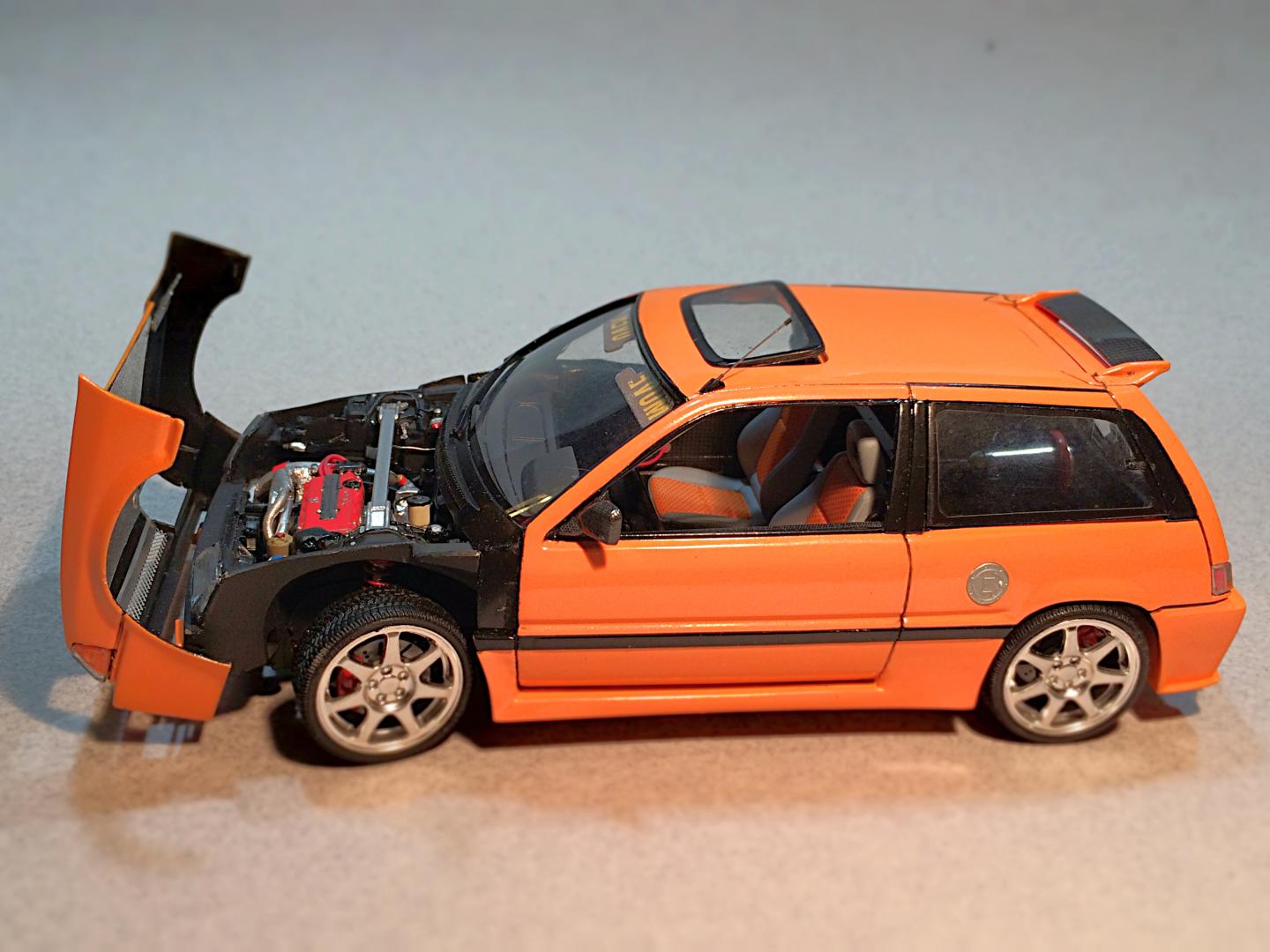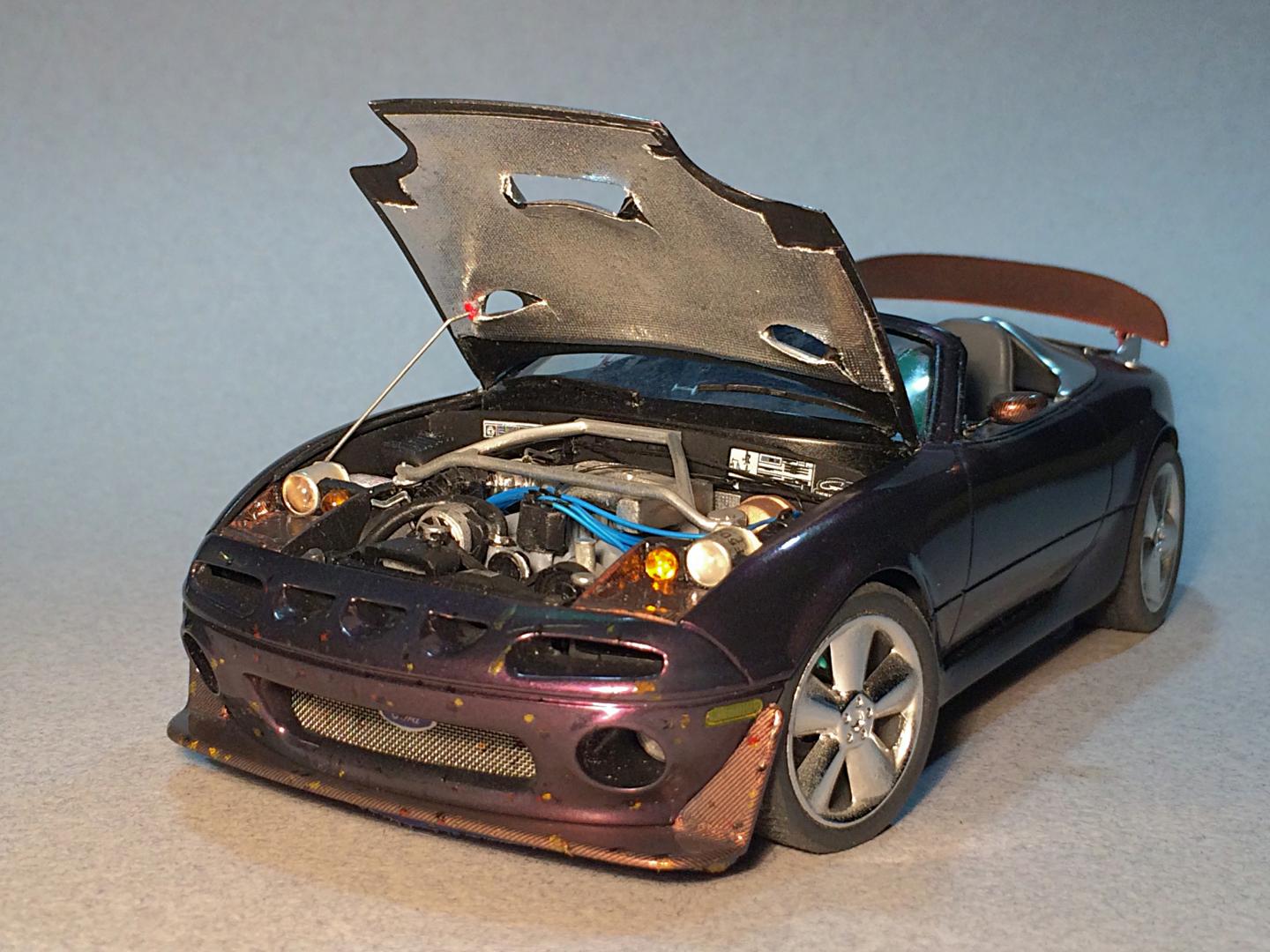 Porsche 959, Tamiya. Started December 2001. Monster Miata 5.0L, Tamiya/other. Started March 2001. Honda Civic "SiTEGRA", Tamiya/other. Started 2002. Ford Victoria, AMT. Started and finished within two weeks. Mercedes 170V Roadster, Heller. Started and finished within two months.