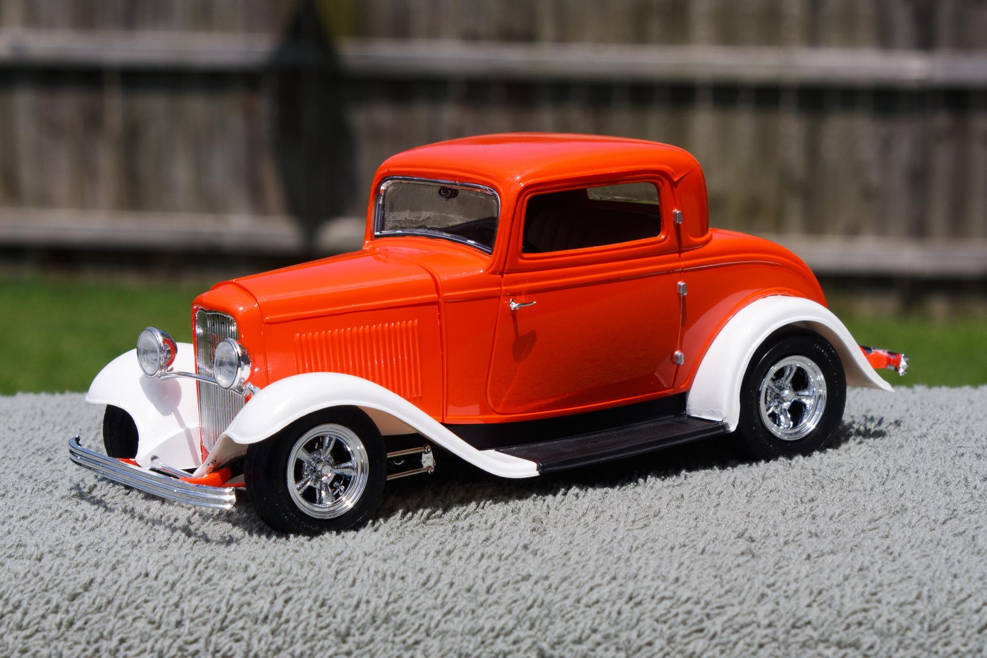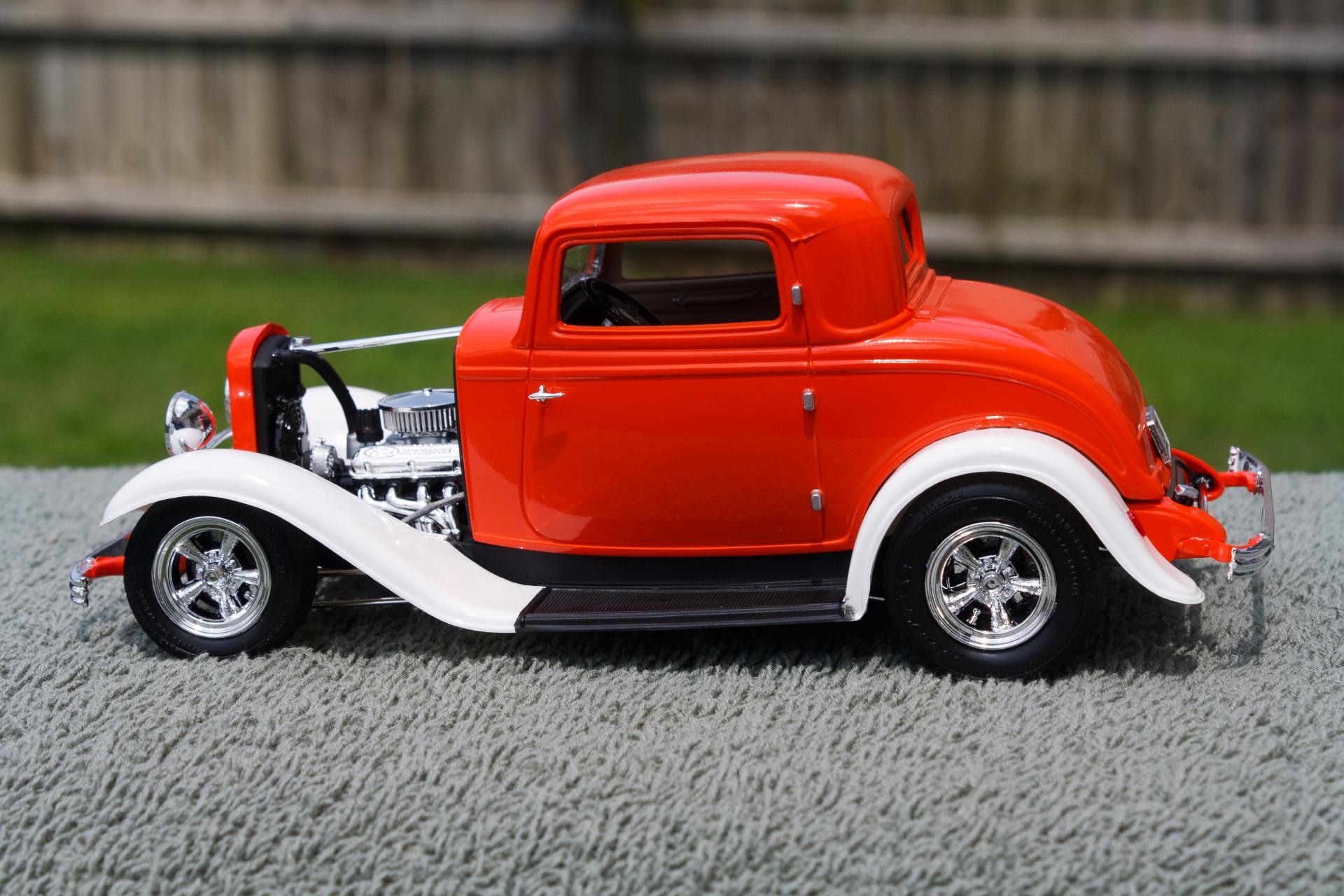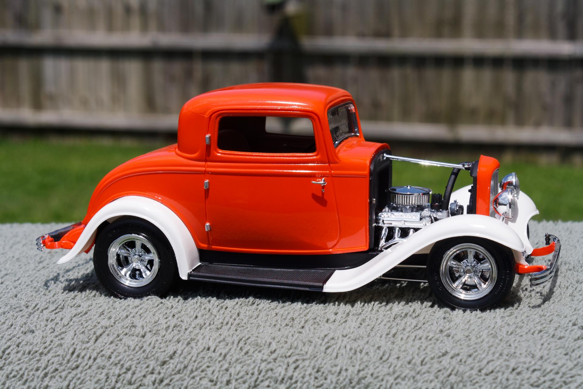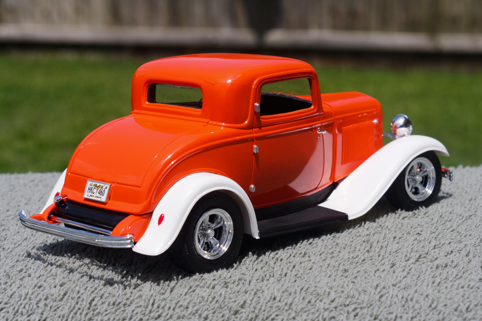Just finished this '32 Ford 3-Window Coupe kit made by Revell Monogram. The white fenders were a little nod to the Ramblin' Wreck from Georgia Tech, with an orange body instead of gold. Enjoy!