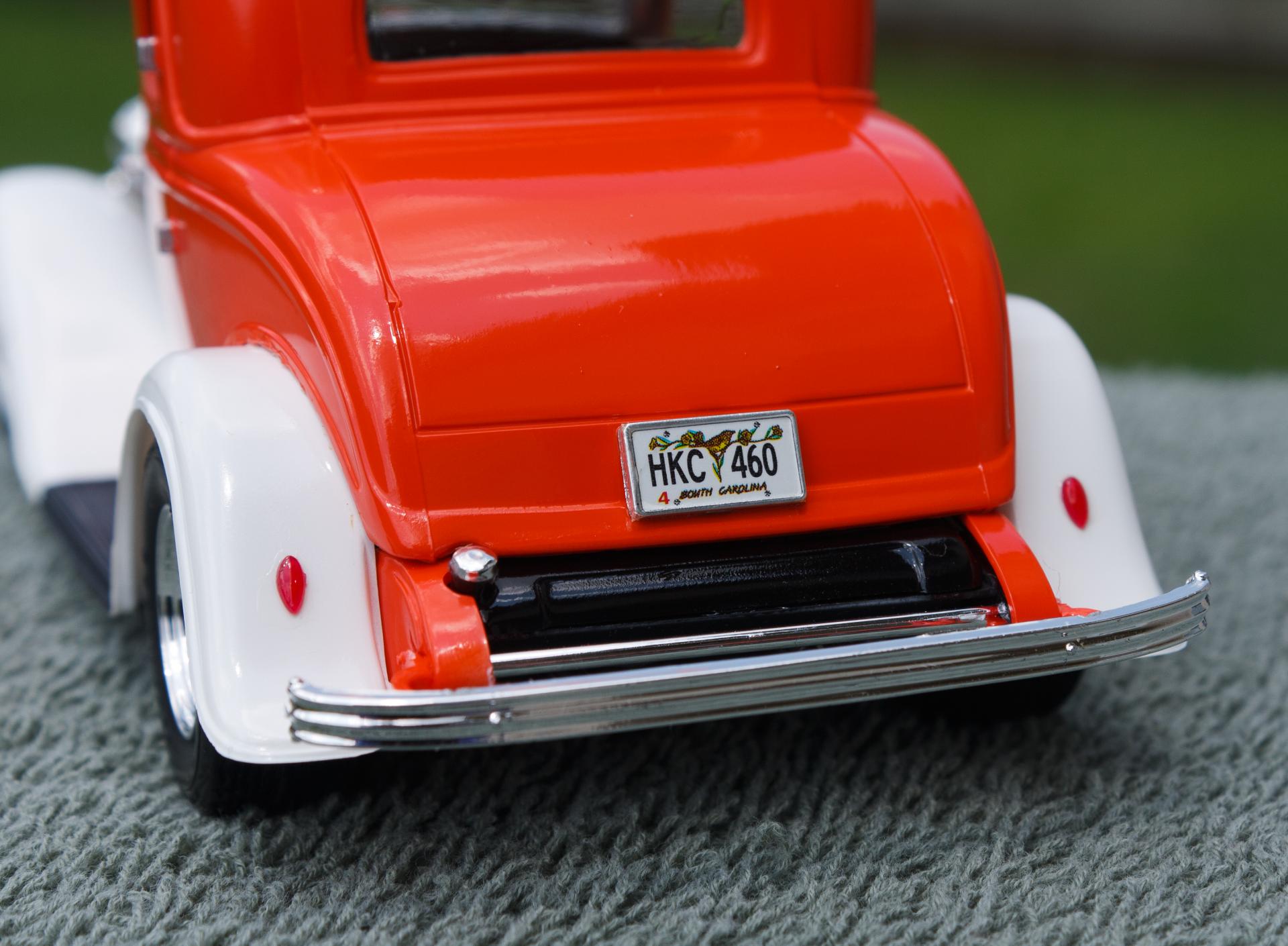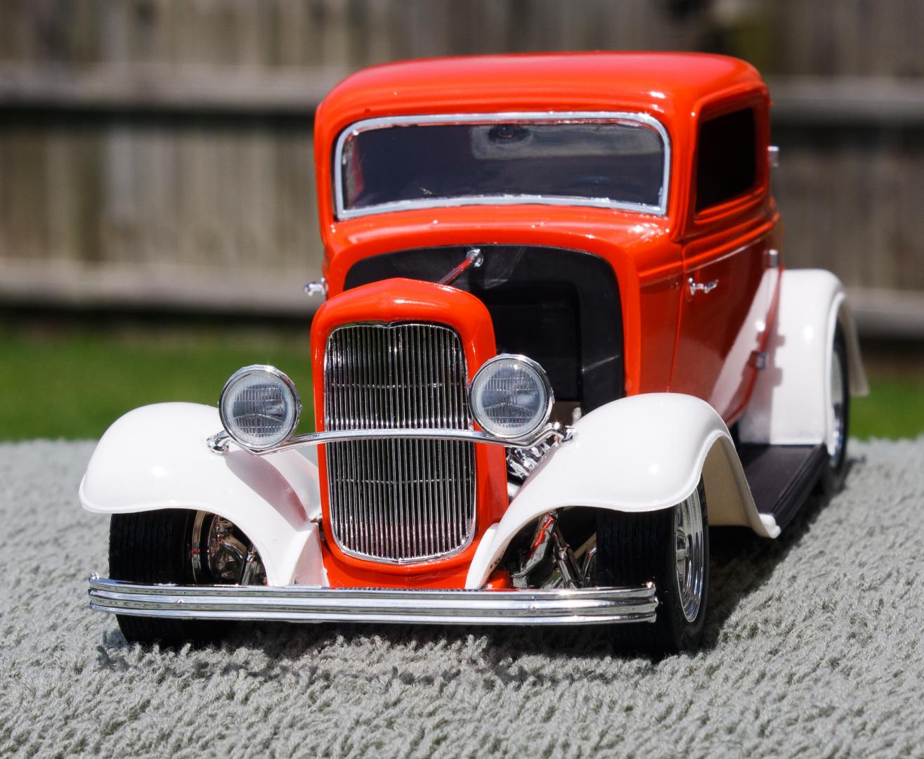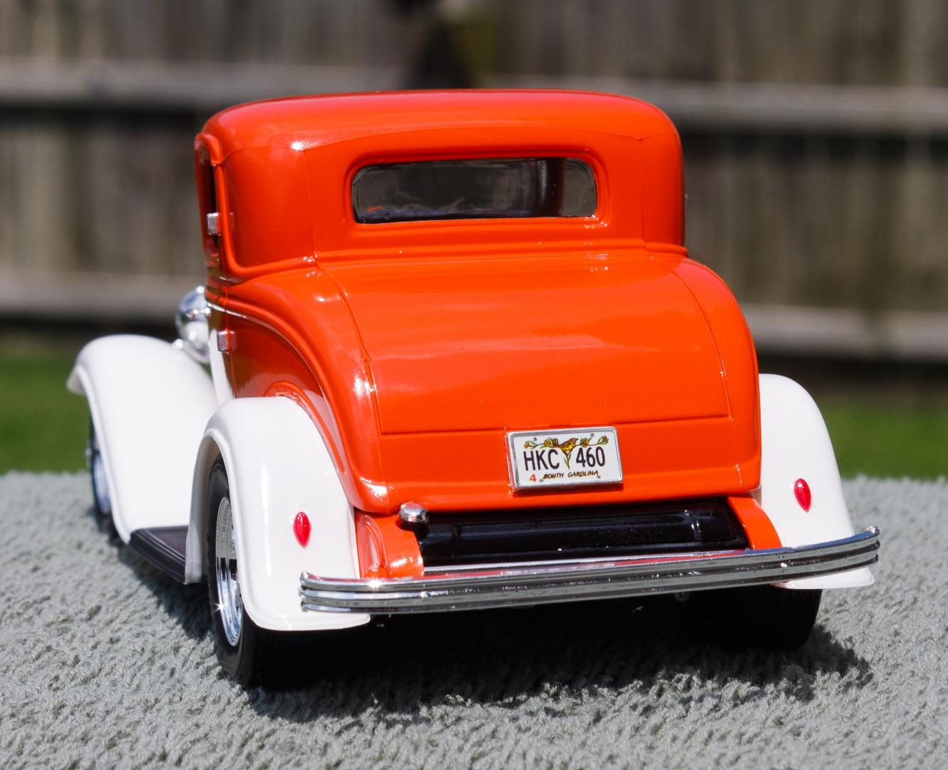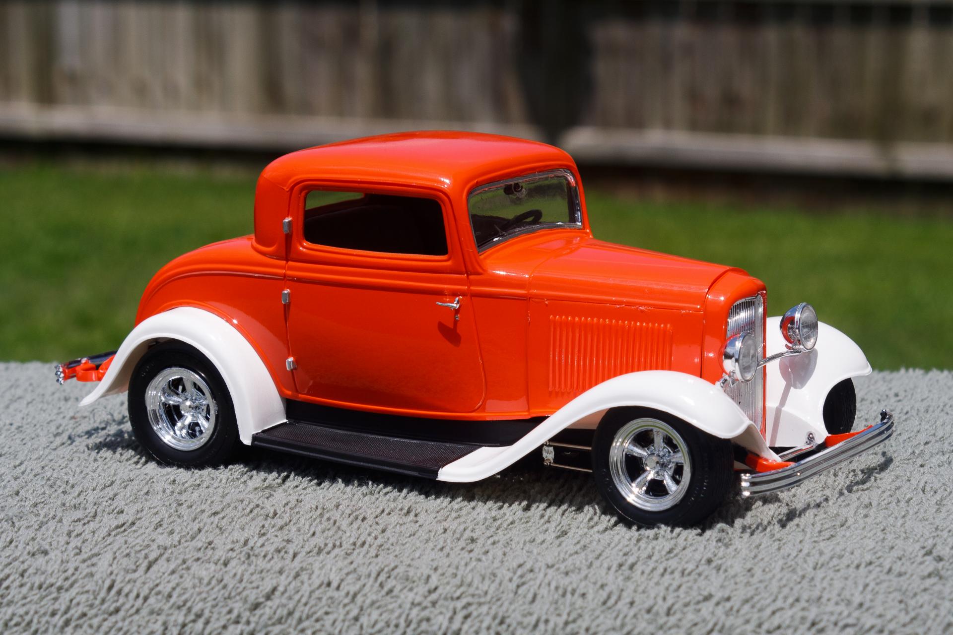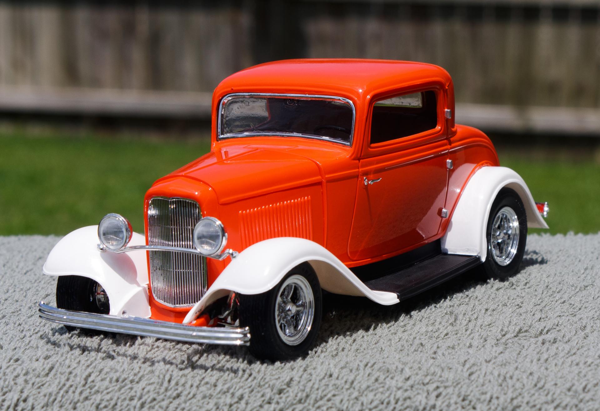 Just finished this '32 Ford 3-Window Coupe kit made by Revell Monogram. The white fenders were a little nod to the Ramblin' Wreck from Georgia Tech, with an orange body instead of gold. Enjoy!