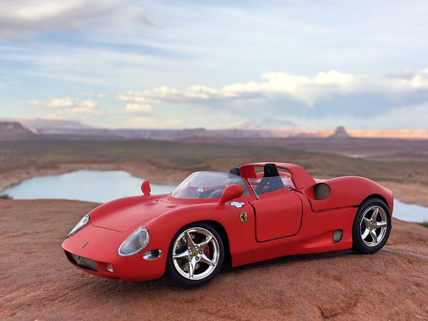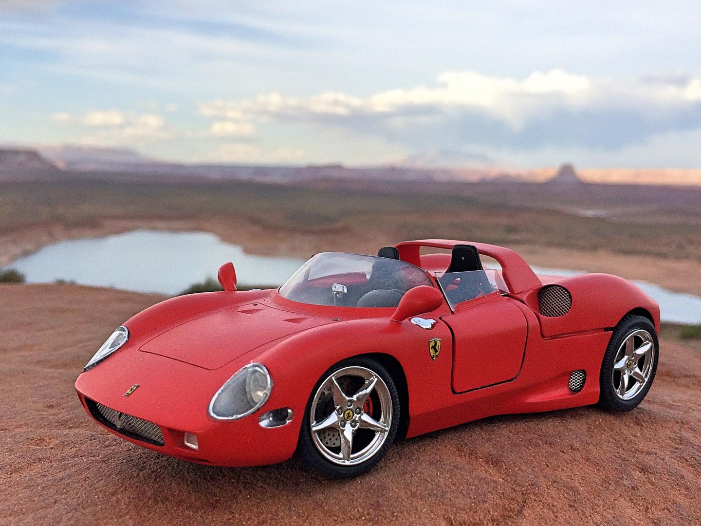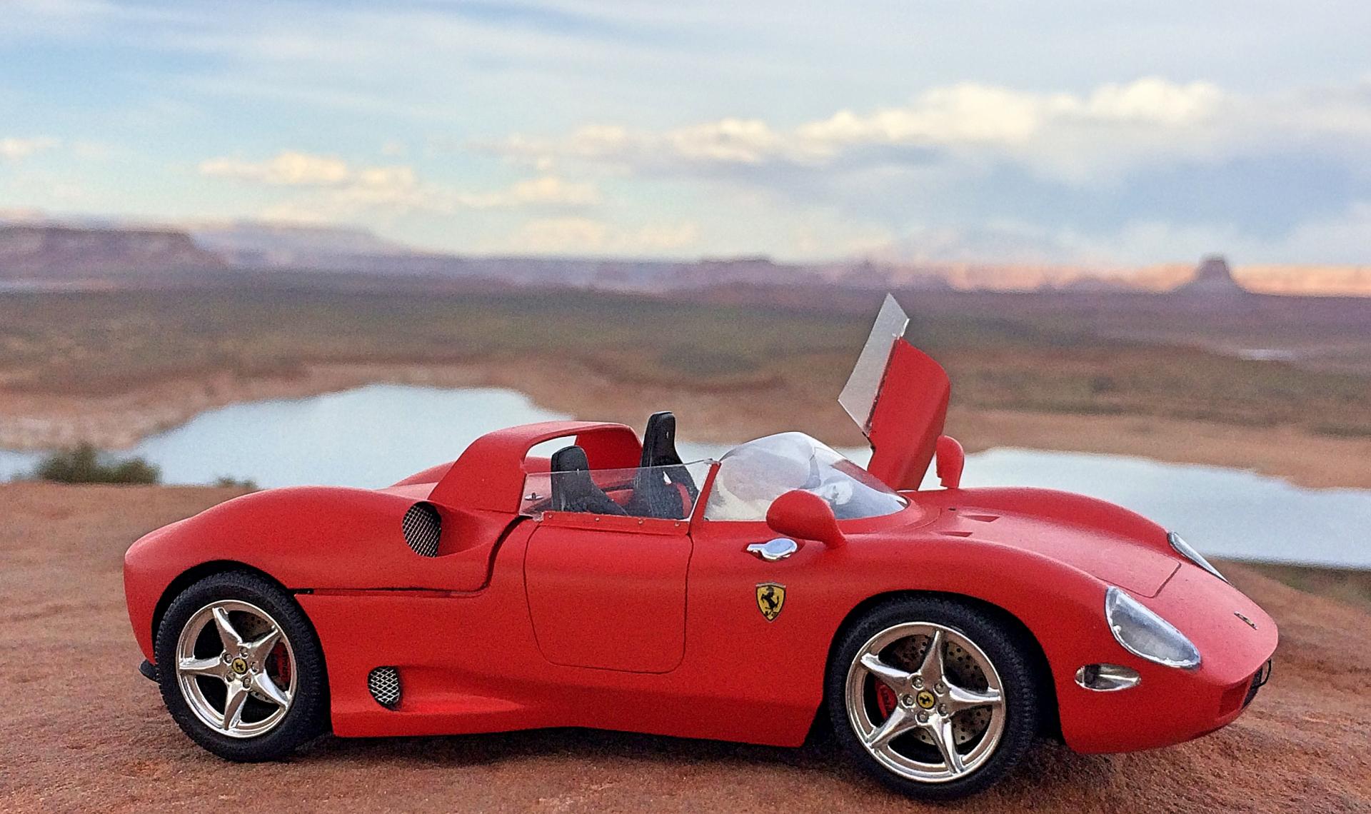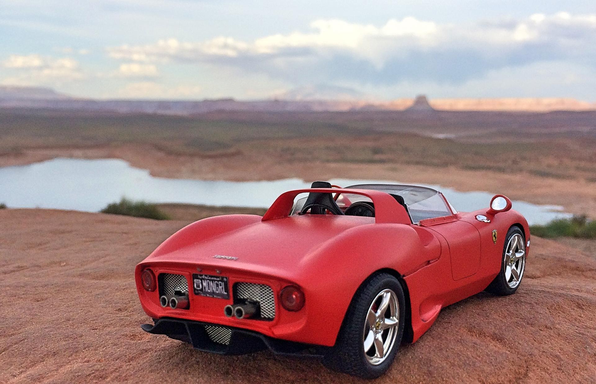 Kitbash of the classic Monogram Ferrari 275P curbside/slot-car, a 1990 reissue of the 1964 kit, and the Revell 360 Modena Spyder that is sort of a curbside since the hood did not open, but had a window over the engine. Work In Progress I found the 275P at a Phoenix model swap last month, then saw the Modena and it was crazy time. Started Tax Day with a mock up, started butchering on the 18th, worked like a dog until the 3rd at Noon, just before heading up to GSL, 132 hours. I did rush it, could have spent a couple of weeks sanding and polishing, and it would probably would have ended up in the box like a few other projects. I just wanted something different than the typical super dooper shiny muscle car on the table. I didn't have time to write a build document, but had this for the description: Blasphemous and sacrilegious kitbash of a historic Ferrari race car that won Le Mans two years in a row, and another Ferrari that only has a 3586 cc 395 HP V8. Story is, this car was found in a chicken coop somewhere in Venezuela, missing the 3285cc 320 HP V12 engine and transmission, the aluminum tub was badly corroded from chicken poop. The Modena was bought at a tax auction, it was rolled by the drug dealer during a police chase. Built by a shop wanting to do a reality TV show, but never got funding because it’s just a Ferrari and not an American muscle car. Some of these pictures were taken at Page on the way home.