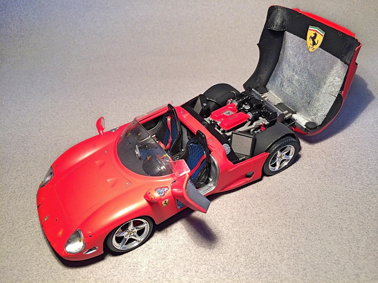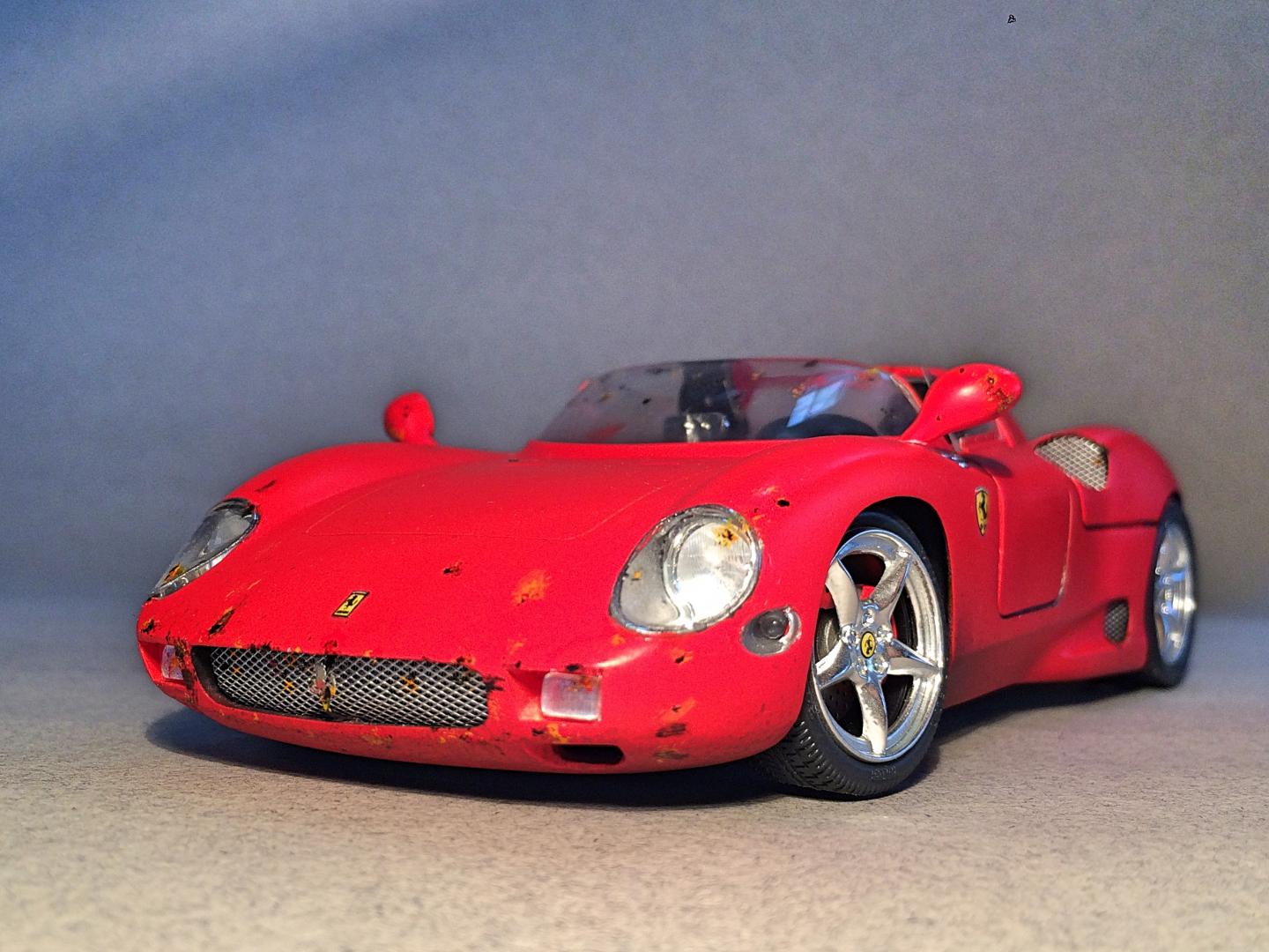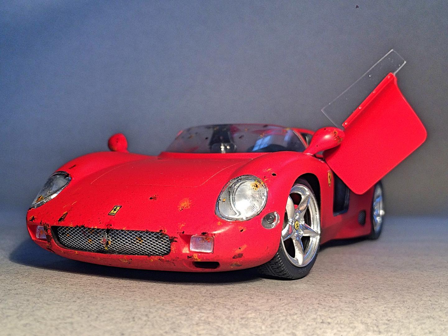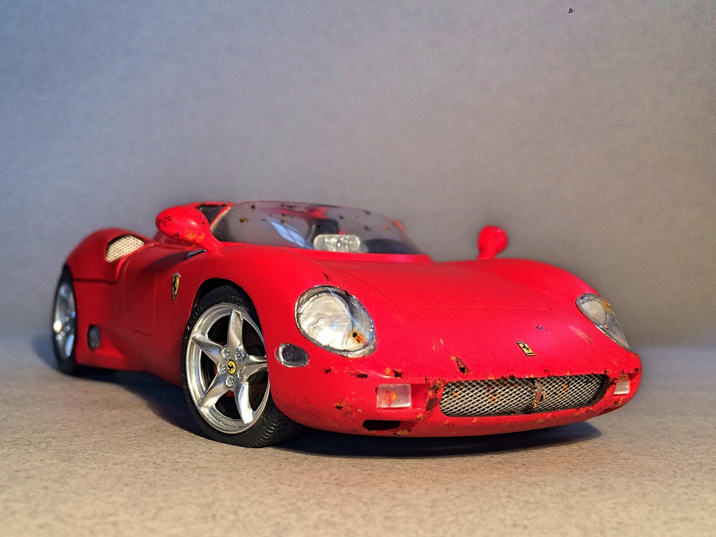 Kitbash of the classic Monogram Ferrari 275P curbside/slot-car, a 1990 reissue of the 1964 kit, and the Revell 360 Modena Spyder that is sort of a curbside since the hood did not open, but had a window over the engine. Work In Progress I found the 275P at a Phoenix model swap last month, then saw the Modena and it was crazy time. Started Tax Day with a mock up, started butchering on the 18th, worked like a dog until the 3rd at Noon, just before heading up to GSL, 132 hours. I did rush it, could have spent a couple of weeks sanding and polishing, and it would probably would have ended up in the box like a few other projects. I just wanted something different than the typical super dooper shiny muscle car on the table. I didn't have time to write a build document, but had this for the description: Blasphemous and sacrilegious kitbash of a historic Ferrari race car that won Le Mans two years in a row, and another Ferrari that only has a 3586 cc 395 HP V8. Story is, this car was found in a chicken coop somewhere in Venezuela, missing the 3285cc 320 HP V12 engine and transmission, the aluminum tub was badly corroded from chicken poop. The Modena was bought at a tax auction, it was rolled by the drug dealer during a police chase. Built by a shop wanting to do a reality TV show, but never got funding because it’s just a Ferrari and not an American muscle car. Some of these pictures were taken at Page on the way home.