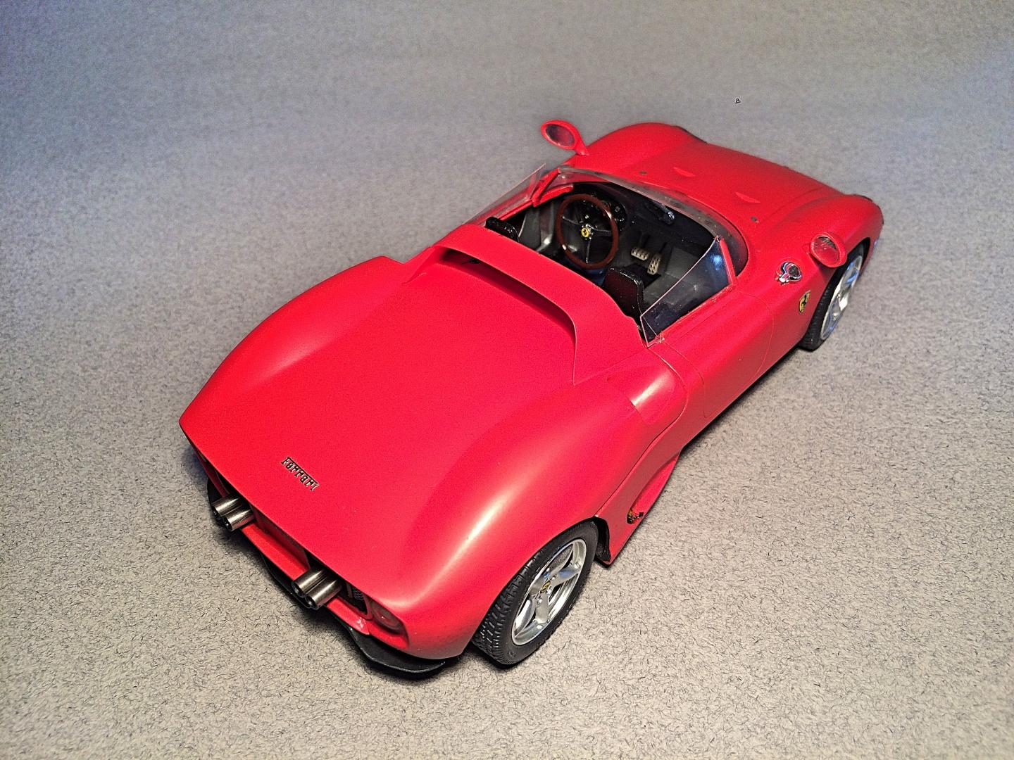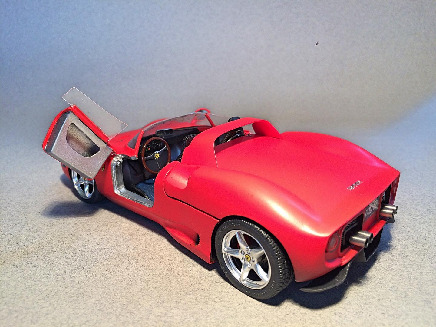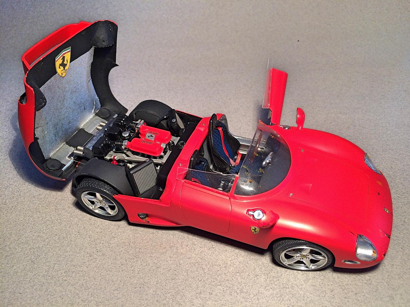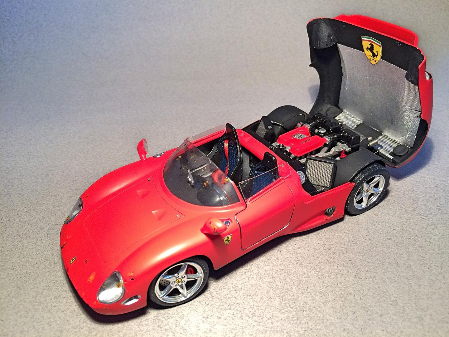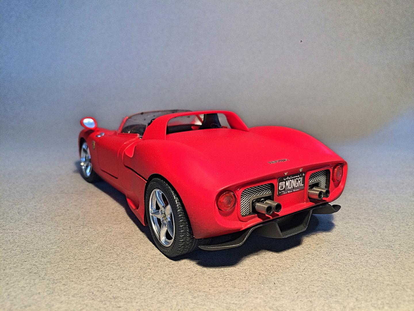 Kitbash of the classic Monogram Ferrari 275P curbside/slot-car, a 1990 reissue of the 1964 kit, and the Revell 360 Modena Spyder that is sort of a curbside since the hood did not open, but had a window over the engine. Work In Progress I found the 275P at a Phoenix model swap last month, then saw the Modena and it was crazy time. Started Tax Day with a mock up, started butchering on the 18th, worked like a dog until the 3rd at Noon, just before heading up to GSL, 132 hours. I did rush it, could have spent a couple of weeks sanding and polishing, and it would probably would have ended up in the box like a few other projects. I just wanted something different than the typical super dooper shiny muscle car on the table. I didn't have time to write a build document, but had this for the description: Blasphemous and sacrilegious kitbash of a historic Ferrari race car that won Le Mans two years in a row, and another Ferrari that only has a 3586 cc 395 HP V8. Story is, this car was found in a chicken coop somewhere in Venezuela, missing the 3285cc 320 HP V12 engine and transmission, the aluminum tub was badly corroded from chicken poop. The Modena was bought at a tax auction, it was rolled by the drug dealer during a police chase. Built by a shop wanting to do a reality TV show, but never got funding because it’s just a Ferrari and not an American muscle car. Some of these pictures were taken at Page on the way home.
