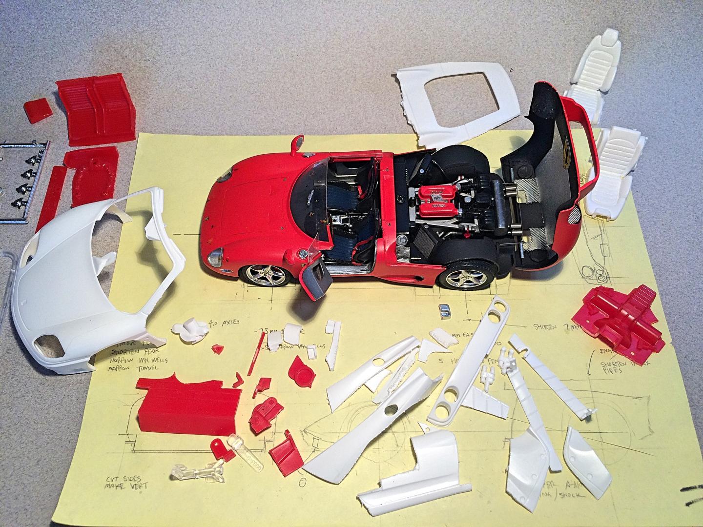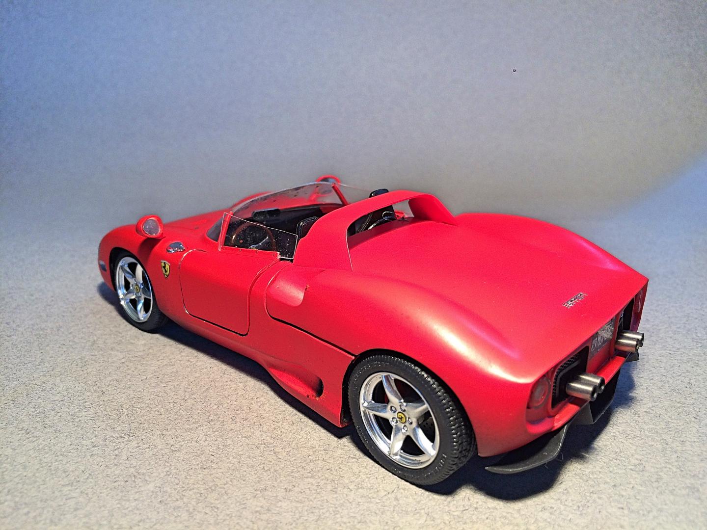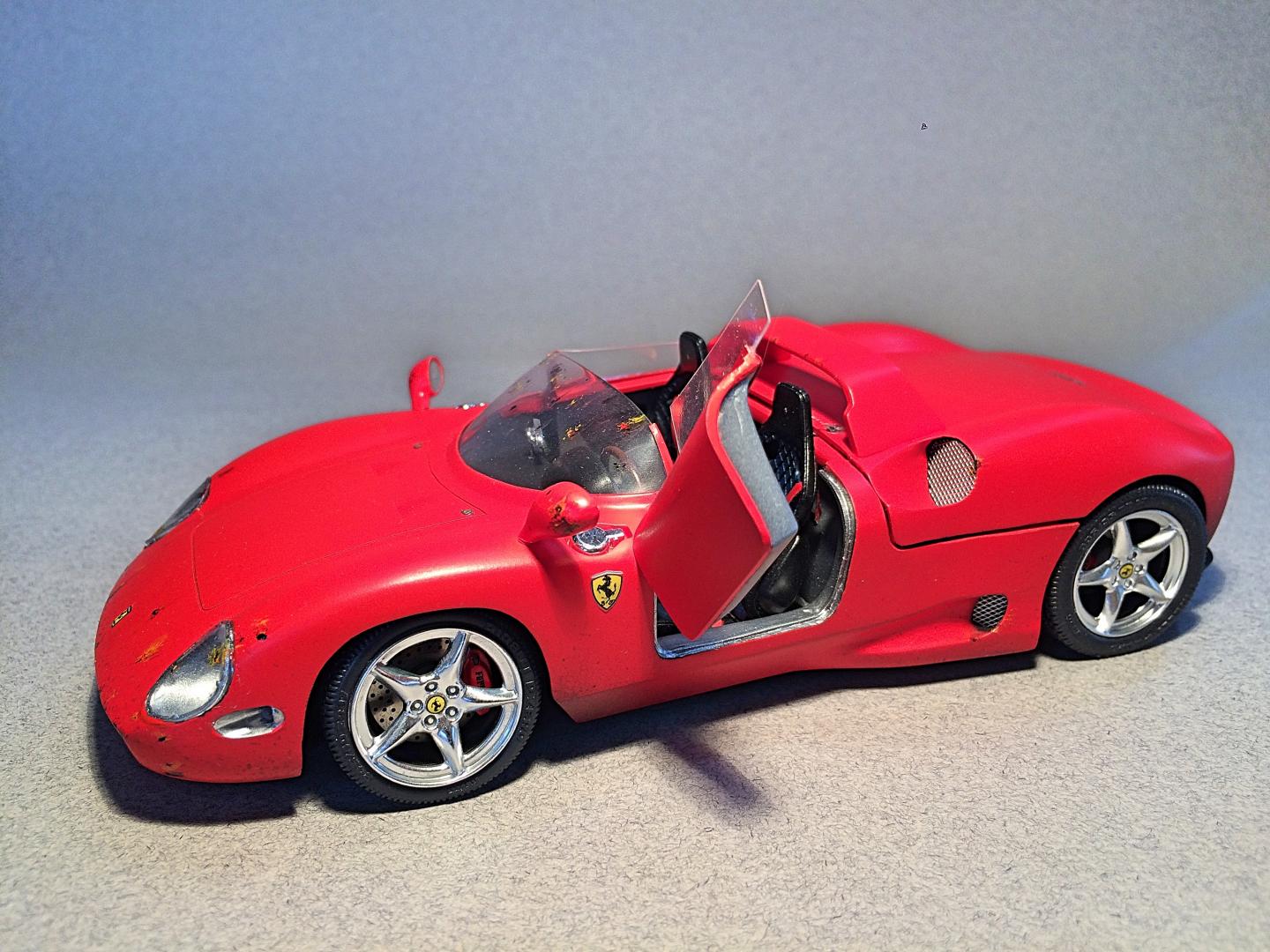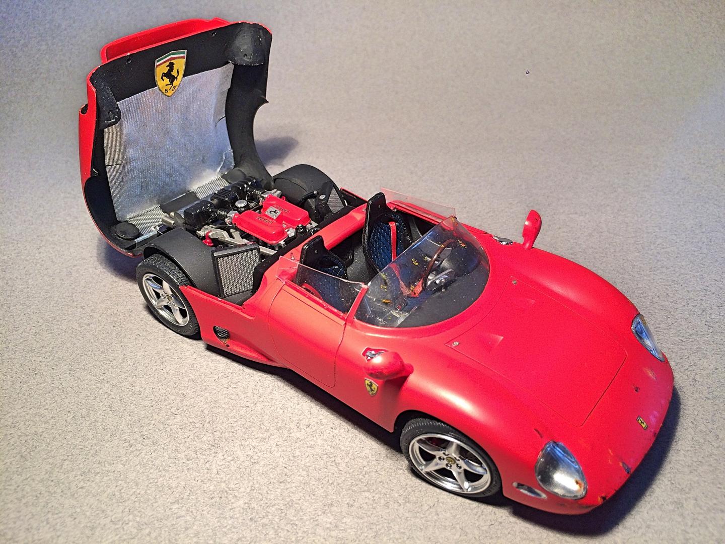 Kitbash of the classic Monogram Ferrari 275P curbside/slot-car, a 1990 reissue of the 1964 kit, and the Revell 360 Modena Spyder that is sort of a curbside since the hood did not open, but had a window over the engine. Work In Progress I found the 275P at a Phoenix model swap last month, then saw the Modena and it was crazy time. Started Tax Day with a mock up, started butchering on the 18th, worked like a dog until the 3rd at Noon, just before heading up to GSL, 132 hours. I did rush it, could have spent a couple of weeks sanding and polishing, and it would probably would have ended up in the box like a few other projects. I just wanted something different than the typical super dooper shiny muscle car on the table. I didn't have time to write a build document, but had this for the description: Blasphemous and sacrilegious kitbash of a historic Ferrari race car that won Le Mans two years in a row, and another Ferrari that only has a 3586 cc 395 HP V8. Story is, this car was found in a chicken coop somewhere in Venezuela, missing the 3285cc 320 HP V12 engine and transmission, the aluminum tub was badly corroded from chicken poop. The Modena was bought at a tax auction, it was rolled by the drug dealer during a police chase. Built by a shop wanting to do a reality TV show, but never got funding because it’s just a Ferrari and not an American muscle car. Some of these pictures were taken at Page on the way home.