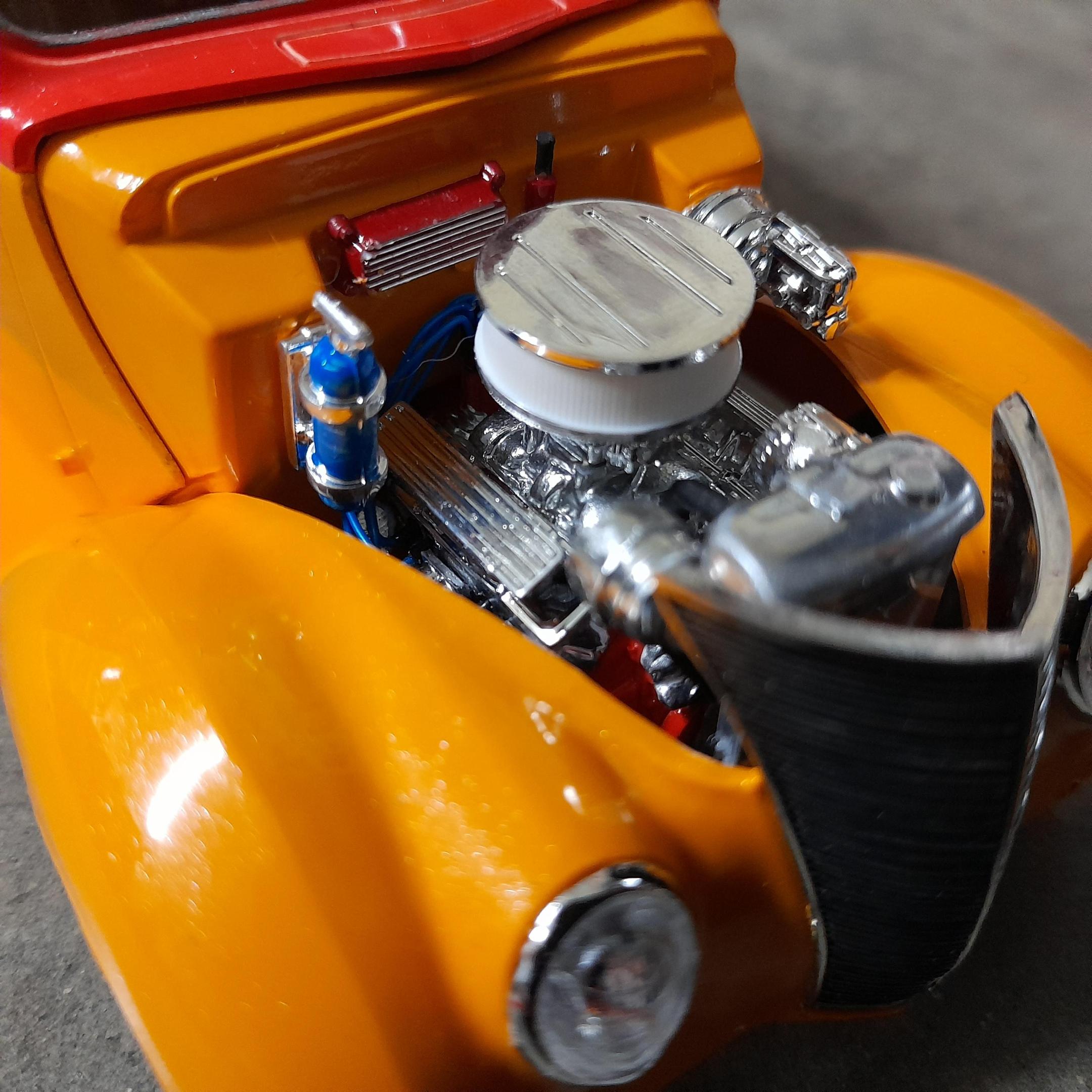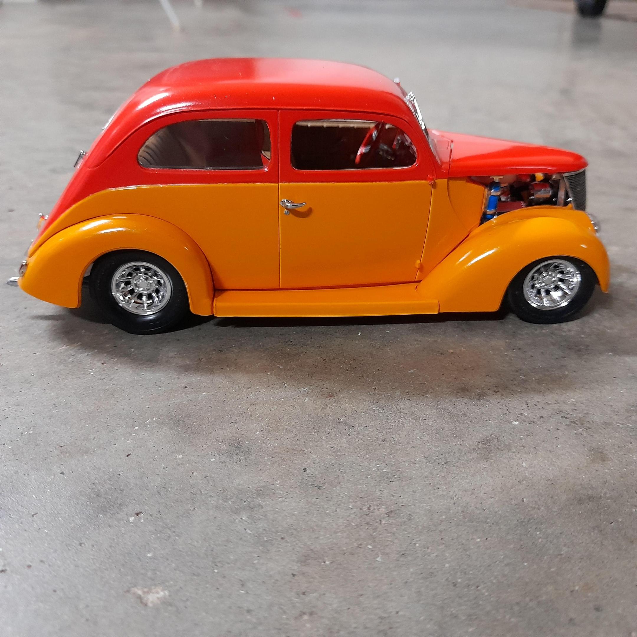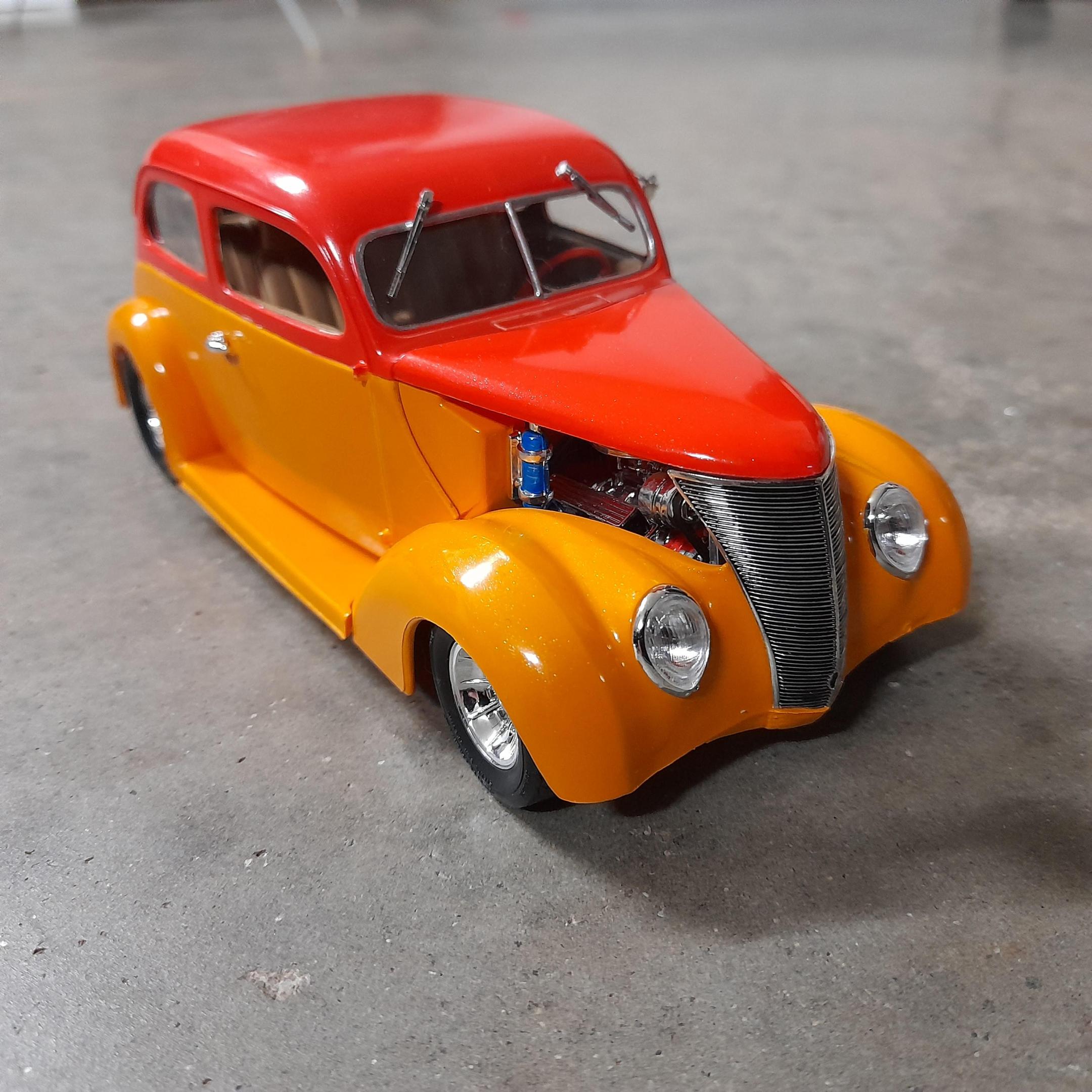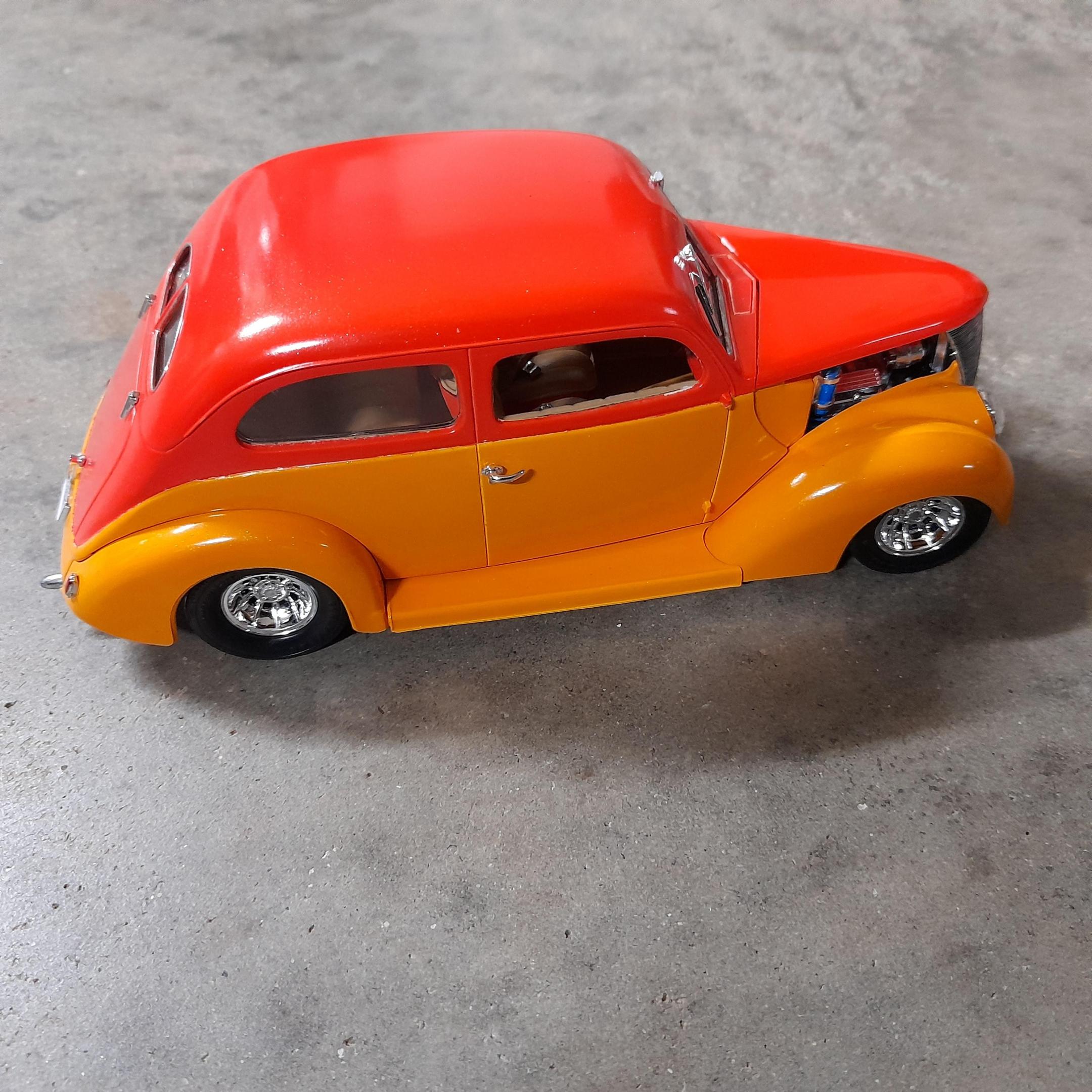 G'day folks, here I have my 37 tudor built back in September 2020. This is a nice model with good details, especially the independent front suspension. Paint is Tamiya ts31 bright orange and ts34 camel yellow with a coat of pearl clear. Mostly built oob with some extra details in the engine compartment like electronic ignition, plug wires and nos cylinder. Wheels are from the parts box. All feedback is welcome and appreciated. Thanks for looking. Cheers, David. ??