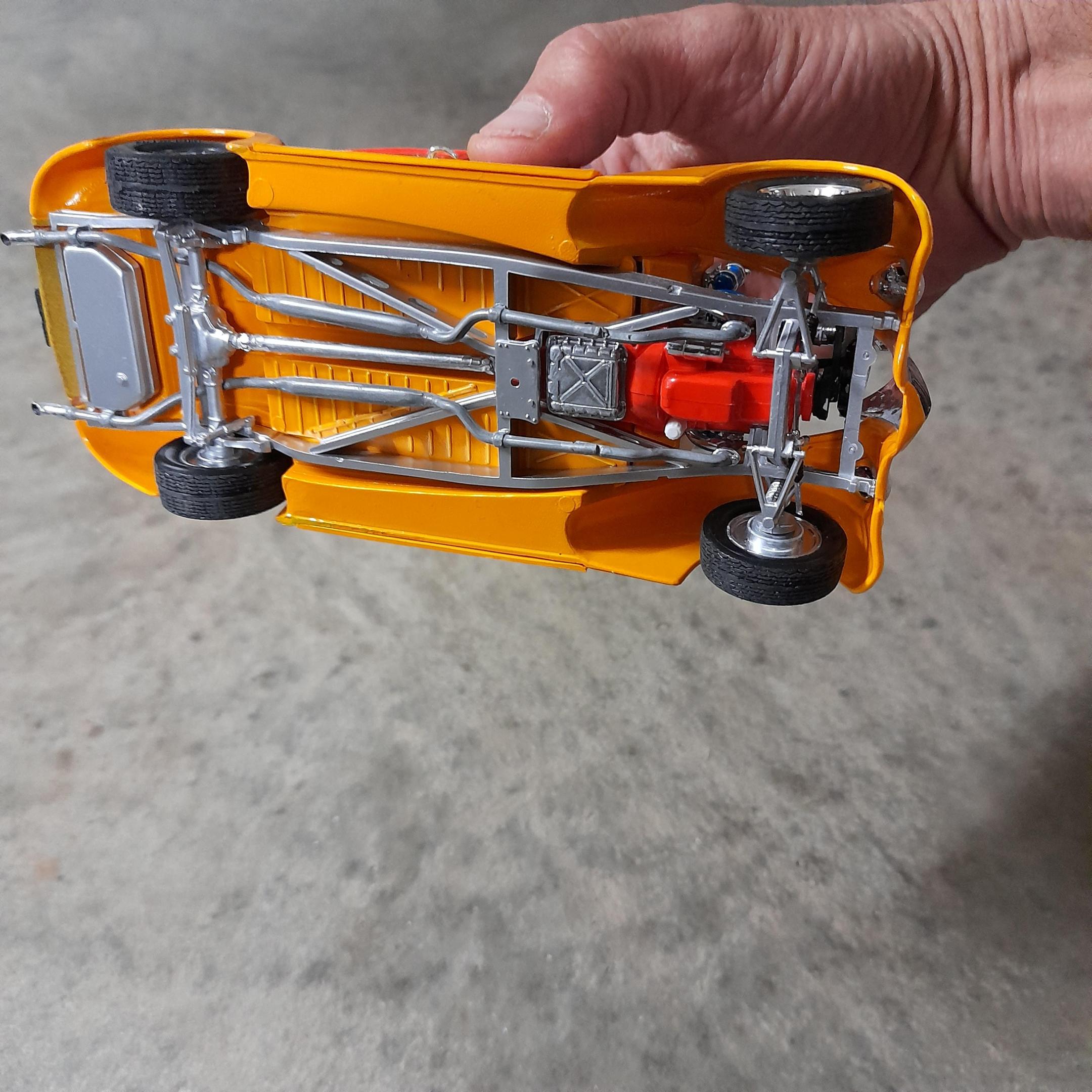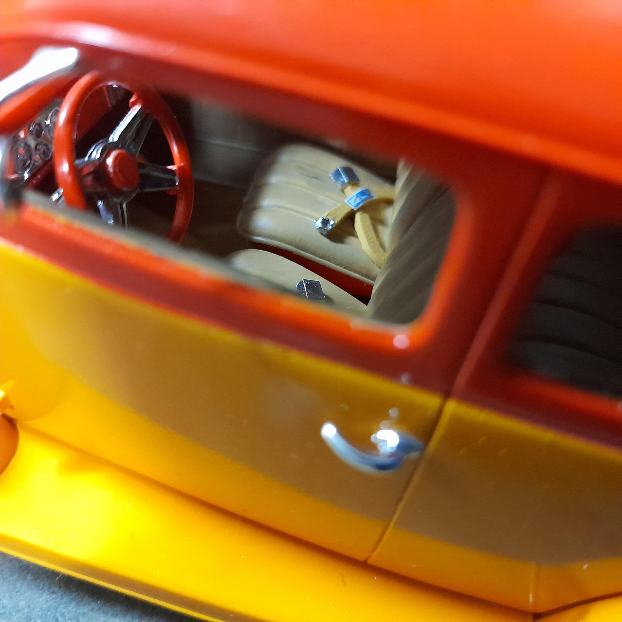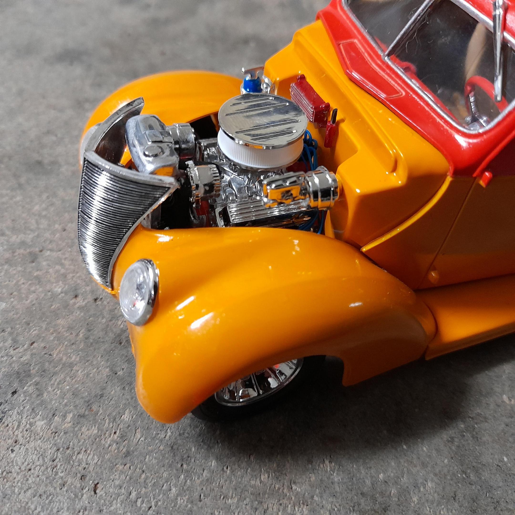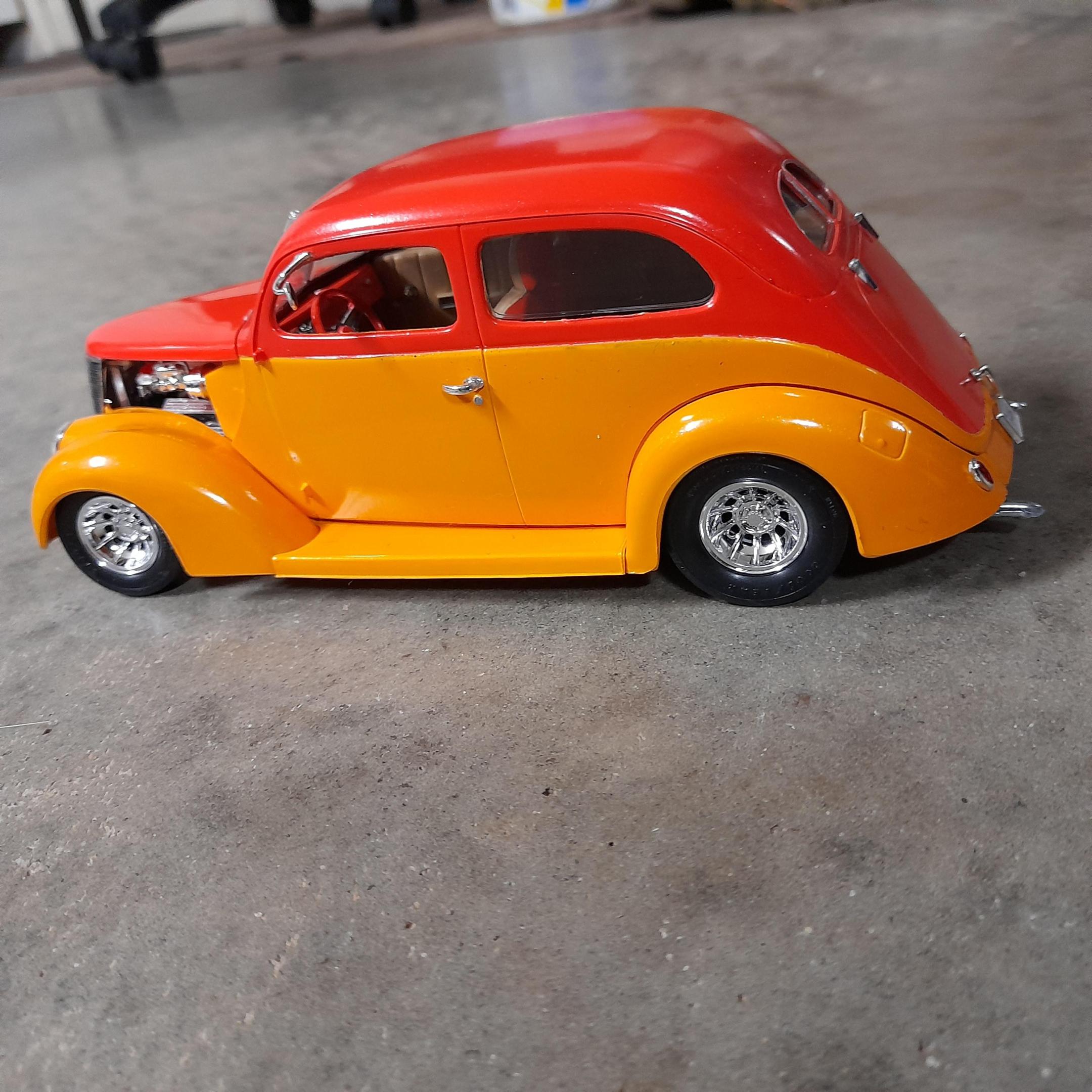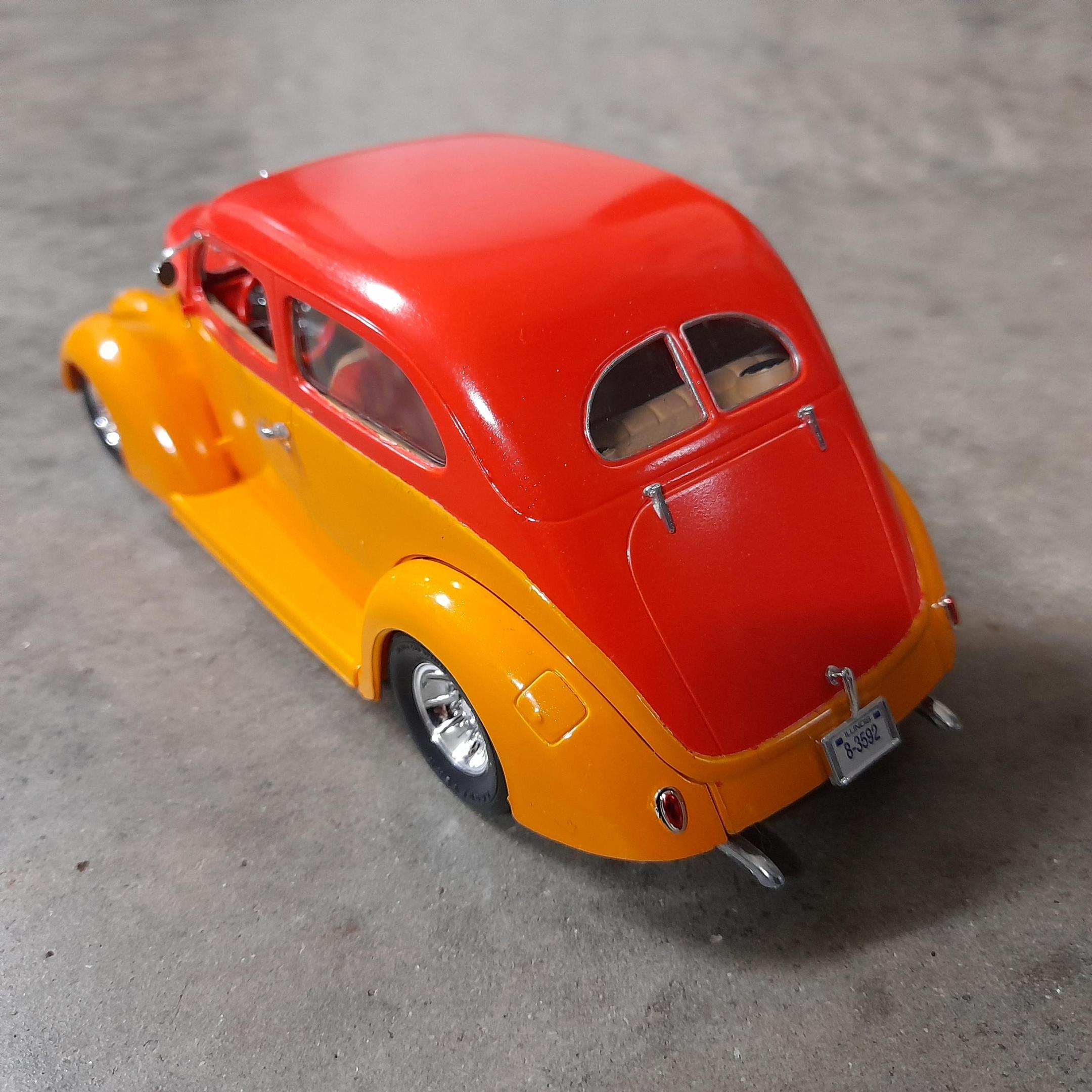 G'day folks, here I have my 37 tudor built back in September 2020. This is a nice model with good details, especially the independent front suspension. Paint is Tamiya ts31 bright orange and ts34 camel yellow with a coat of pearl clear. Mostly built oob with some extra details in the engine compartment like electronic ignition, plug wires and nos cylinder. Wheels are from the parts box. All feedback is welcome and appreciated. Thanks for looking. Cheers, David. ??