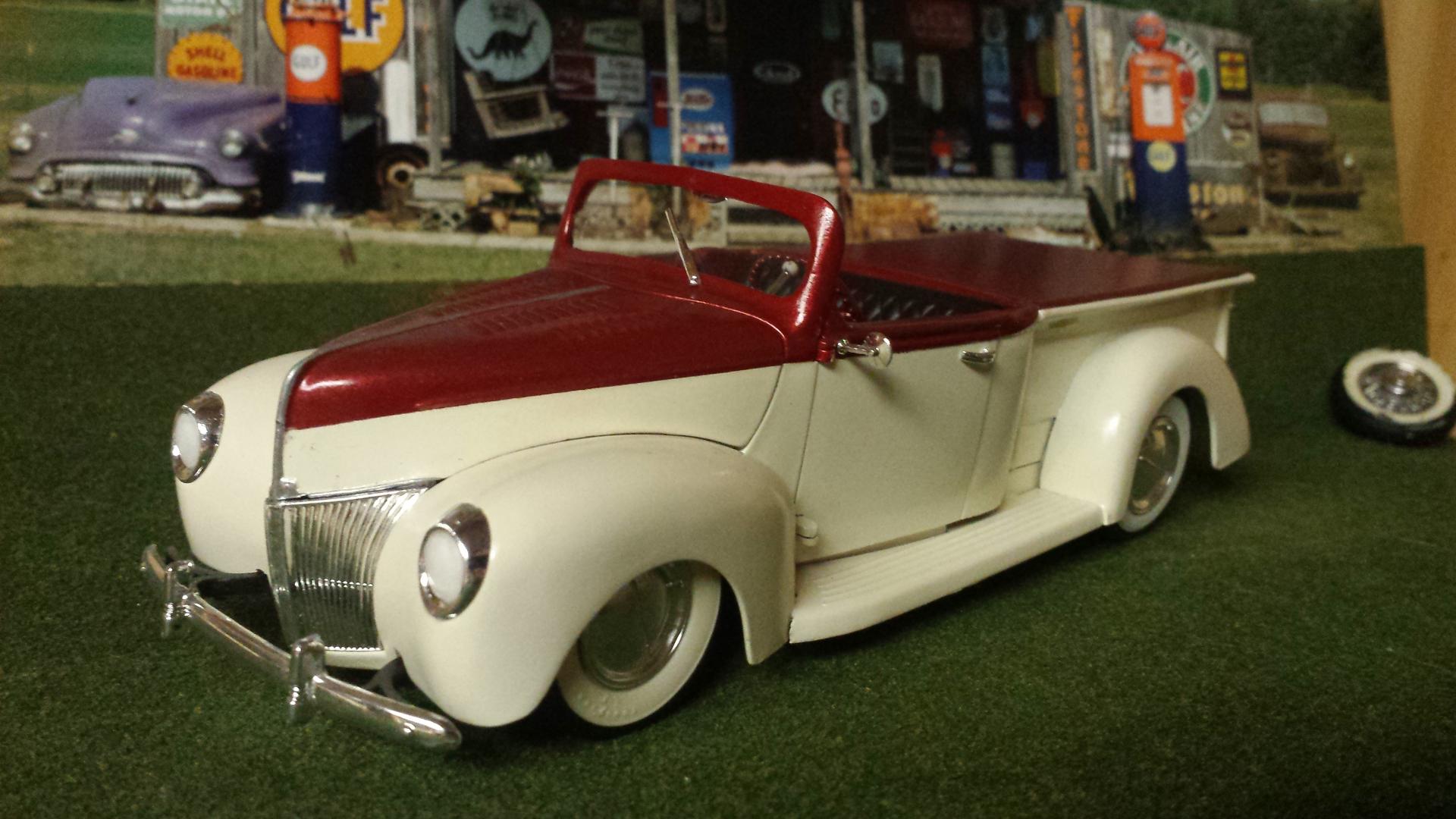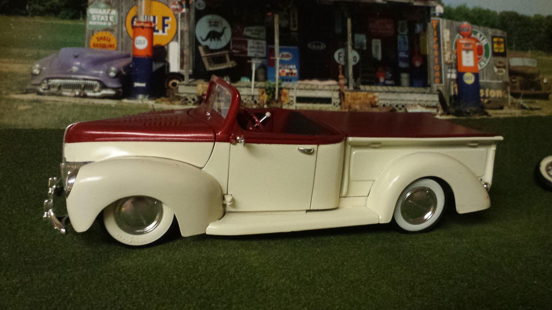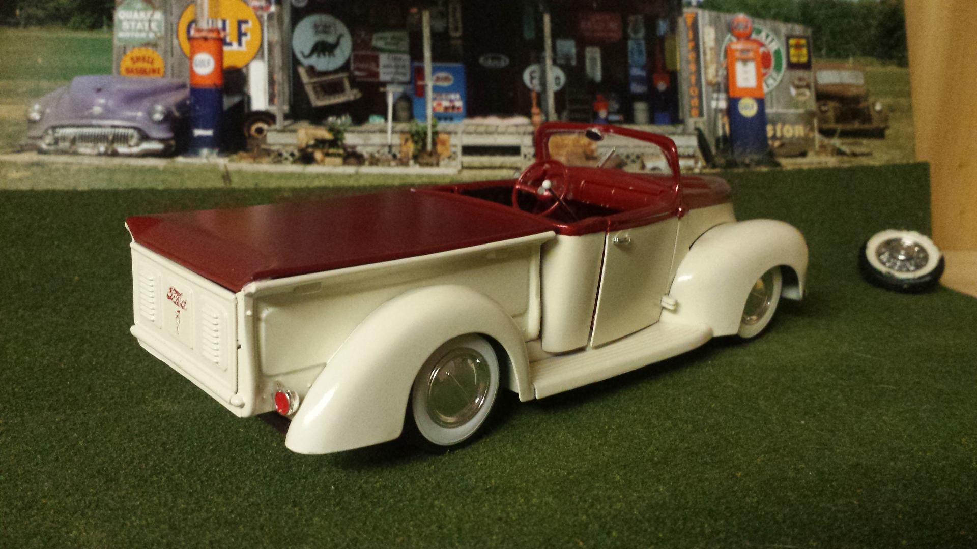 First 40 Ford Pick Up I've ever built. If I ever do one again the doors and the tailgate will be glued shut! It seems the dash and the seat prevent the doors from closing completely and the hood hinge was impossible for me. Blame the color on Chuck and his Creamsicle 32, The wheels are from my stash and the rest is just different color detail paint and a little BMF.