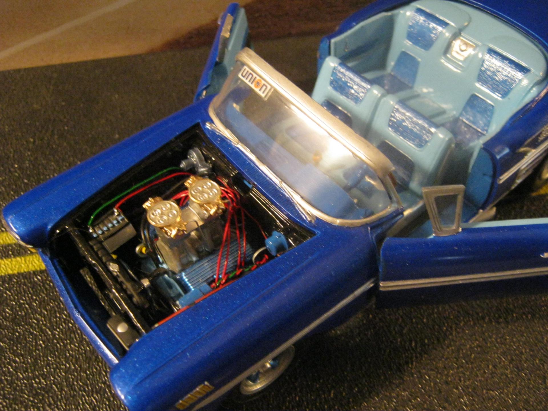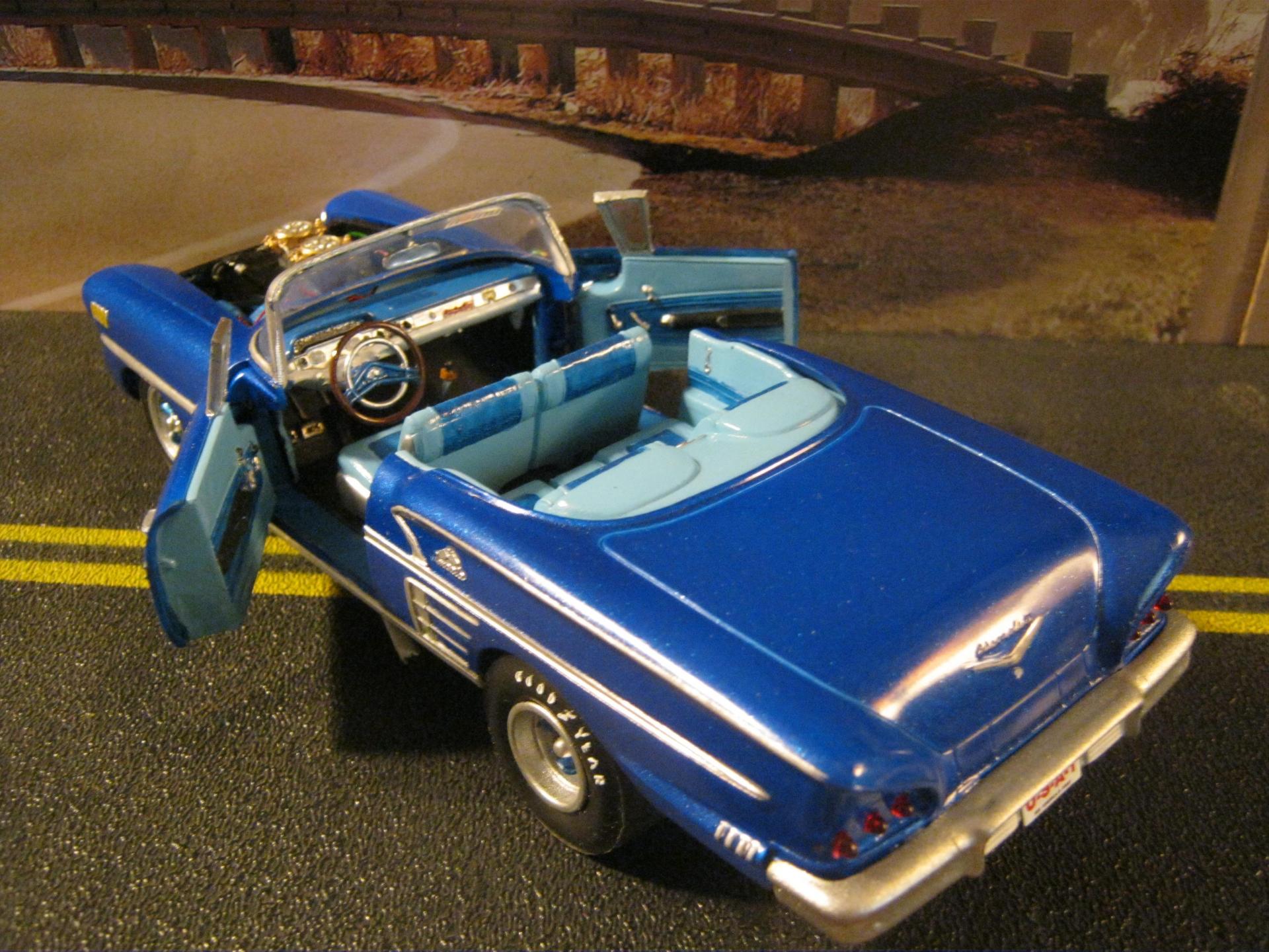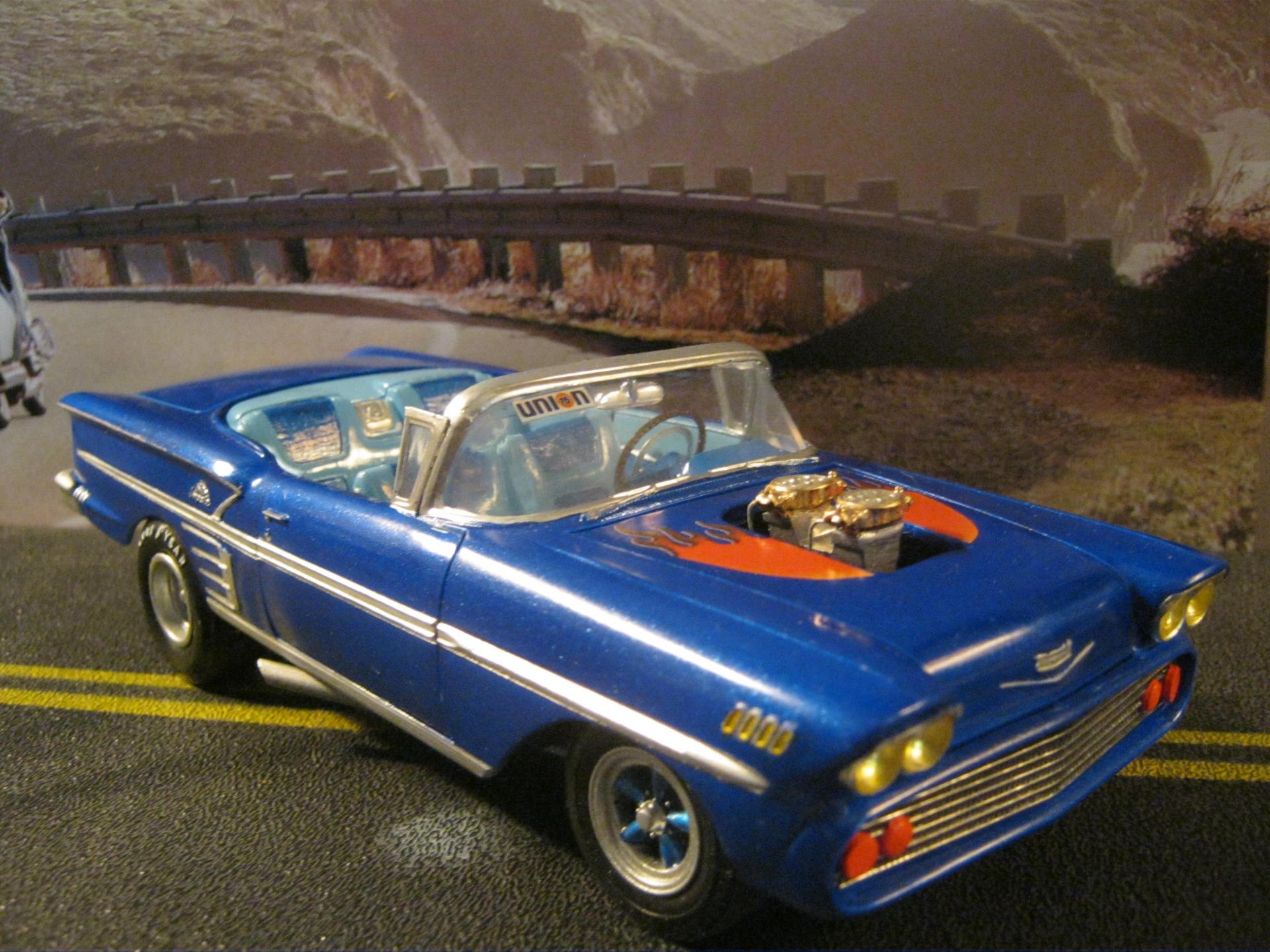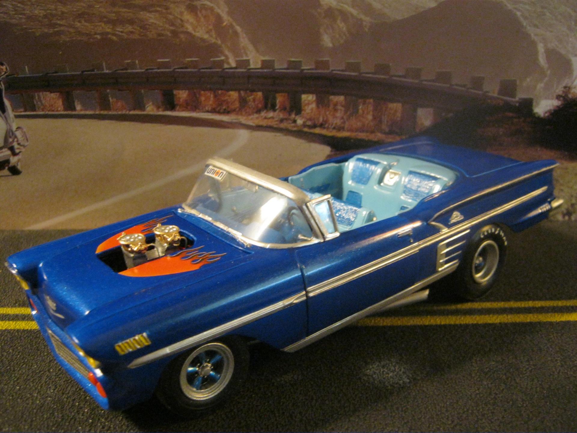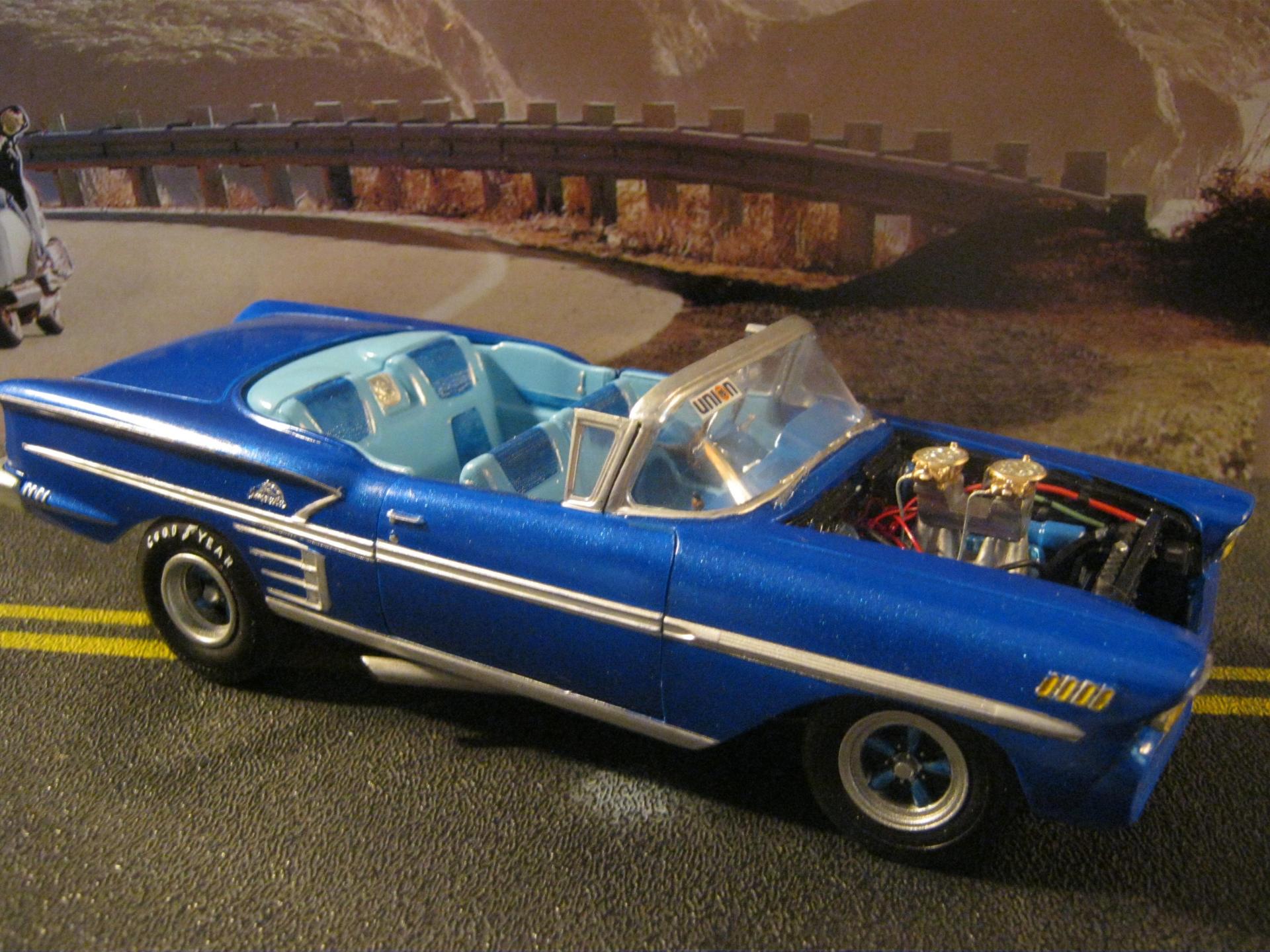 Greetings from mtr cty,,heres what I would do to a 58 Impala if $$ was no object for the 1:1 car. Its a kit from the 90's,, AMT 3n1 I got at a swap meet,,10$ I think. Modified parts are: Removed hard top,, Intake for the 409 mtr. Rims,,rear tires,,sidepipes,used custom front airdam that came in kit. Painted w/ Testors quickdry enamel. Hand painted interior. Kit came w/opening doors,,but they took alot of sanding+ size/fit work to get them to close decently. Hand painted sidetrim work as well. No BMF anywhere on this,,just taped it off w/tamiya tape,,and painted it. I think its one of Chevy's best designed body styles. So unique. Enjoy all the works here,,keep on building!