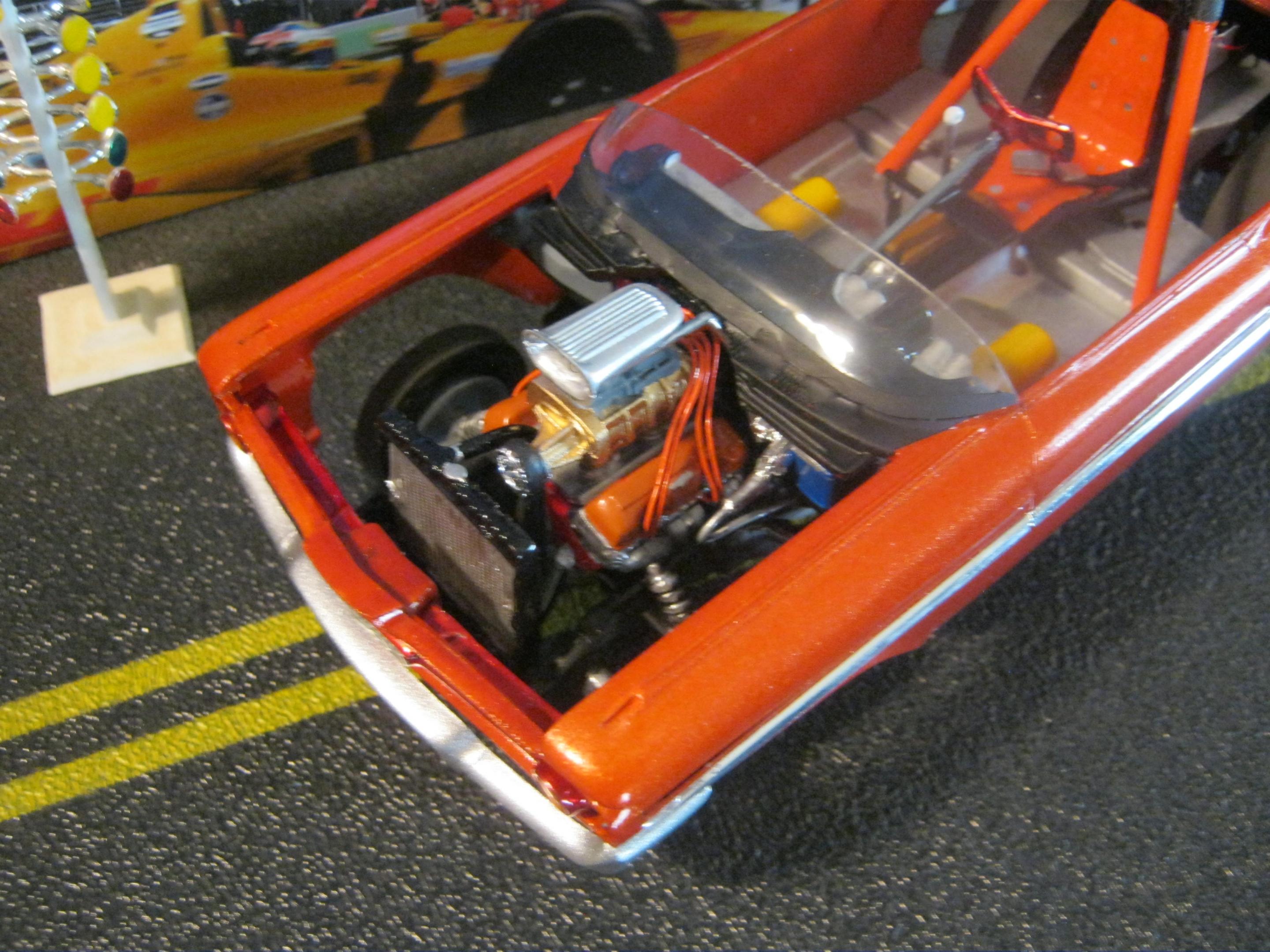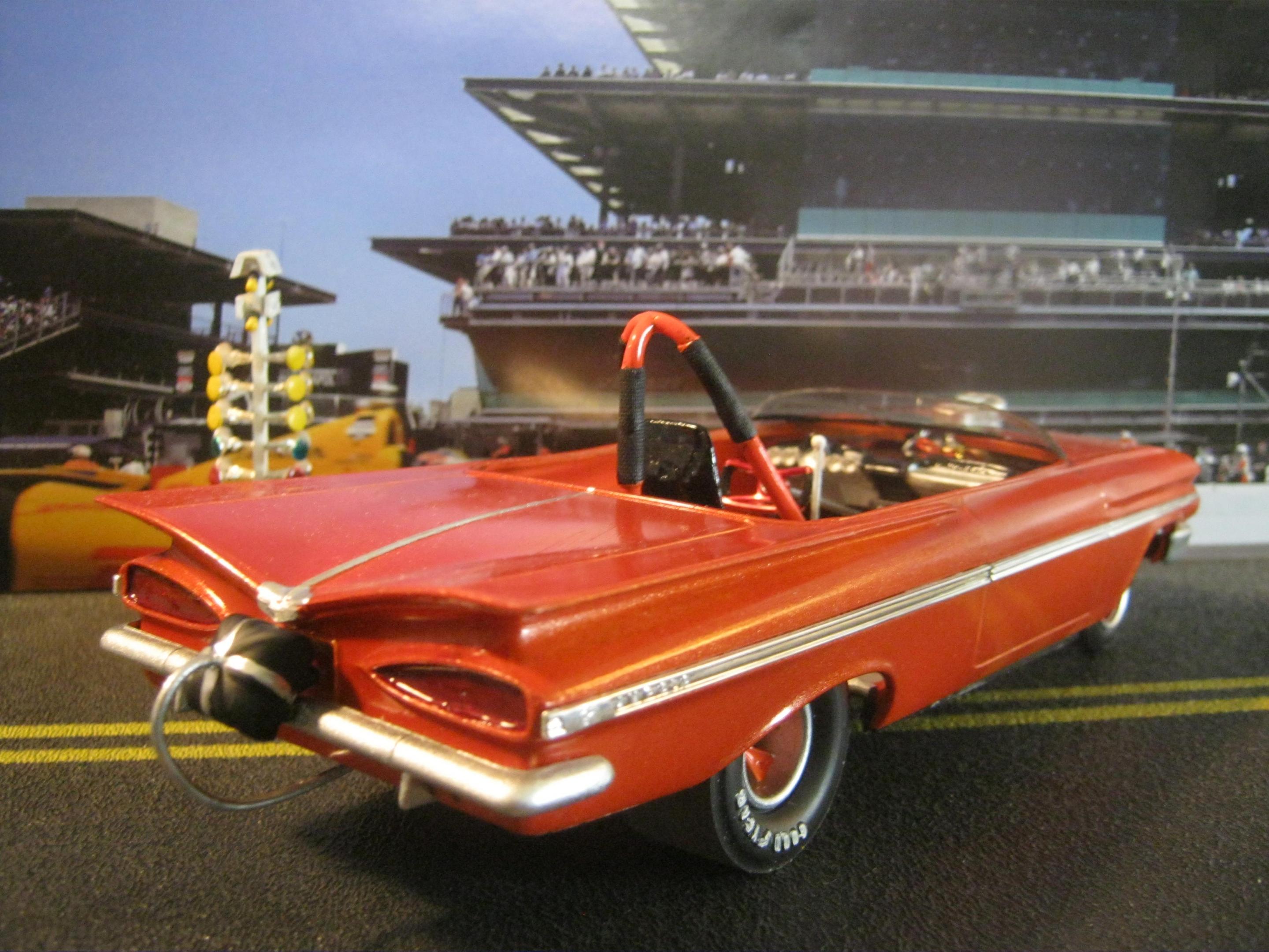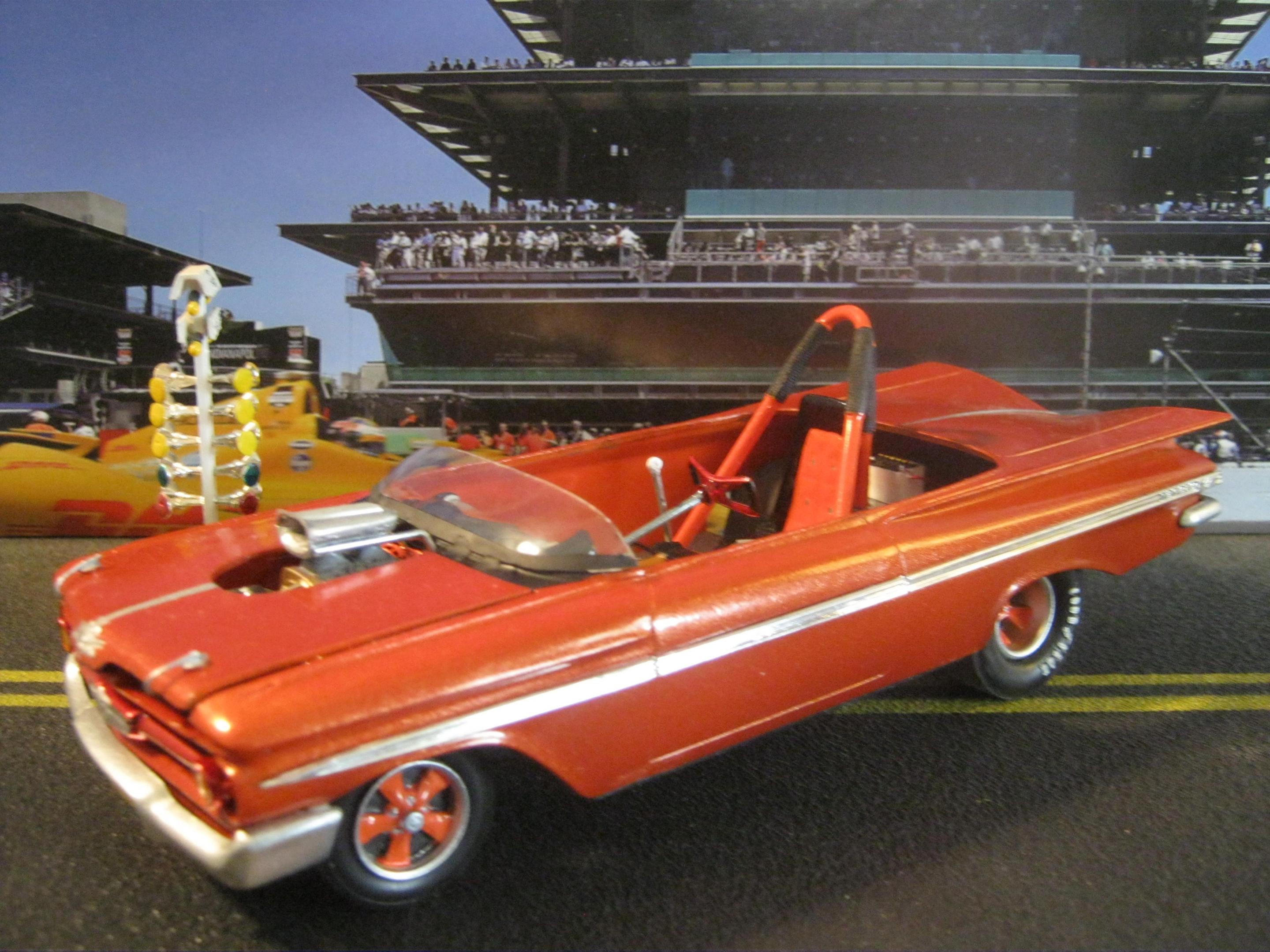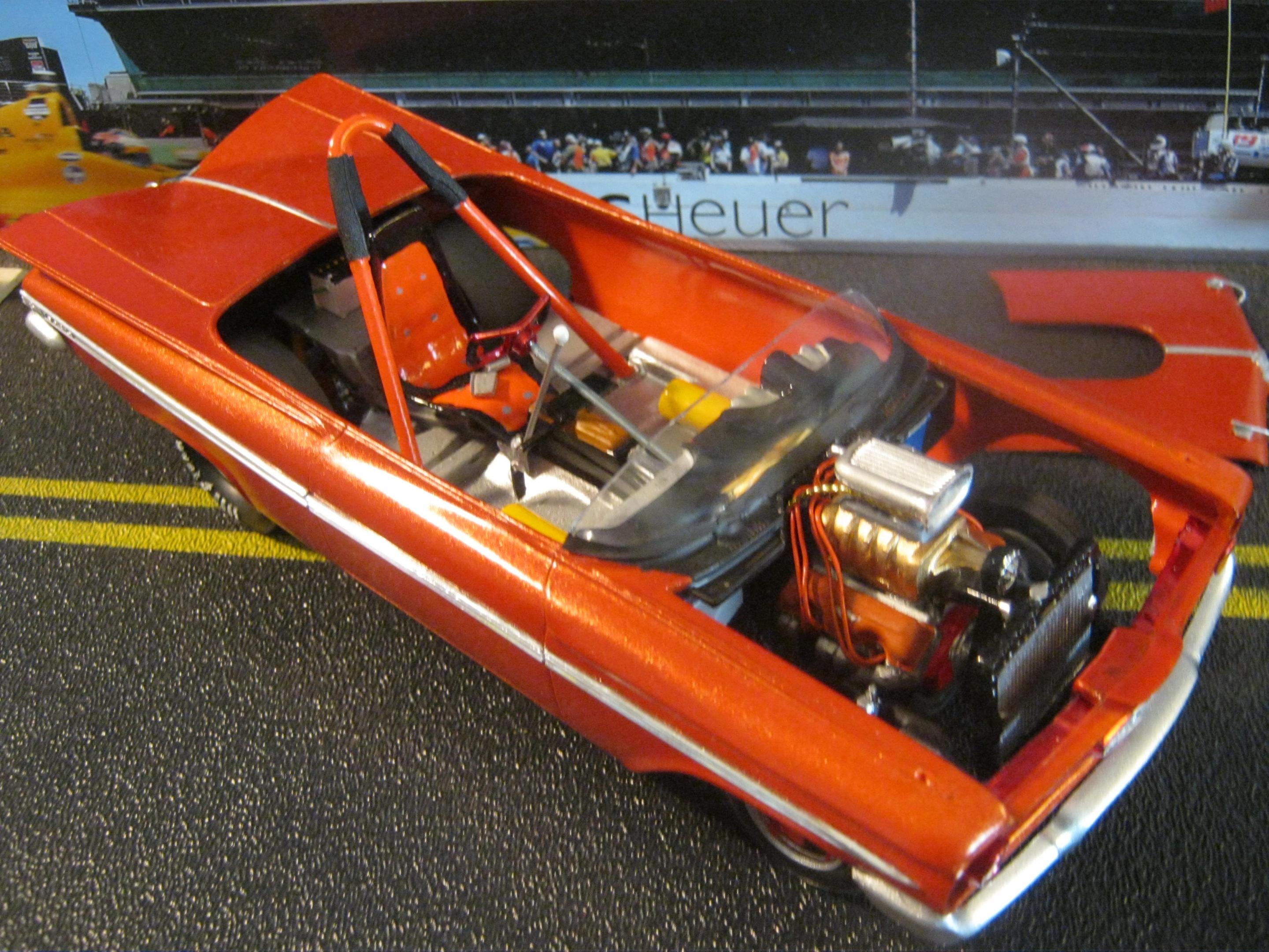 So,,the local drag car guy down the street{circa 1969 if you will} is drivin down a country road one day,,passes a farm or two,,and behind one of the barns he see's just the back tail shape of the 59' Impala,,so he drives up the driveway,,knocks on the door and asks if the Impala is for sale,,the farmer says yes,,but the motors blown,,needs brakes,,interior is shot,,but Ill let it go for 150$,,car guy pulls out 150$,,says thanks,,and rounds up a few buddies to tow back to shop in his garage,,and wants to build a open top drag car out of it,,,,,,,8 months later,, hes got the IMPALA "X". In reality,,this was a 5$ 1/2 built glue blob in a ziplock bag I got at the NNL Macomb county Mi a few years ago,,and decided to give it a whirrl. I have no idea what brand kit it is,,or what year it was mfg,,it was quite old though,,the glue on it was yellowed and just about dried out and cracked,,you could pull everything apart by hand. Custom cut the chassis to fit drag rear end/slicks,,installed straight front axle from x-tra parts bx,,installed a blown 409 from the x-tras bx,,everything else is from the leftovers parts boxes lying around the house. Hand dremmeled the windshield from leftovers stuff,,, rims + tires from the leftover parts bxs,, Drag headers installed also. made seat belts for it. Lookin forward to seeing "IMPALA X" some saturday night at the local strip! Cheers!