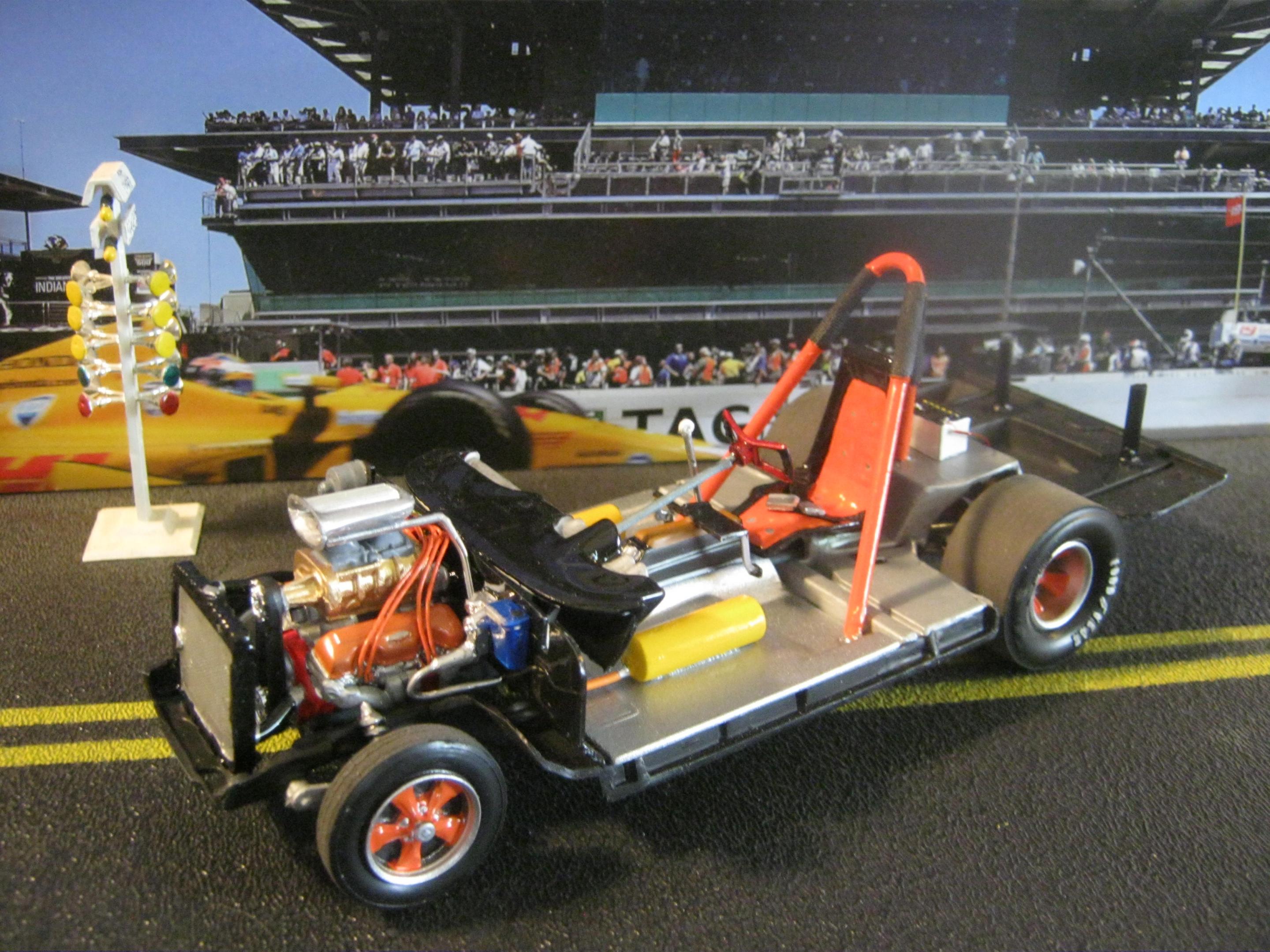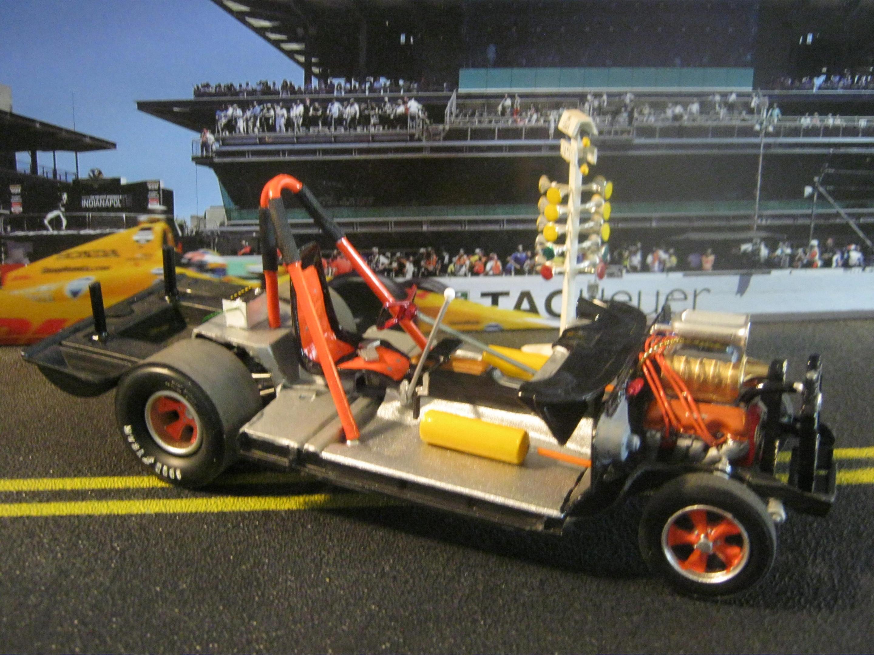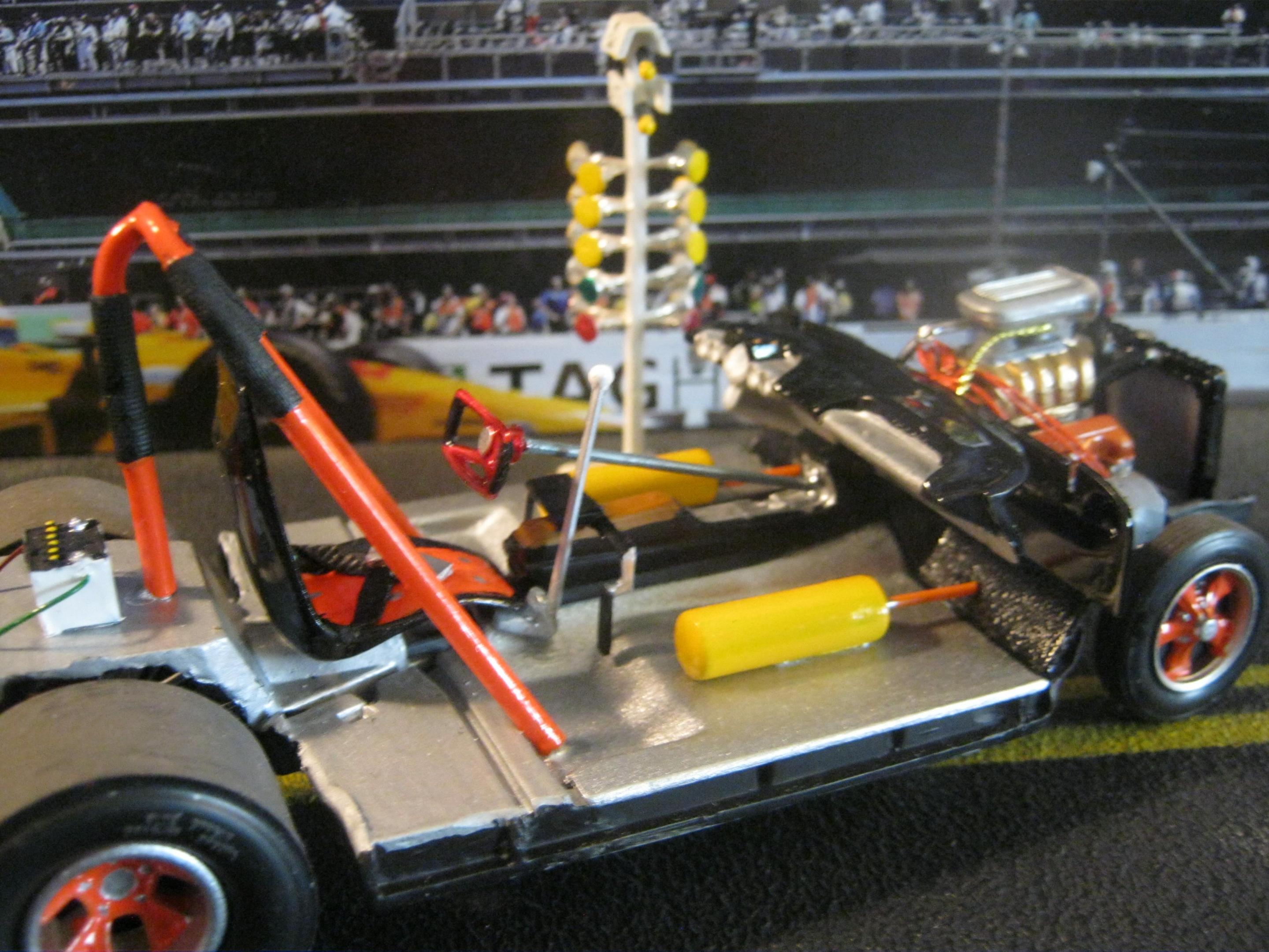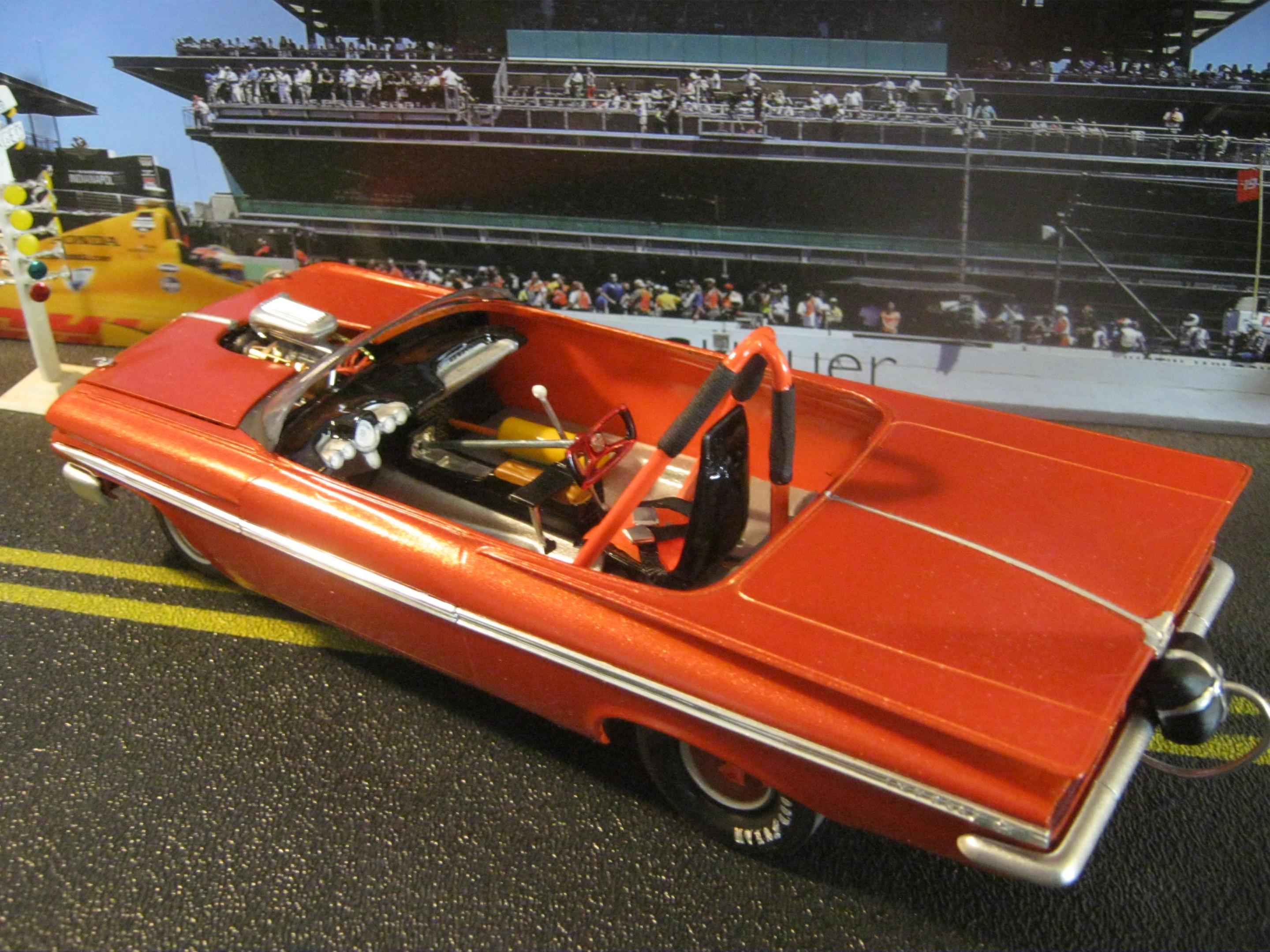 So,,the local drag car guy down the street{circa 1969 if you will} is drivin down a country road one day,,passes a farm or two,,and behind one of the barns he see's just the back tail shape of the 59' Impala,,so he drives up the driveway,,knocks on the door and asks if the Impala is for sale,,the farmer says yes,,but the motors blown,,needs brakes,,interior is shot,,but Ill let it go for 150$,,car guy pulls out 150$,,says thanks,,and rounds up a few buddies to tow back to shop in his garage,,and wants to build a open top drag car out of it,,,,,,,8 months later,, hes got the IMPALA "X". In reality,,this was a 5$ 1/2 built glue blob in a ziplock bag I got at the NNL Macomb county Mi a few years ago,,and decided to give it a whirrl. I have no idea what brand kit it is,,or what year it was mfg,,it was quite old though,,the glue on it was yellowed and just about dried out and cracked,,you could pull everything apart by hand. Custom cut the chassis to fit drag rear end/slicks,,installed straight front axle from x-tra parts bx,,installed a blown 409 from the x-tras bx,,everything else is from the leftovers parts boxes lying around the house. Hand dremmeled the windshield from leftovers stuff,,, rims + tires from the leftover parts bxs,, Drag headers installed also. made seat belts for it. Lookin forward to seeing "IMPALA X" some saturday night at the local strip! Cheers!