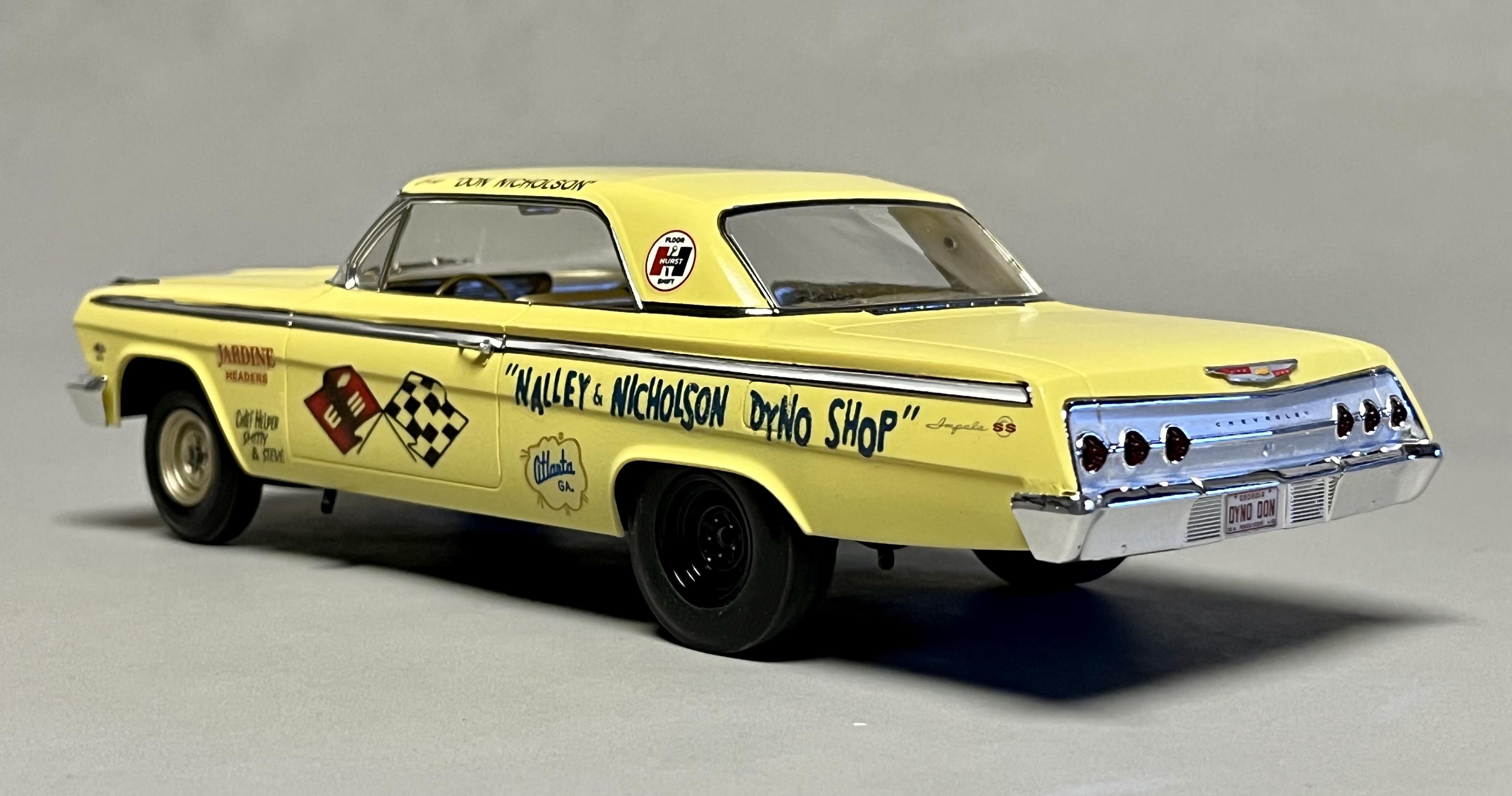 This is the third drag car I built as part of my "build five at one time" madness, Dyno Don Nicholson's '62 Chevy Impala 409 powered super stock. I used Revell's 1/25 kit and decals from SMP along with Fireball resin carbs and Detail Master distributor/ plug wires and some scratch-built fuel lines and linkage. I highly recommend this Revell kit, I encountered absolutely no issues and it looks very accurate IMO. Cheers, John