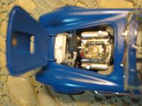 This one was fun! Ive had it for over a year. The engine and most of the suspension is all aluminumed out. The heads are flat black, there are red and blue fittings accents all over.The engine was my favorite part.This kit has a beautiful engine! The body was a quicky, I used krylon blue turned out decent. Sports car club of america sticker under the hood that you cant see cause of my useless camera. The drive shaft is not in there correctly but I dont wanna go back and fix it. Once again sorry for the poor photos. Enjoi!