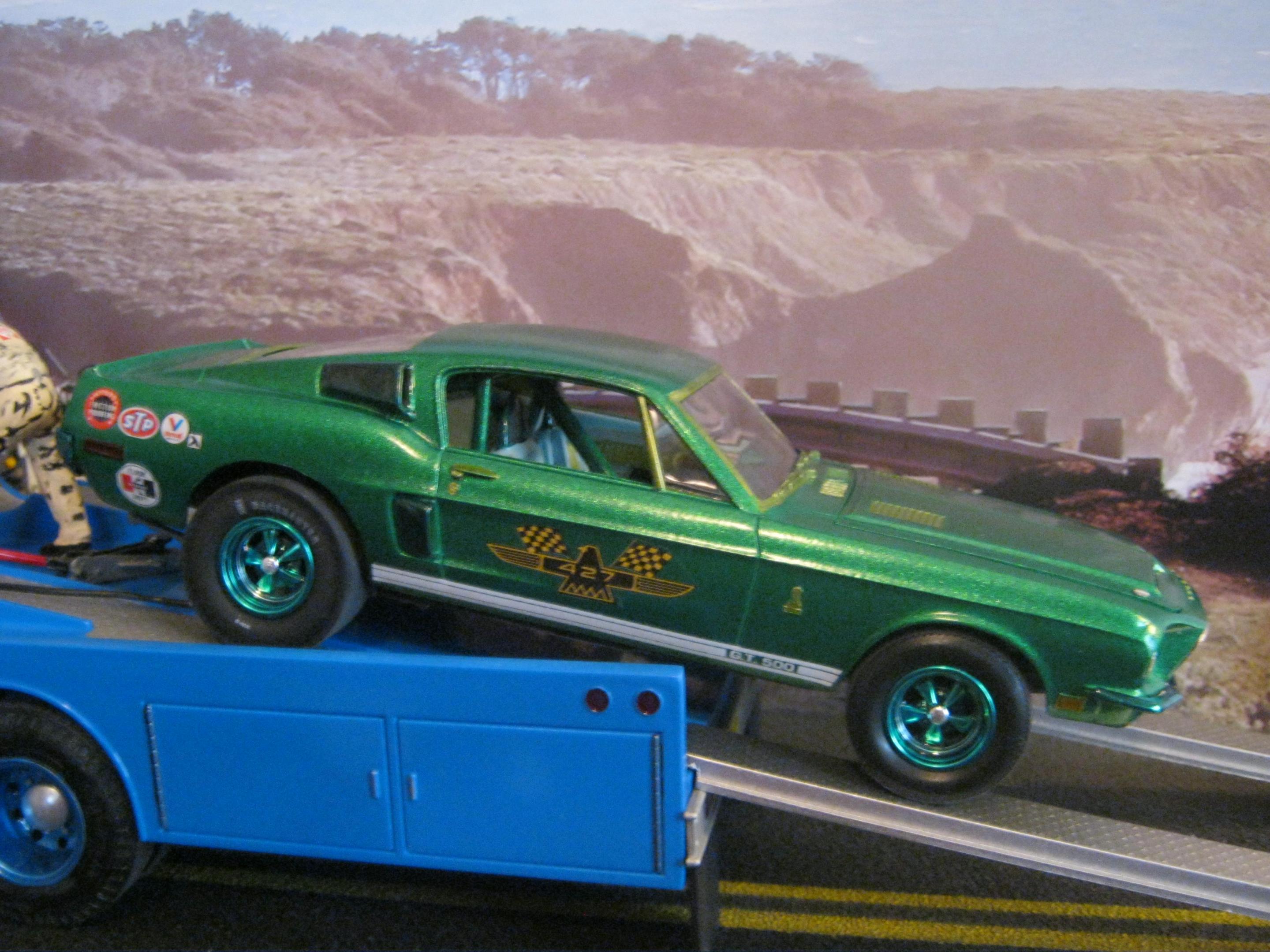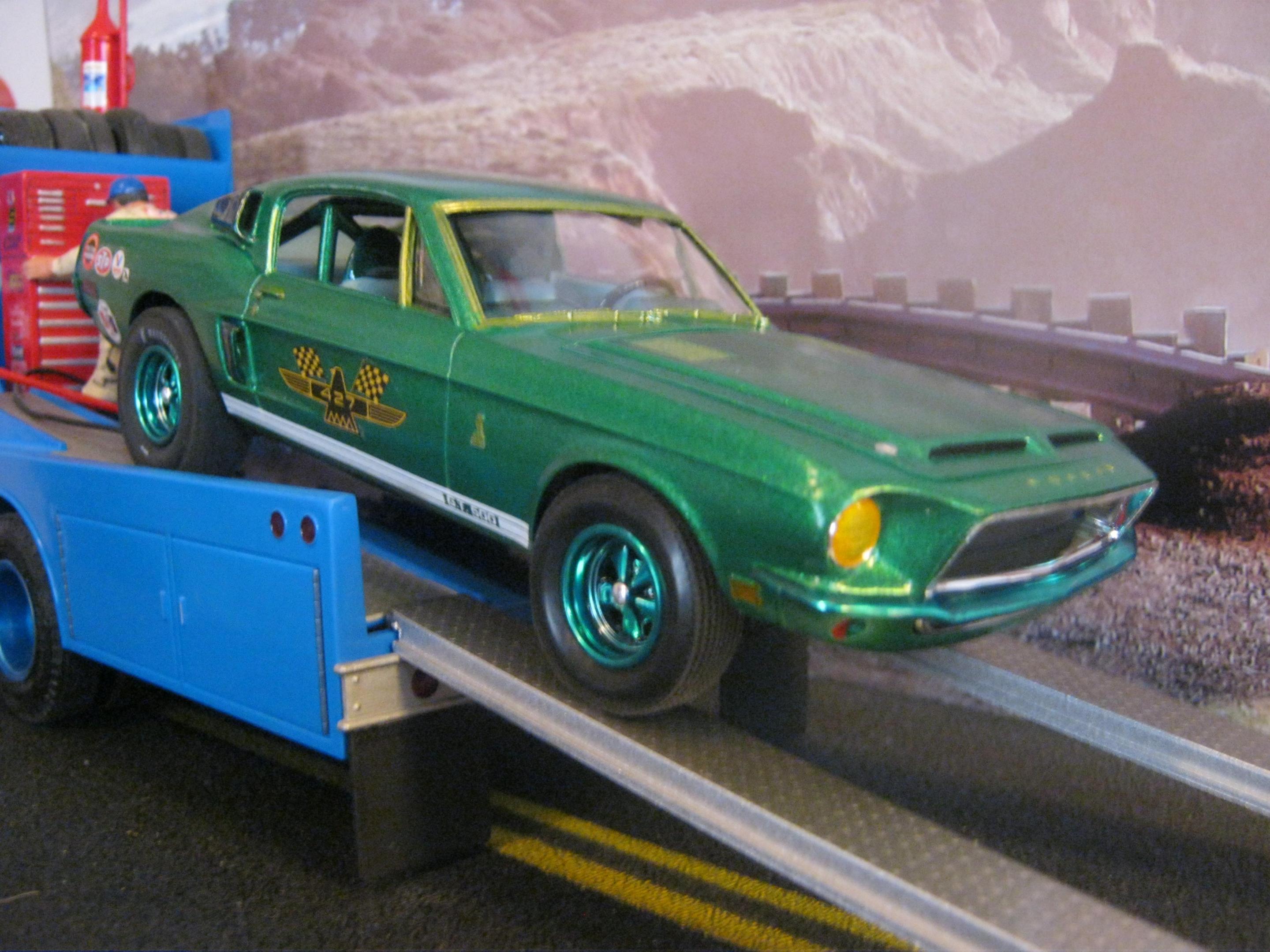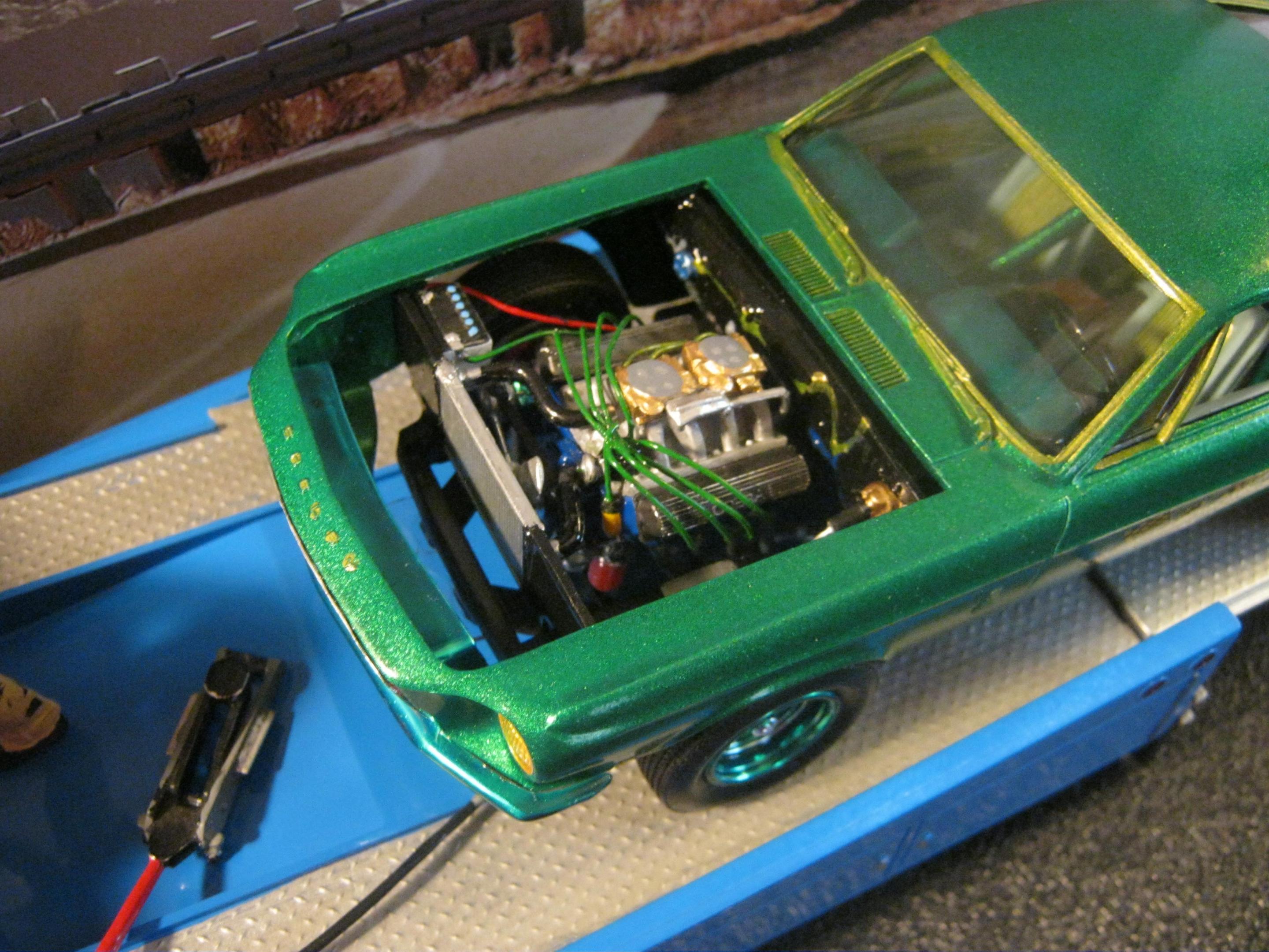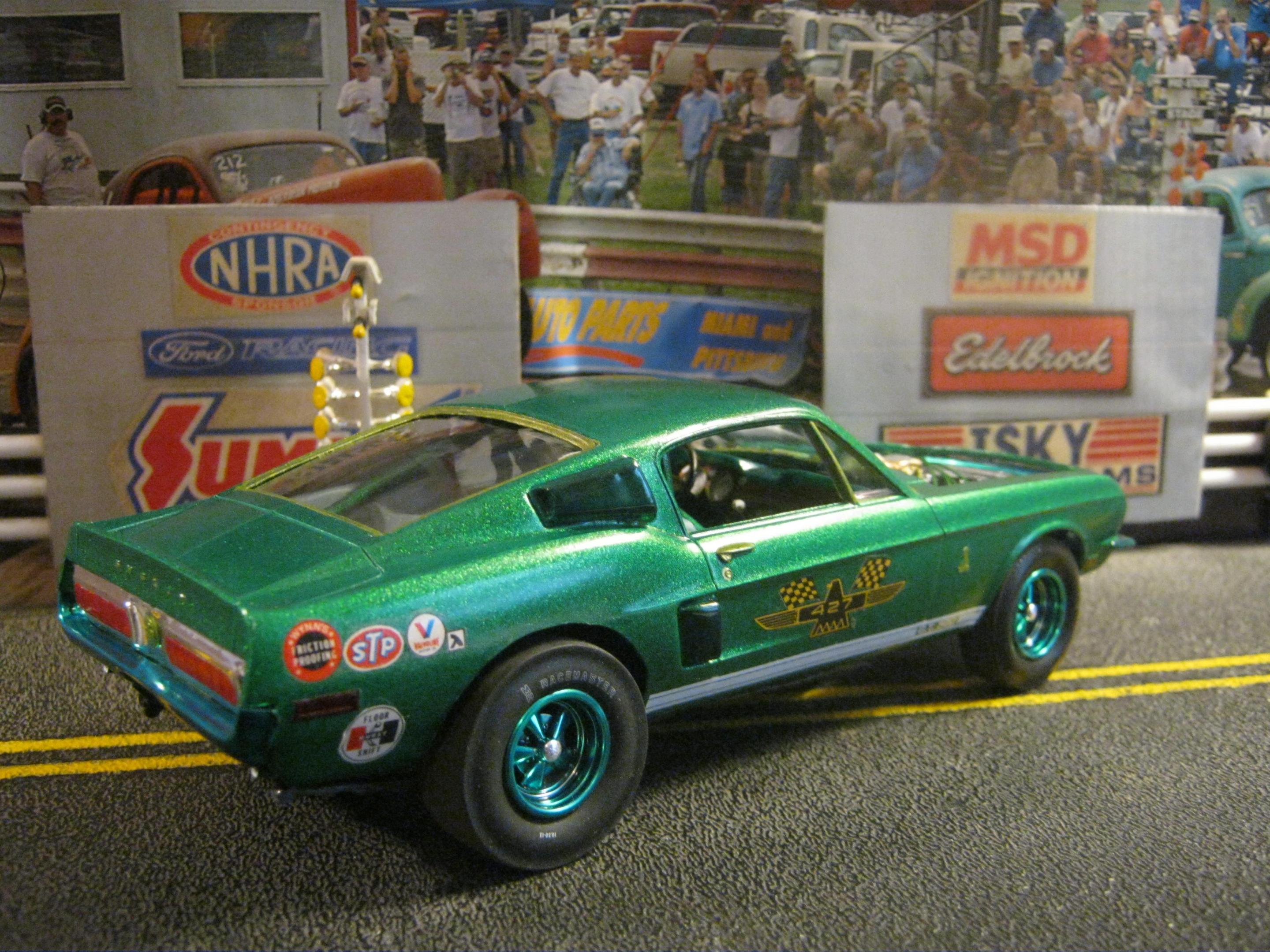 My gosh,,Im stuck on these late 60's Ford cars recently,,here I took the AMT Shelby GT500 kit and did a drag version,,additions not included in kit : Headrests,,seatbelts,,rollbar,,drag slicks,, cragar mags,,,opened up rear wheel wells,,drag headers instead of stock exhaust,,lower radiator hose,,decals from leftovers from my stash. Rattle can sprayed W/ Testors Mystic emerald green. Hand painted 2 tone interior w/custom mixed paints. Hand painted window trim{s} w/custom mixed paints. Dremmel cut+ removed engine bay wheel wells. {so drag headers would clear} I did have to dremmel the top of gearbox down to get interior bucket to lay level so the entire assembly w/body on chassis was level,,but other than that it went together well. It will make a nice addition to the shelf display next to the Lawton stang. Wishing all a happy spring and hope its warming up where you are!