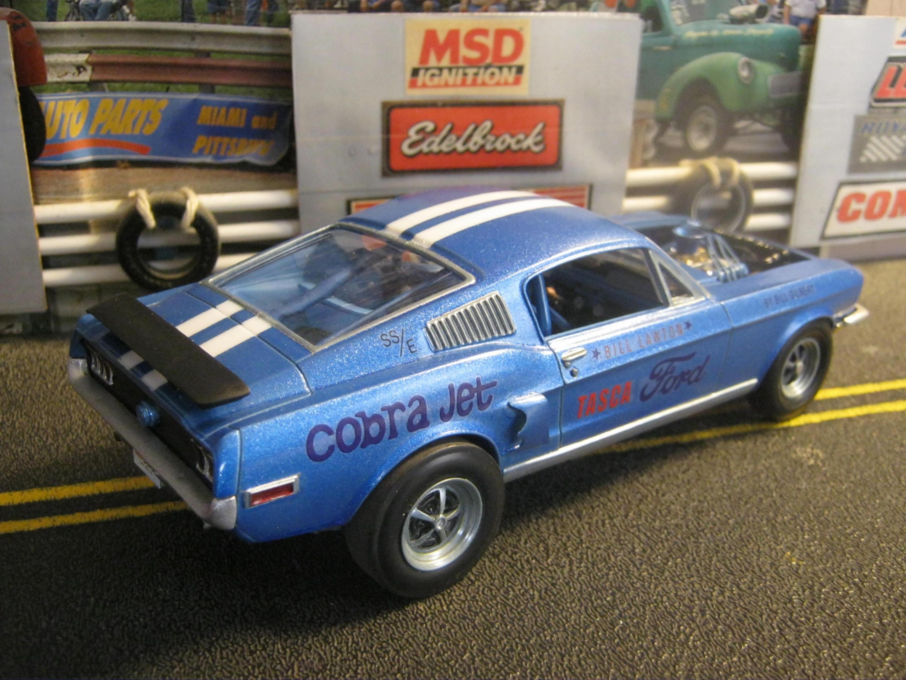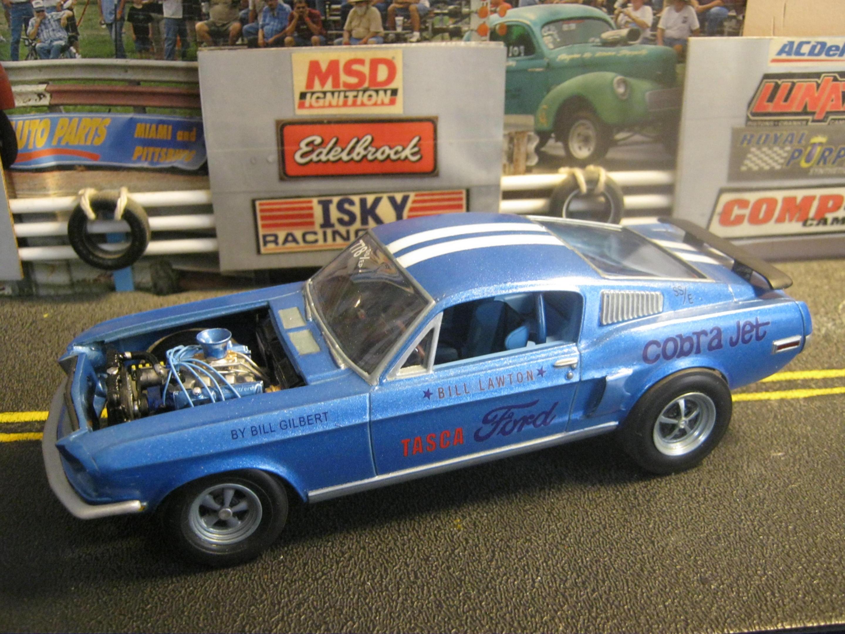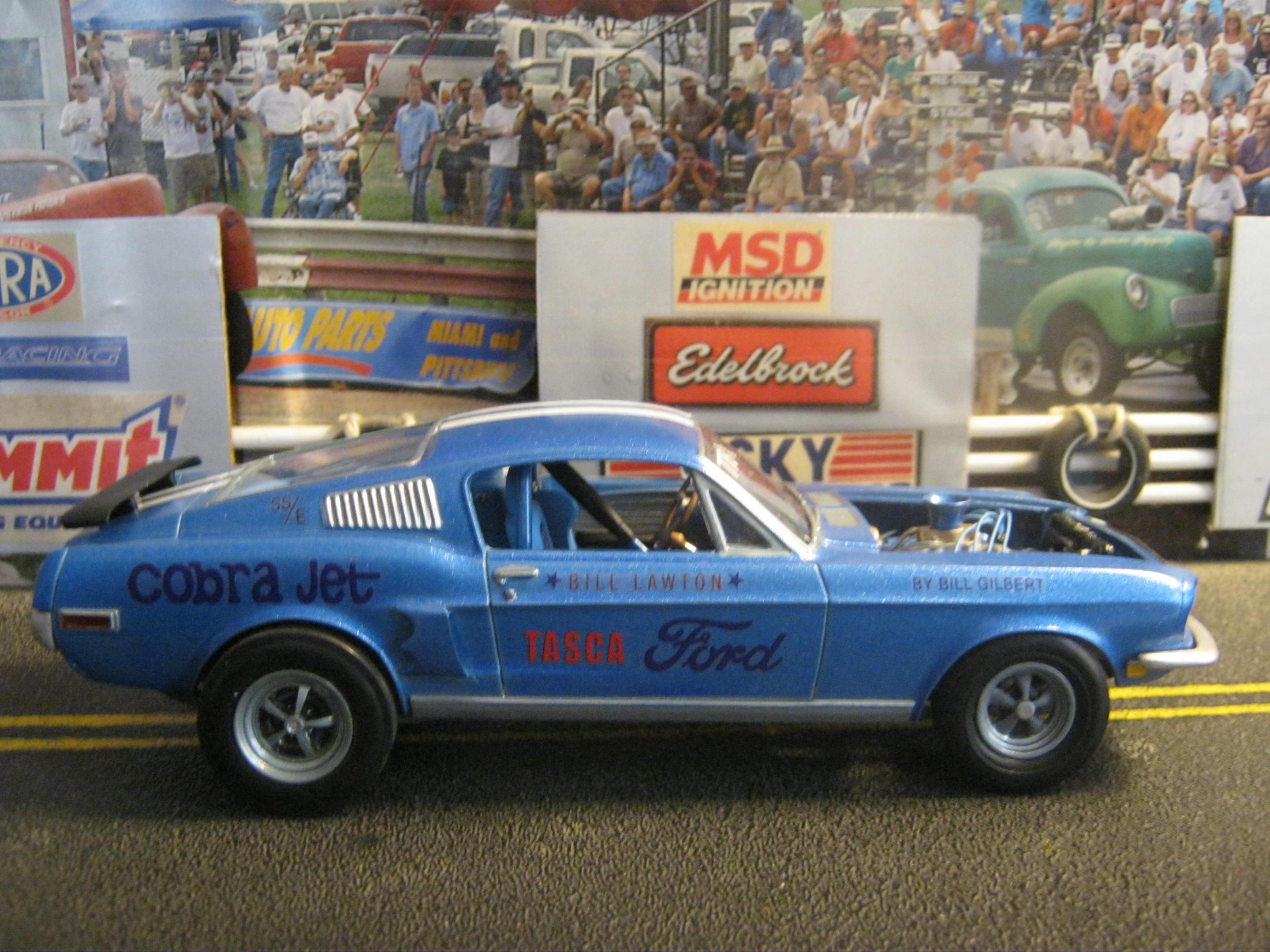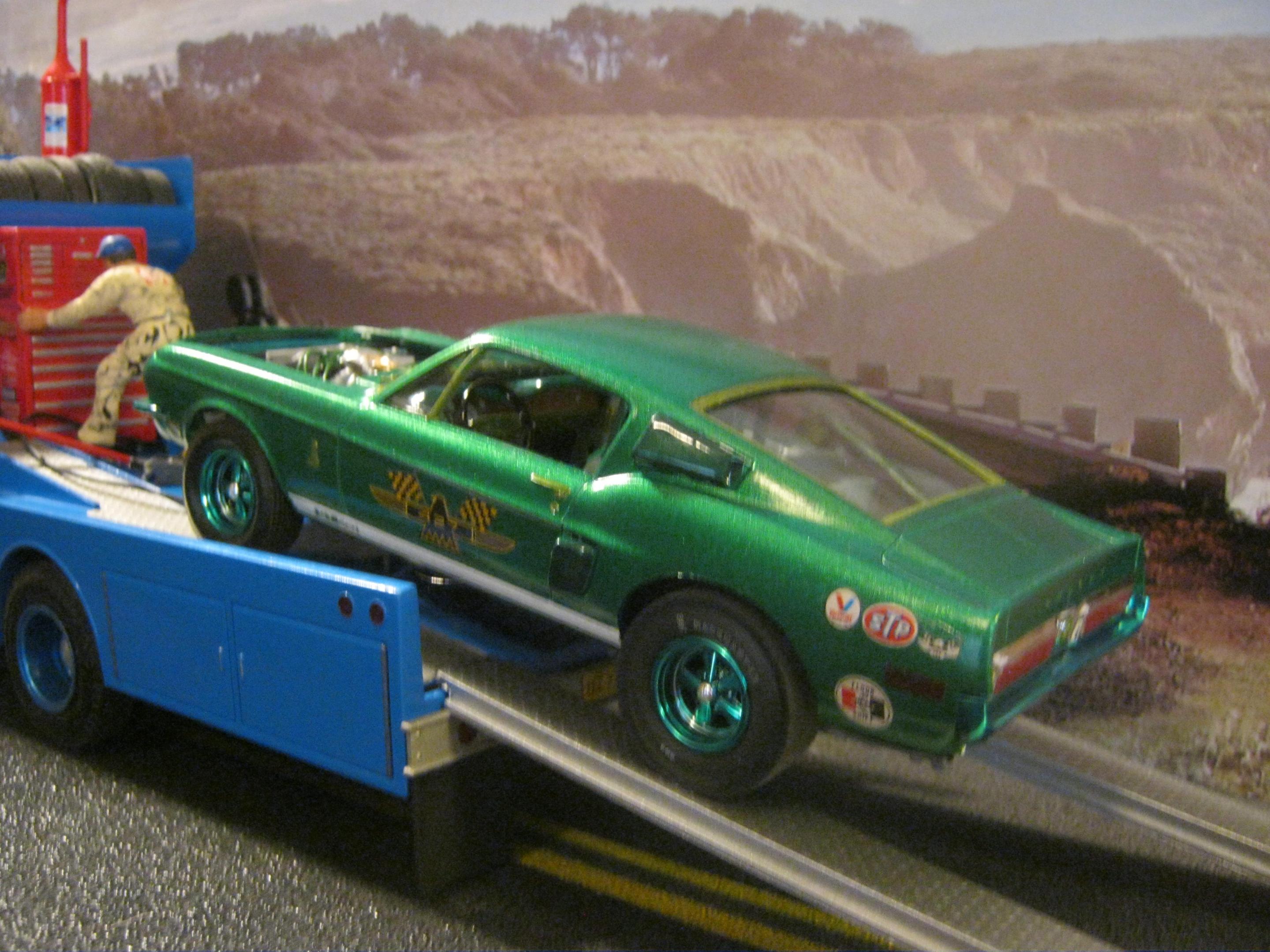 My gosh,,Im stuck on these late 60's Ford cars recently,,here I took the AMT Shelby GT500 kit and did a drag version,,additions not included in kit : Headrests,,seatbelts,,rollbar,,drag slicks,, cragar mags,,,opened up rear wheel wells,,drag headers instead of stock exhaust,,lower radiator hose,,decals from leftovers from my stash. Rattle can sprayed W/ Testors Mystic emerald green. Hand painted 2 tone interior w/custom mixed paints. Hand painted window trim{s} w/custom mixed paints. Dremmel cut+ removed engine bay wheel wells. {so drag headers would clear} I did have to dremmel the top of gearbox down to get interior bucket to lay level so the entire assembly w/body on chassis was level,,but other than that it went together well. It will make a nice addition to the shelf display next to the Lawton stang. Wishing all a happy spring and hope its warming up where you are!