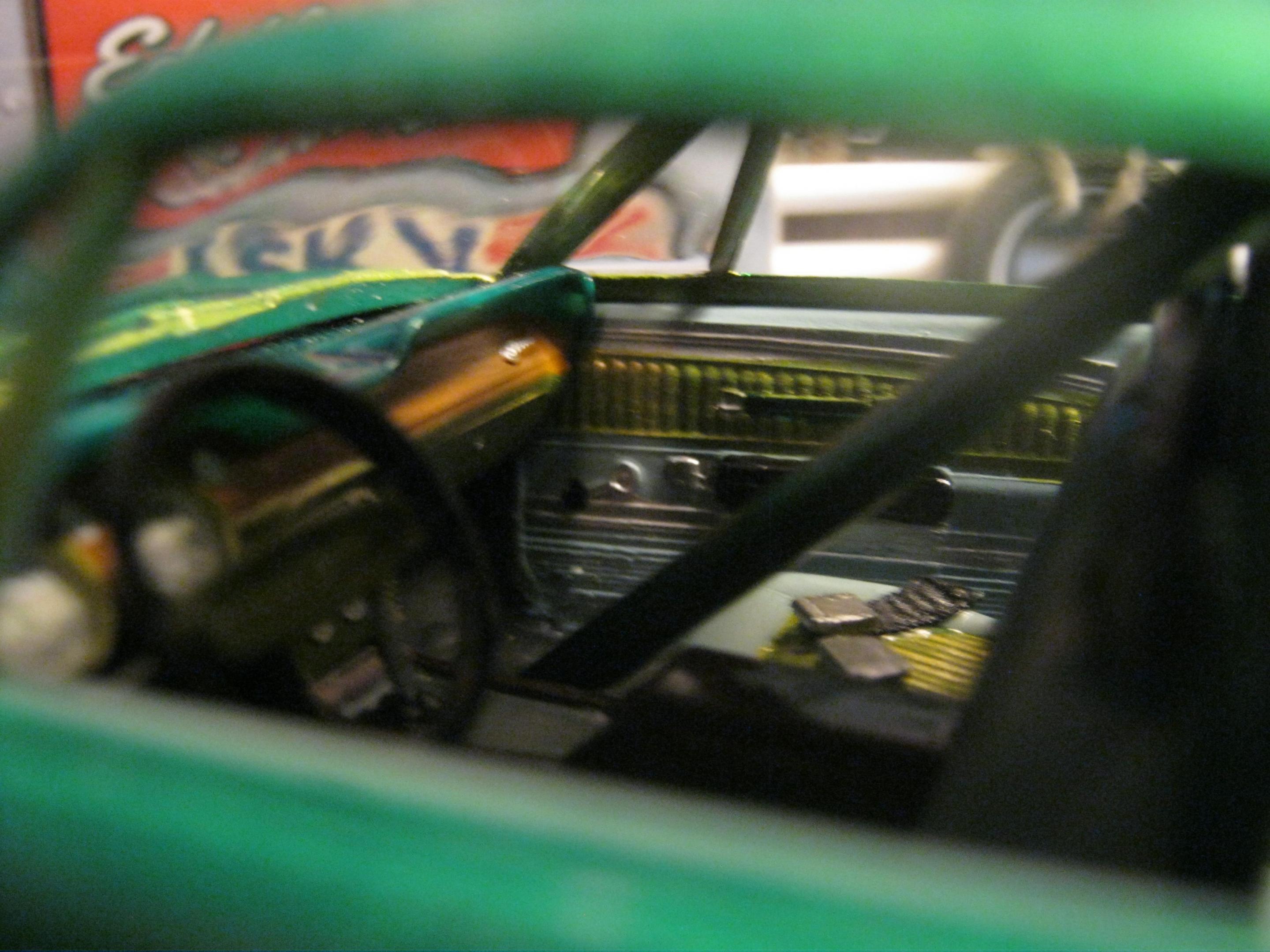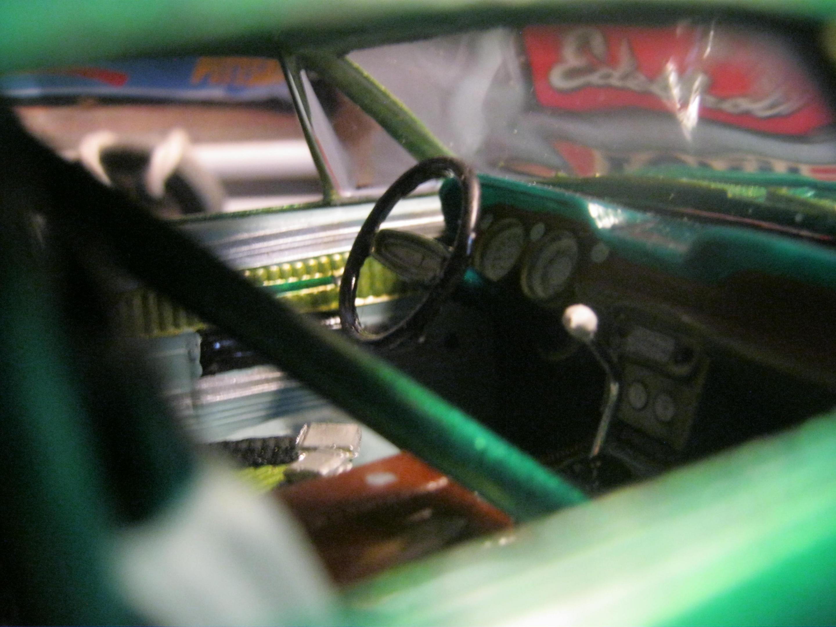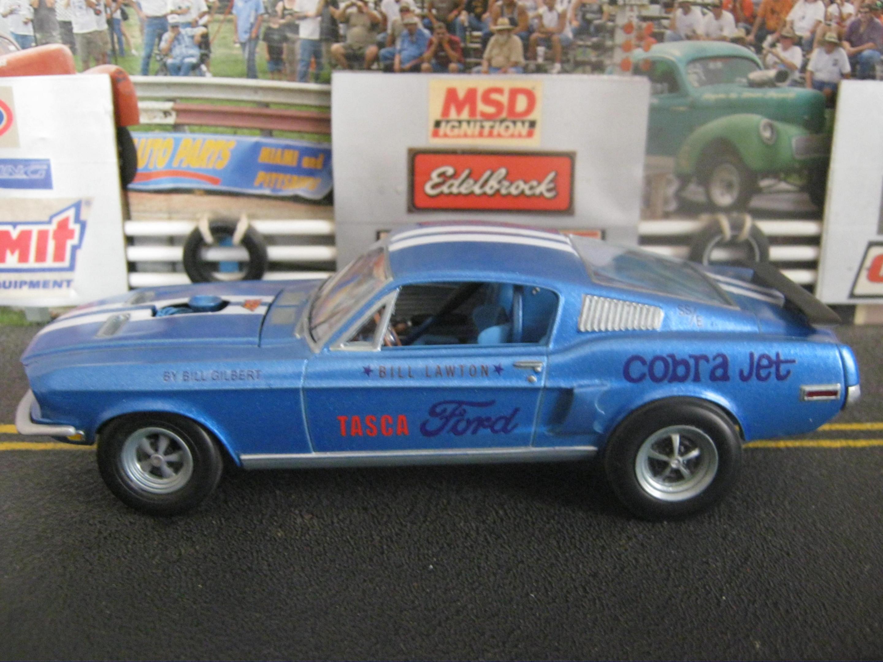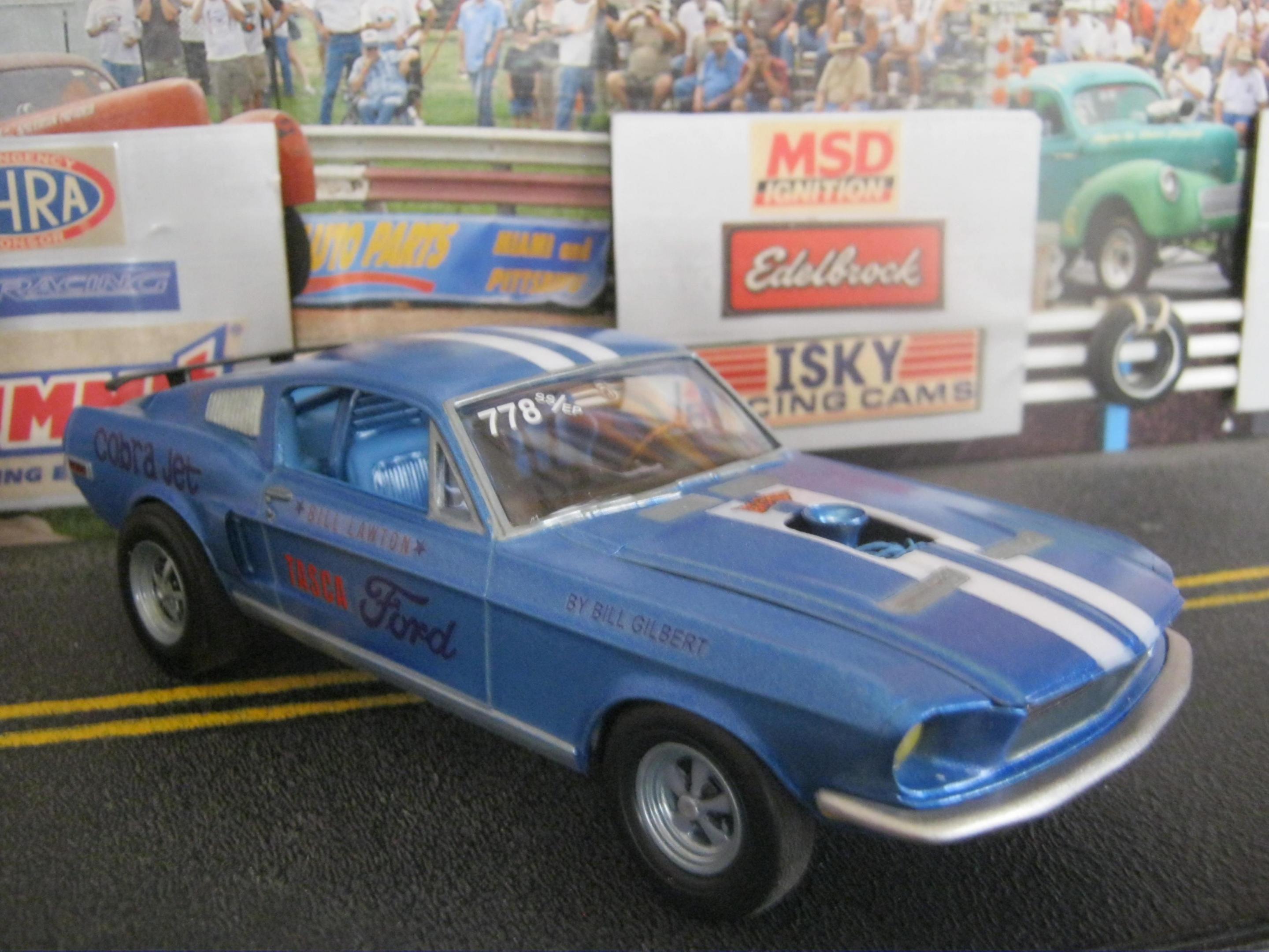 My gosh,,Im stuck on these late 60's Ford cars recently,,here I took the AMT Shelby GT500 kit and did a drag version,,additions not included in kit : Headrests,,seatbelts,,rollbar,,drag slicks,, cragar mags,,,opened up rear wheel wells,,drag headers instead of stock exhaust,,lower radiator hose,,decals from leftovers from my stash. Rattle can sprayed W/ Testors Mystic emerald green. Hand painted 2 tone interior w/custom mixed paints. Hand painted window trim{s} w/custom mixed paints. Dremmel cut+ removed engine bay wheel wells. {so drag headers would clear} I did have to dremmel the top of gearbox down to get interior bucket to lay level so the entire assembly w/body on chassis was level,,but other than that it went together well. It will make a nice addition to the shelf display next to the Lawton stang. Wishing all a happy spring and hope its warming up where you are!