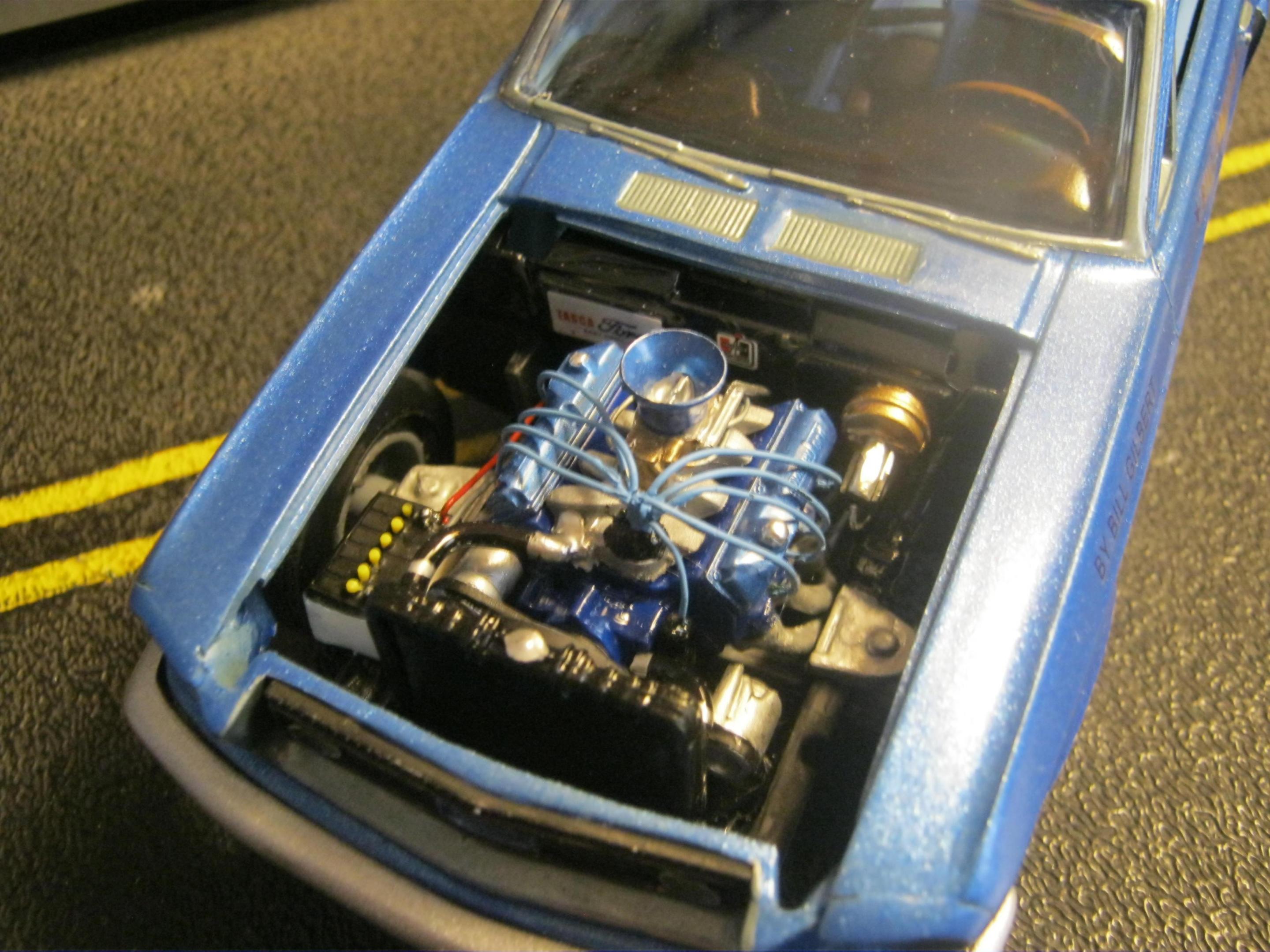 Howdy all,,this is the Revell muscle series 2n1 kit,,I decided to do the race version. And as always I do a different paint scheme than what is normally pictured on box art. Here I was in a "Shelby" N "Shindona" mood when I built this,,hence the blue w/white stripes,,and the spoiler on trunk,,blacked out rear lens area. Air scoops on sides behind doors. Revell did a great job with the motor choices,,interior and everything else,,, looks good,,but I dont understand the design of the rims with the "ribs" going all around the insides making it near impossible to mount the tires on? Really? I always like the traditional 2 pc rims that can be put together 1/2 at a time as I always paint my rims one way or another on most builds. And after painting these I kept the front rims after dremmeling off "The Ribs" on rims for front,,and changed the back rims to traditional Rally 2 pc rims. Used testors quikdry blue,,hand painted the rest, all in all,,I happy with the kit,,I have yet to build the Hemi Cuda Muscle series kit,,fun kits ,,and they look decent when done. We now return you to your regularly scheduled program.