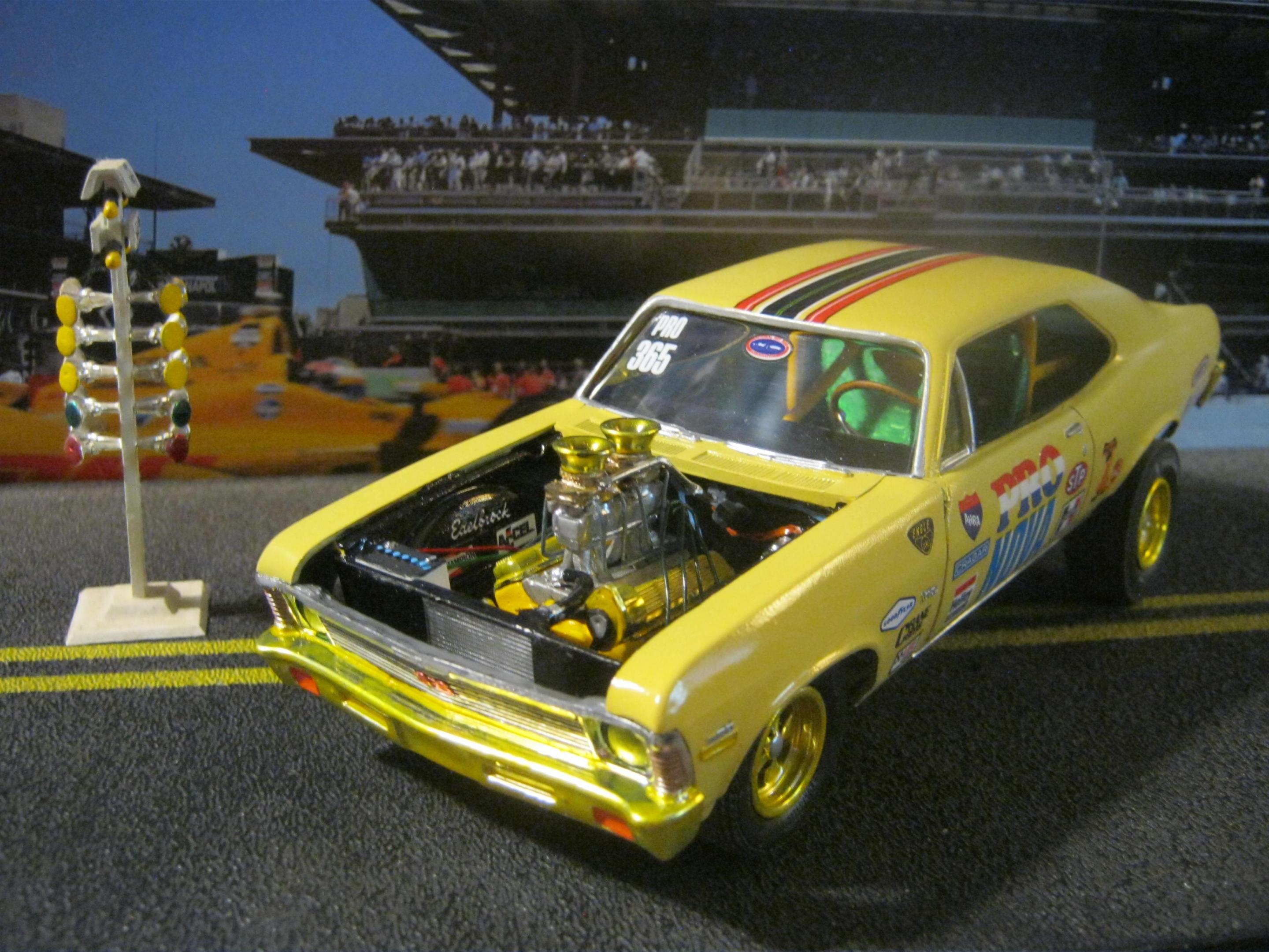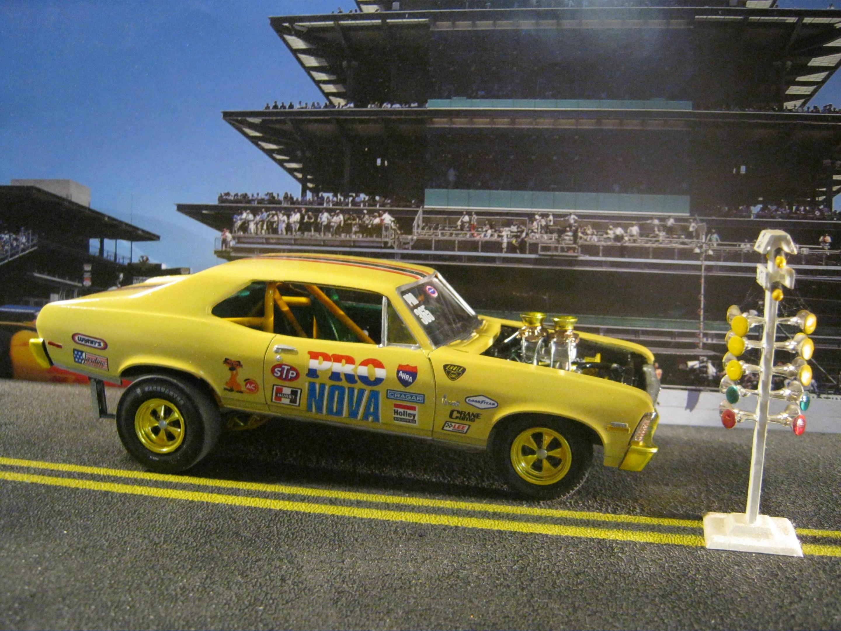 G'morn,,hope your summer has been a good one. Ive been visiting Hobby Lobby these days,,every other week they a 40% off on kits. So,,for 13$ you can get quite a few cool kits,,maybe not the latest releases but still some fun kits to do. And here is the "Ol Pro" Nova everyone has seen for many years,,a cool kit,,aside from the separate front fenders that have to attached before painting{really?} But the motor and the rest of the features that come in the kit are great,,the decal sheet has many product brands to choose from,,very nice. I did the 70's version,,"jacked,,Stacked,,shackled up rear" Some basic wiring ect,,pretty much what I do to all my builds,,not a contest car,,just a nice one for the shelf! Rattle can sprayed hardware store paint,,testors bottle paint for everything else. Enjoy whatever you may have on the build bench! Cheers! SS