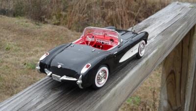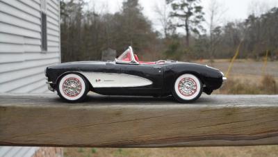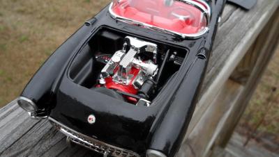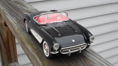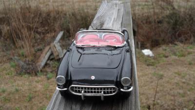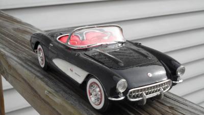 Got this kit a couple weeks ago. It's a Monogram kit. I've been wanting a 57 for awhile now, so I thought I'd pick it up. The kit isn't too bad, but I did have some issues. The glass for the windsheild was bigger than the frame! I also had an issue with the front suspension fit. There is also a hole for a radiator hose on the engine, but no hose, nor mention of one in the directions. I also hate the lack of decals. However, I think it came out well. I found a picture of a car just like it and copied the paint scheme. I wanted a two tone interior, and I liked the paint scheme of the inspiration car.