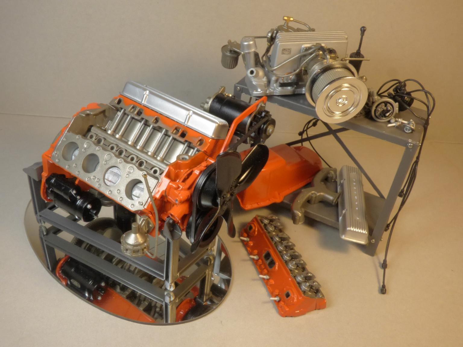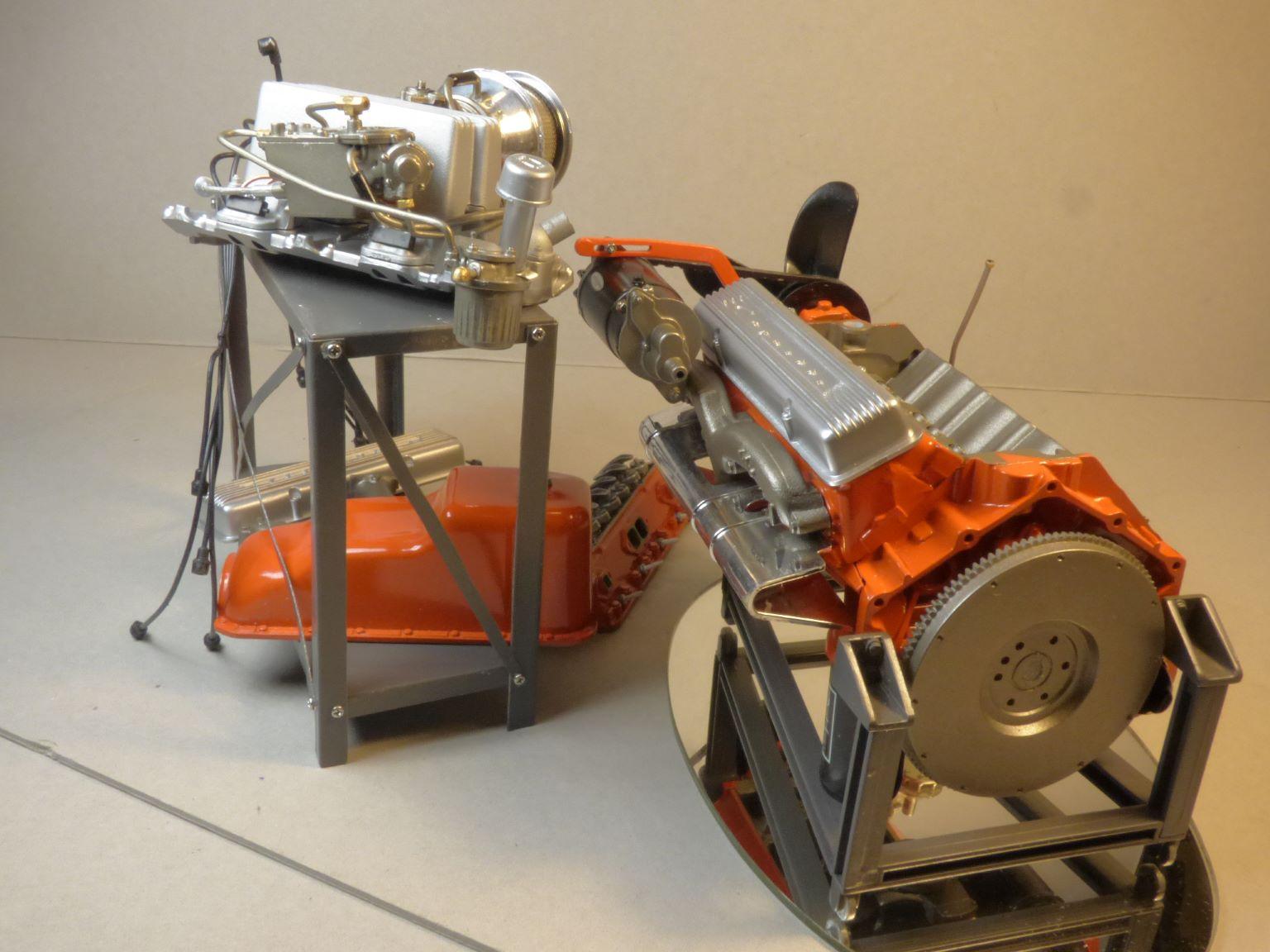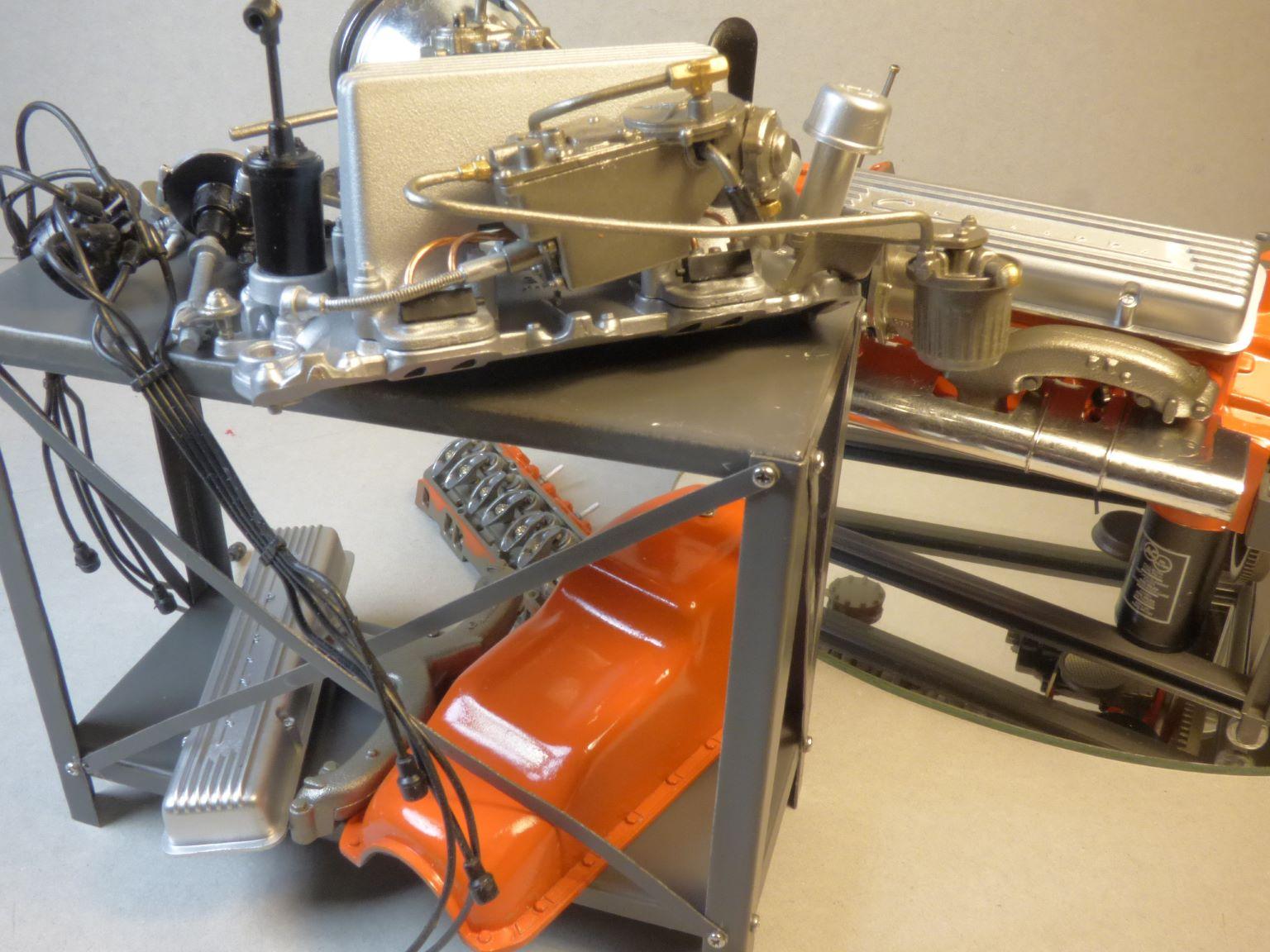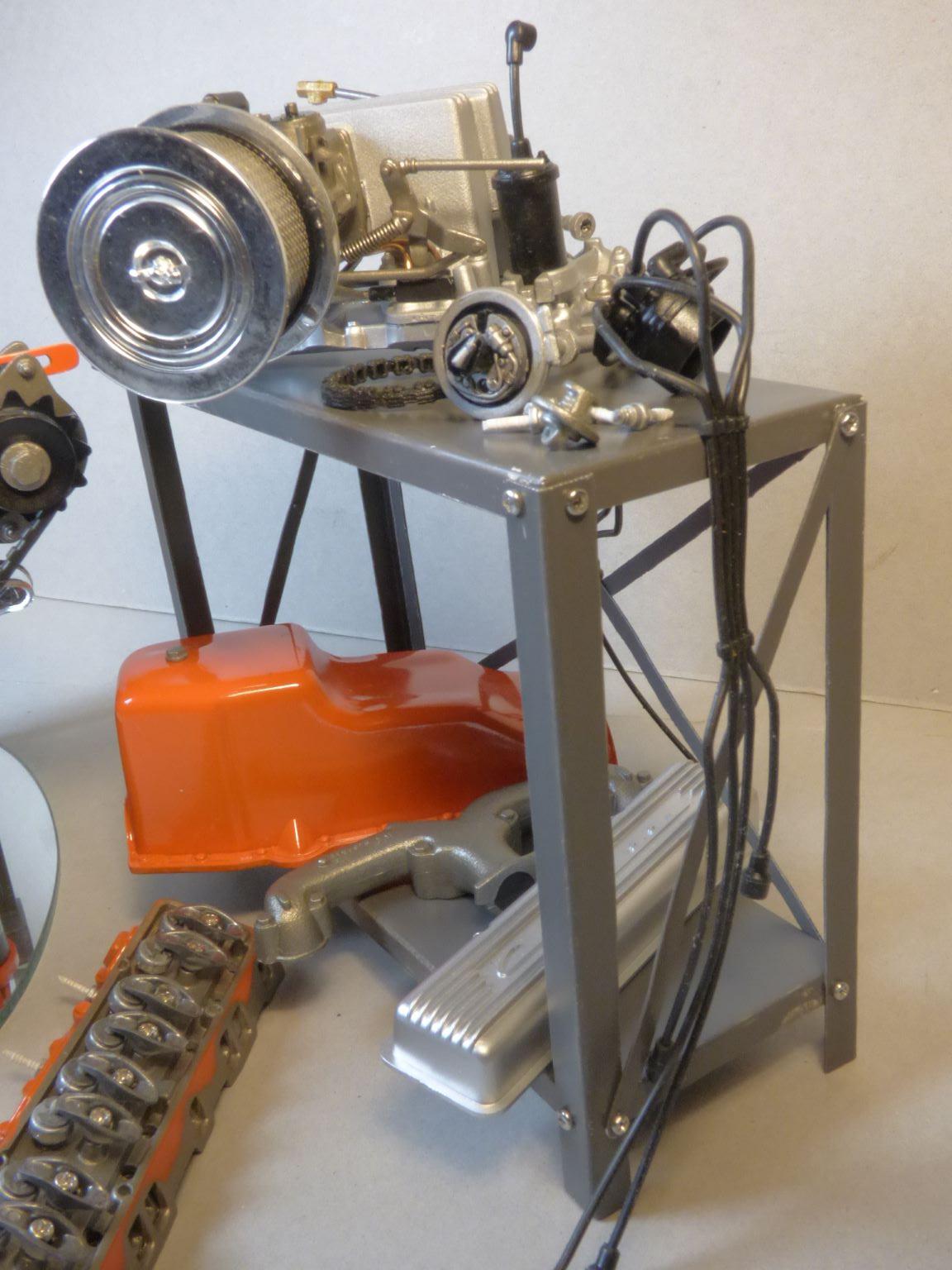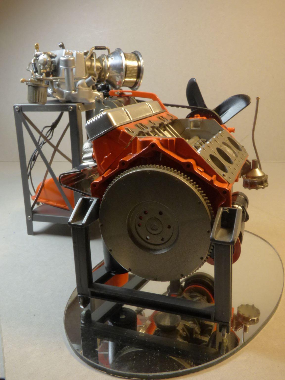 I have been working on this one off-and-on forever and as work progressed the plan kept changing as how to complete and display it. In the beginning it was just going to be built completely box stock but as it started coming together I hated to hide all the inside details. So finally it ended up as an engine in the middle of either assembly or disassembly. I built a little set of shelves to keep all those loose parts in order. I found a mirror at the local thrift shop that was the perfect size to under the main engine but was a little disappointed that it doesn't really show the underside very well. Added a few screws and bolts for extra detail. After I was done I wish I would have drilled out all the mounting holes of the unattached parts but at that point I couldn't bare to mess up the paint job.