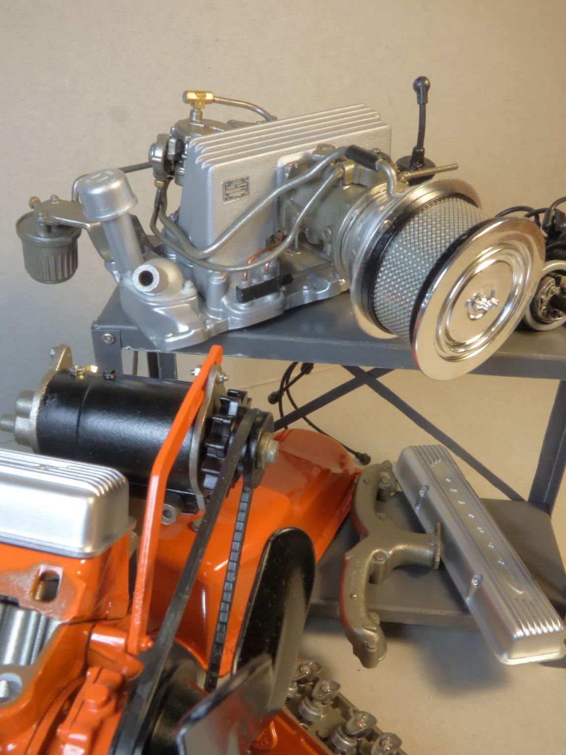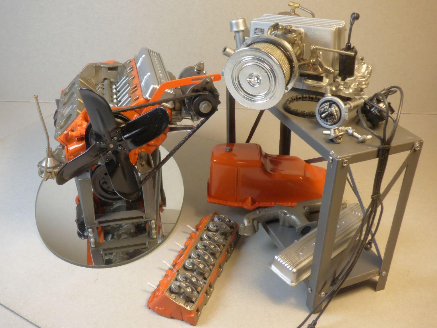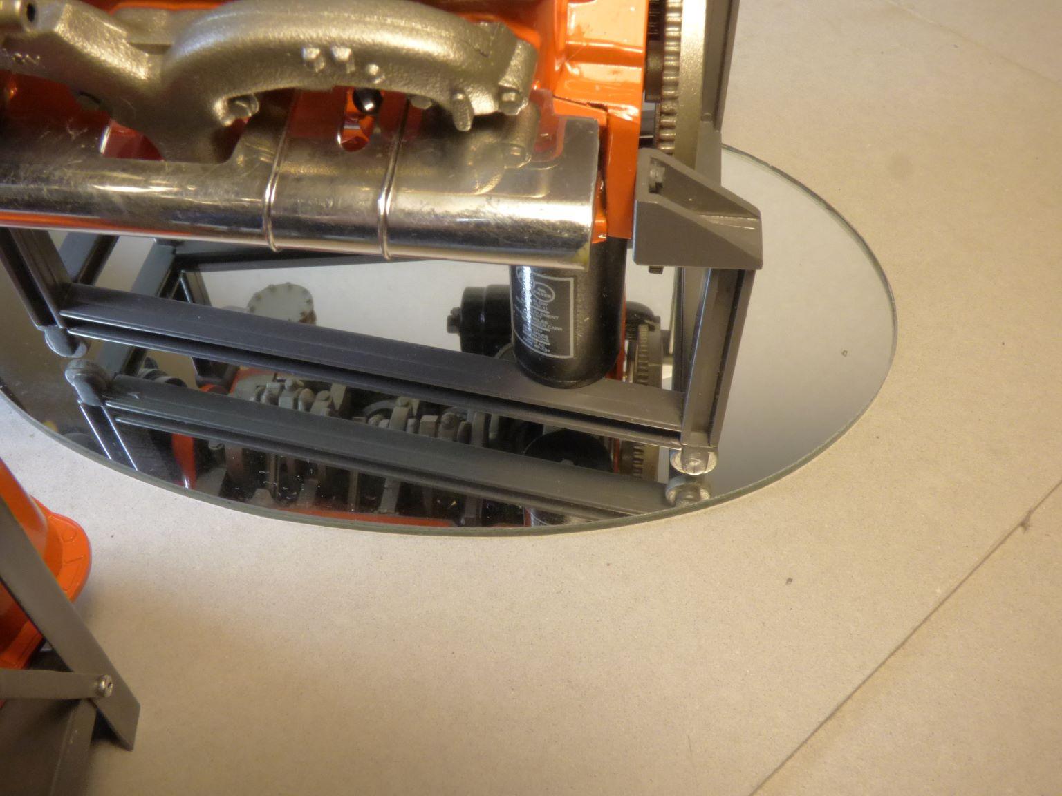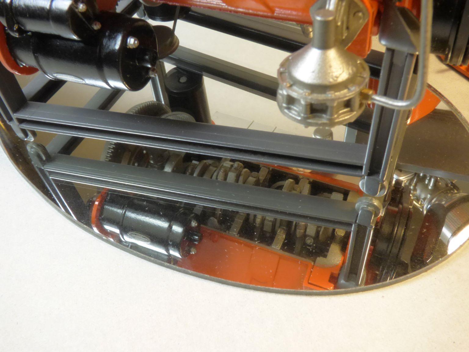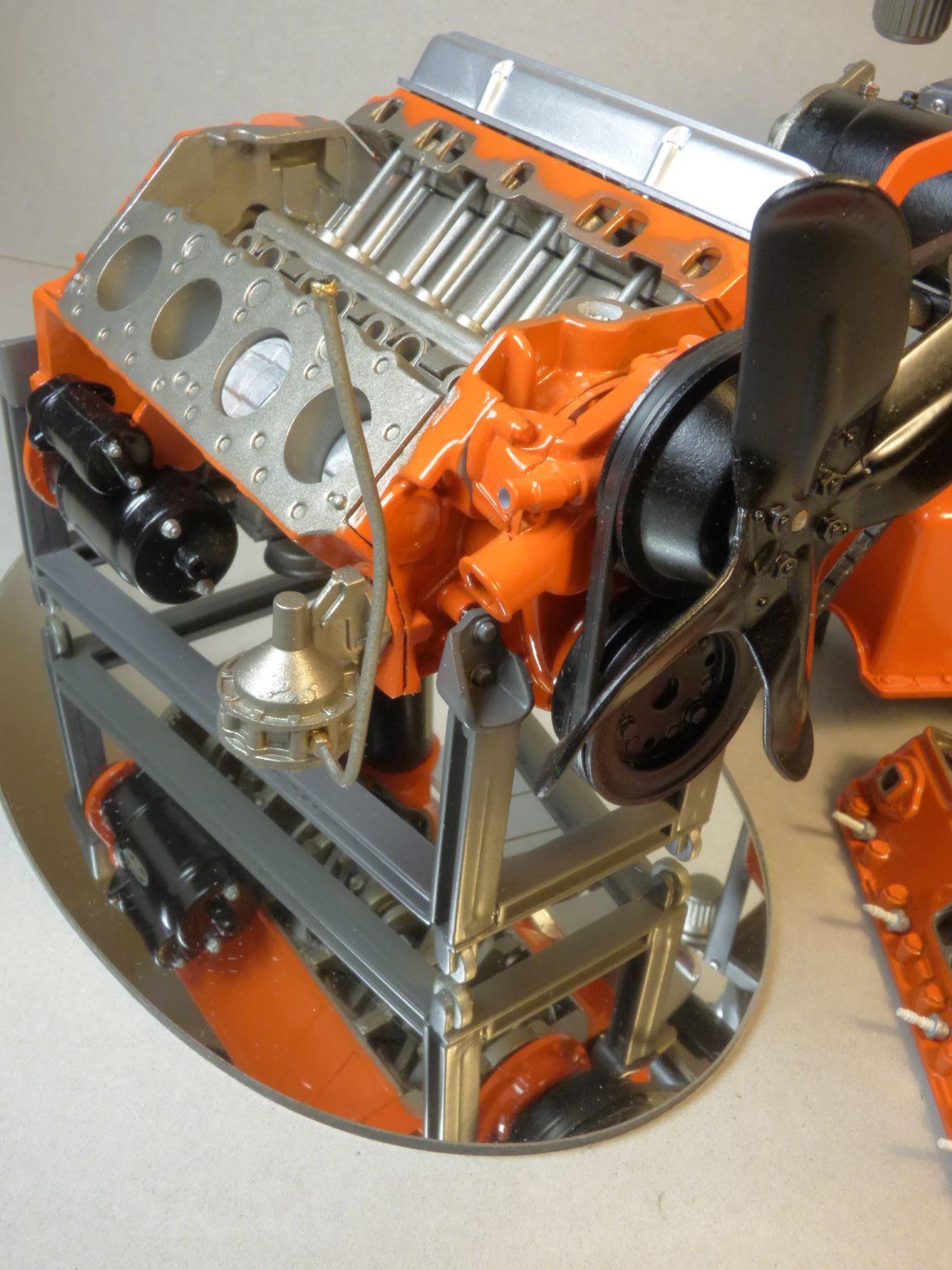 I have been working on this one off-and-on forever and as work progressed the plan kept changing as how to complete and display it. In the beginning it was just going to be built completely box stock but as it started coming together I hated to hide all the inside details. So finally it ended up as an engine in the middle of either assembly or disassembly. I built a little set of shelves to keep all those loose parts in order. I found a mirror at the local thrift shop that was the perfect size to under the main engine but was a little disappointed that it doesn't really show the underside very well. Added a few screws and bolts for extra detail. After I was done I wish I would have drilled out all the mounting holes of the unattached parts but at that point I couldn't bare to mess up the paint job.