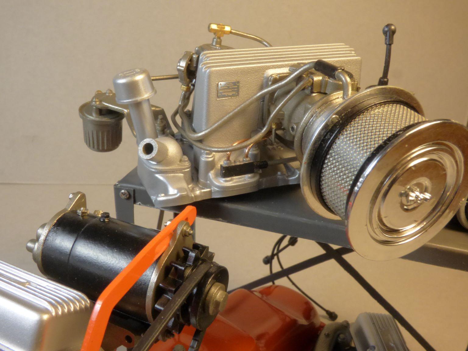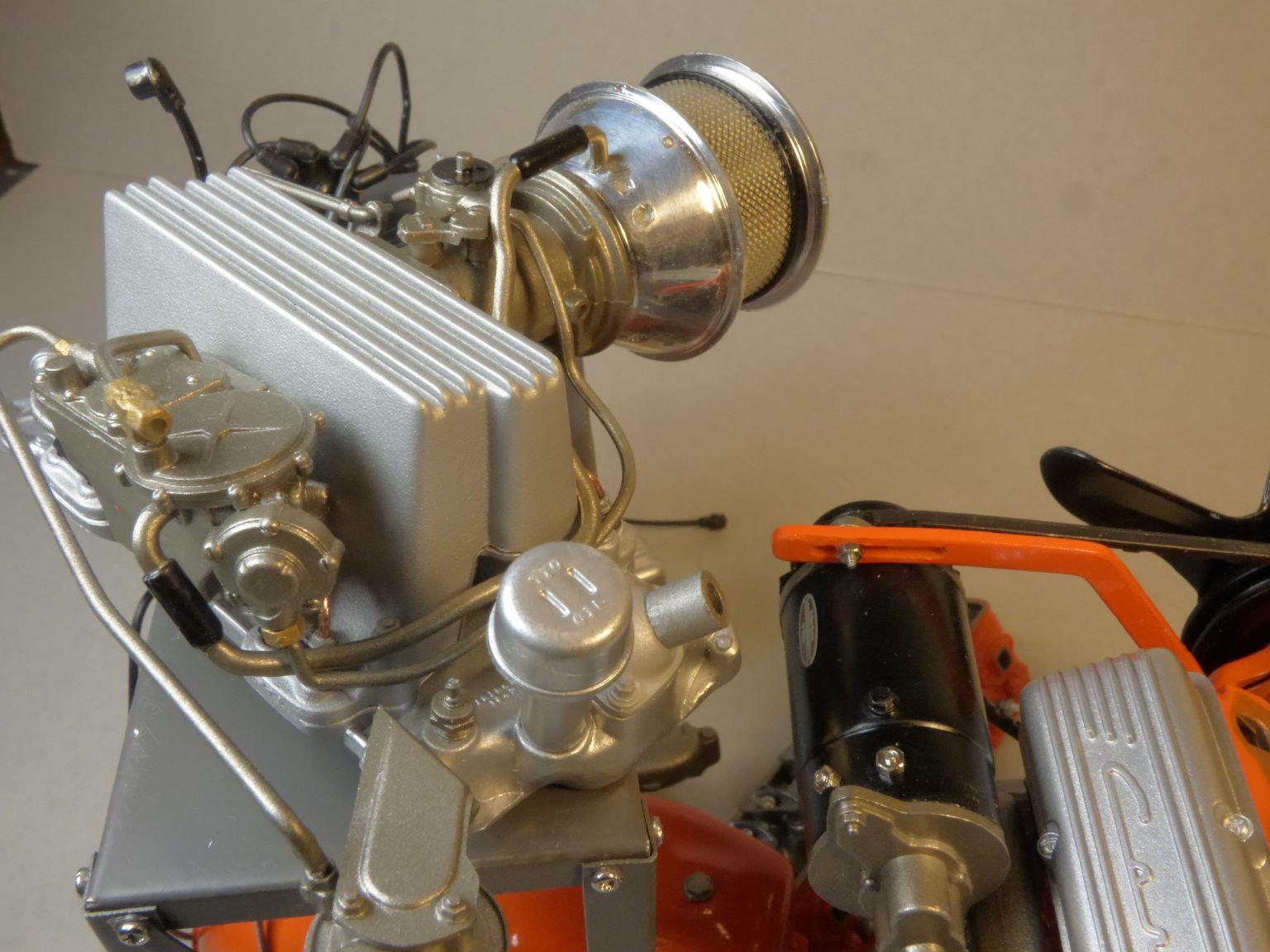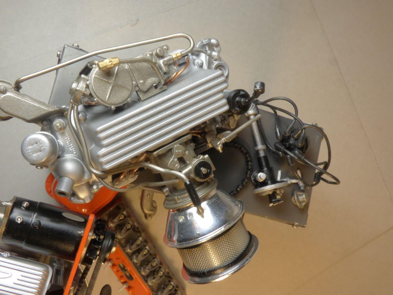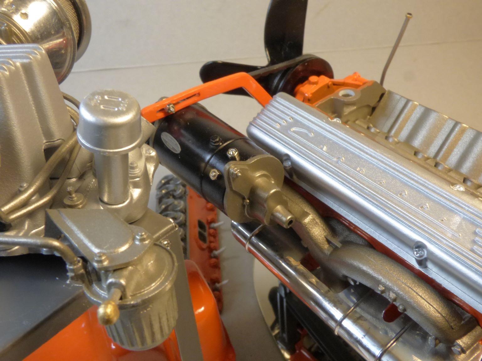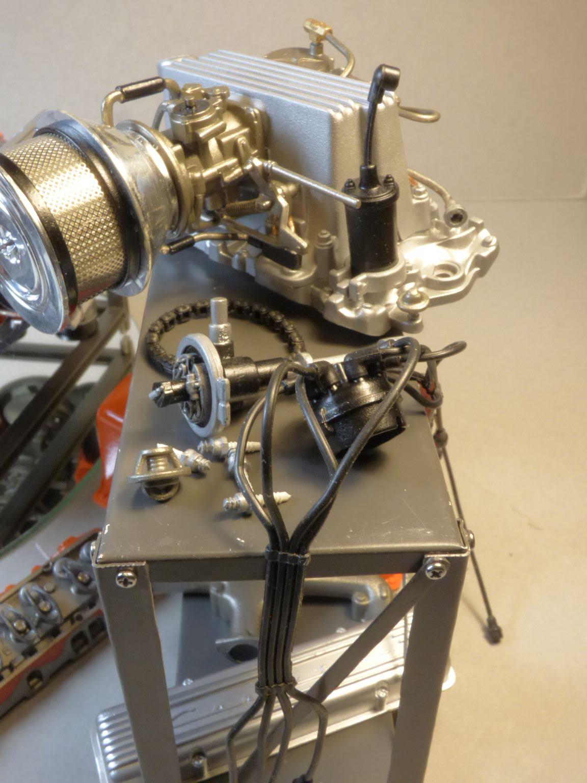 I have been working on this one off-and-on forever and as work progressed the plan kept changing as how to complete and display it. In the beginning it was just going to be built completely box stock but as it started coming together I hated to hide all the inside details. So finally it ended up as an engine in the middle of either assembly or disassembly. I built a little set of shelves to keep all those loose parts in order. I found a mirror at the local thrift shop that was the perfect size to under the main engine but was a little disappointed that it doesn't really show the underside very well. Added a few screws and bolts for extra detail. After I was done I wish I would have drilled out all the mounting holes of the unattached parts but at that point I couldn't bare to mess up the paint job.