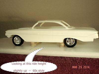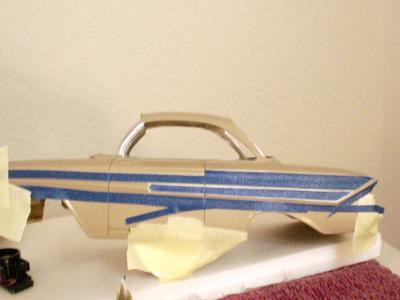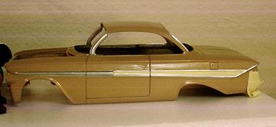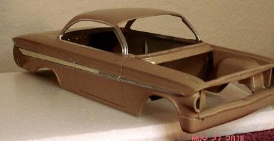 Hi All.. Started a new project--the 67 442 Wagon is on hold for a while..This is a 61 Impala, built like the real one I owned many years ago..It is a light tan with matching two tone interior, not the real original color but.close as I can get to something I had back in the 60s.. The original was a 348 cu in - 350 hp - three two barrel - solid lifter cam - 4spd - car. Trying to make as close as possible to what I had back then ...It was a fun car to tool around in back in the day- not a killer race car but fun.... Enclosed are some pic's of it in various stages. I tried BMF but it did not work--don't know why ( maybe old ) so I am carrying on old school and Painting Chrome Trim. Pics are of progress with that paint before I clear it. In pic's it is sanded with 6000 Grit Wet Sandpaper and waiting for clear. Enjoy. Comments Suggestions or just plain Chit Chat are welcomed- and looked forward to. Thanks Tom 60s era