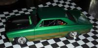 After the struggle I went through on JerrysCherrys figuring out how to post pictures, I doubt I'll dive into Photobucket for a while. However, if you're a member there, go to the "help" forum and you finally find a thread from me with thumbnails of 4 shots of my car. If you click on them, you'll see the body, engine, driver's compartment and finally the total build shot. After following directions, I shot 3-4 coats of clear and it was on the last one the clear bubbled from shooting too close, almost like soap after washing your hands. I failed at wet sanding with 12000 as the clear wasn't set. Luckily, the thing causing the problem (pactra gold striping) which hung the clear from slowly dissolving down the side of the driver's door was stripped off and I reapplied a different pattern which covered the mess. I'm hoping for one more shot at a body offered for shipping only and I intend to drop the striping and simply paint it Purlplicious. Either way, for a 2nd build in 45 years I think the end result isn't a total loss. I'm adding coiled wire for NOS and transbrake to the steering wheel in the meantime while I wait for the new body and perhaps SMBC harnesses for both seats. Thanks for all the help and advice!