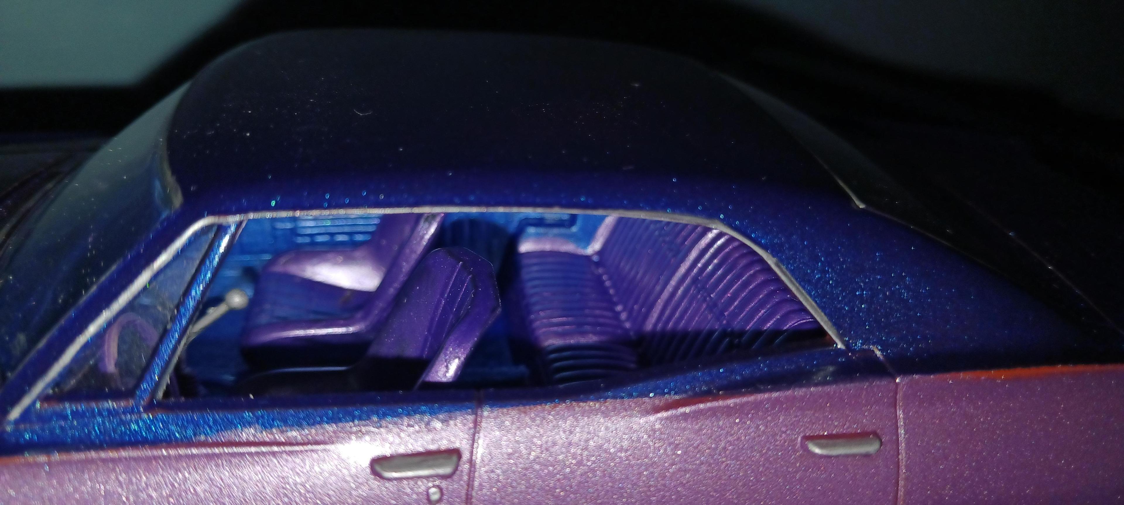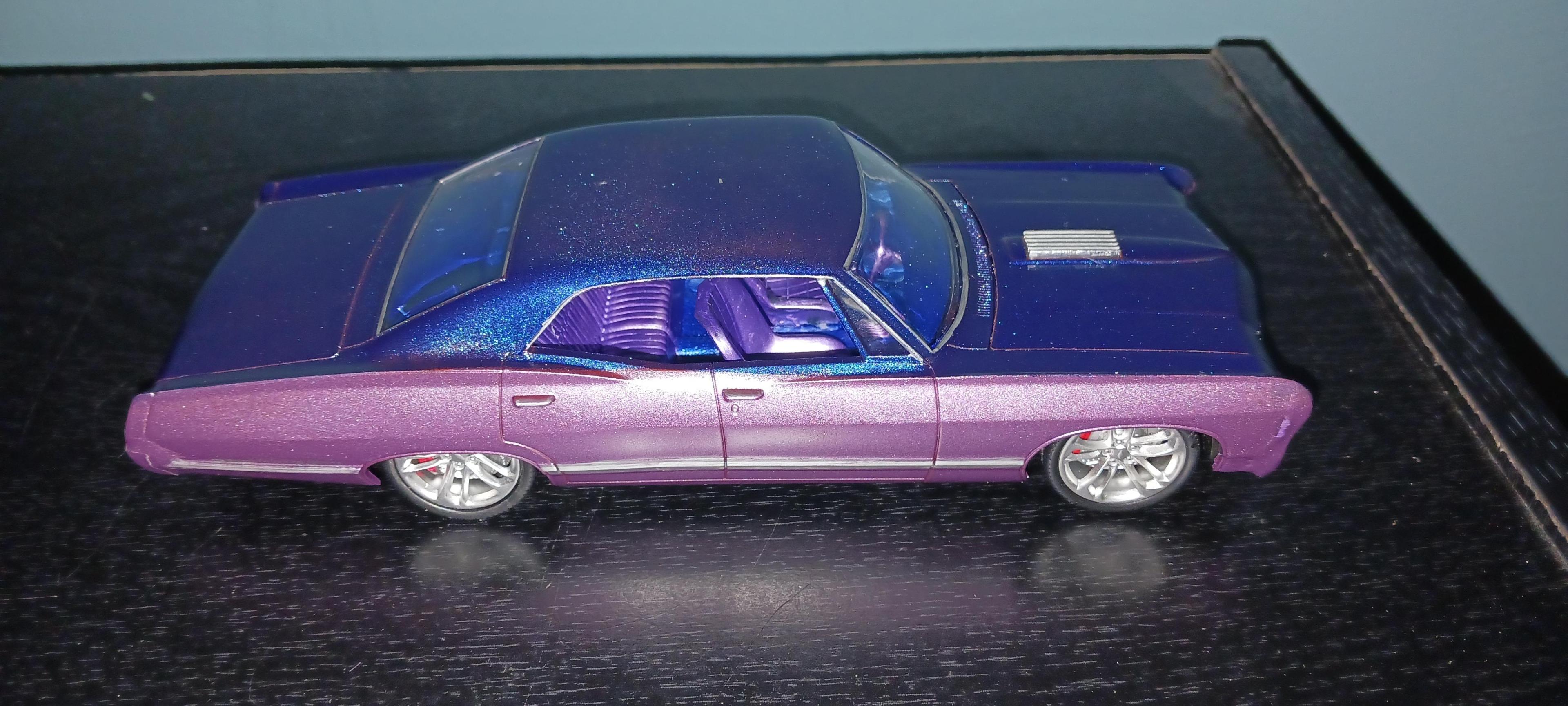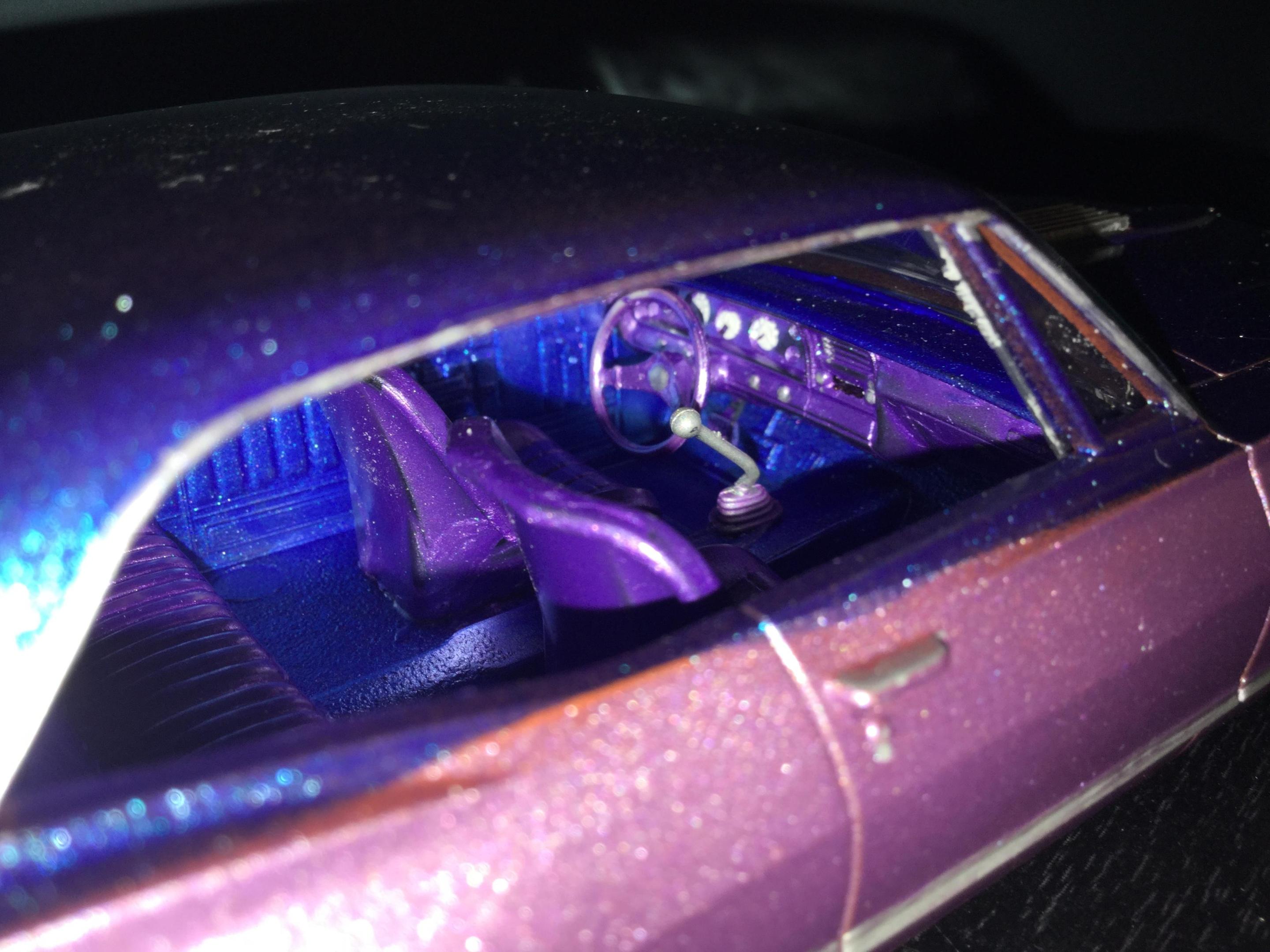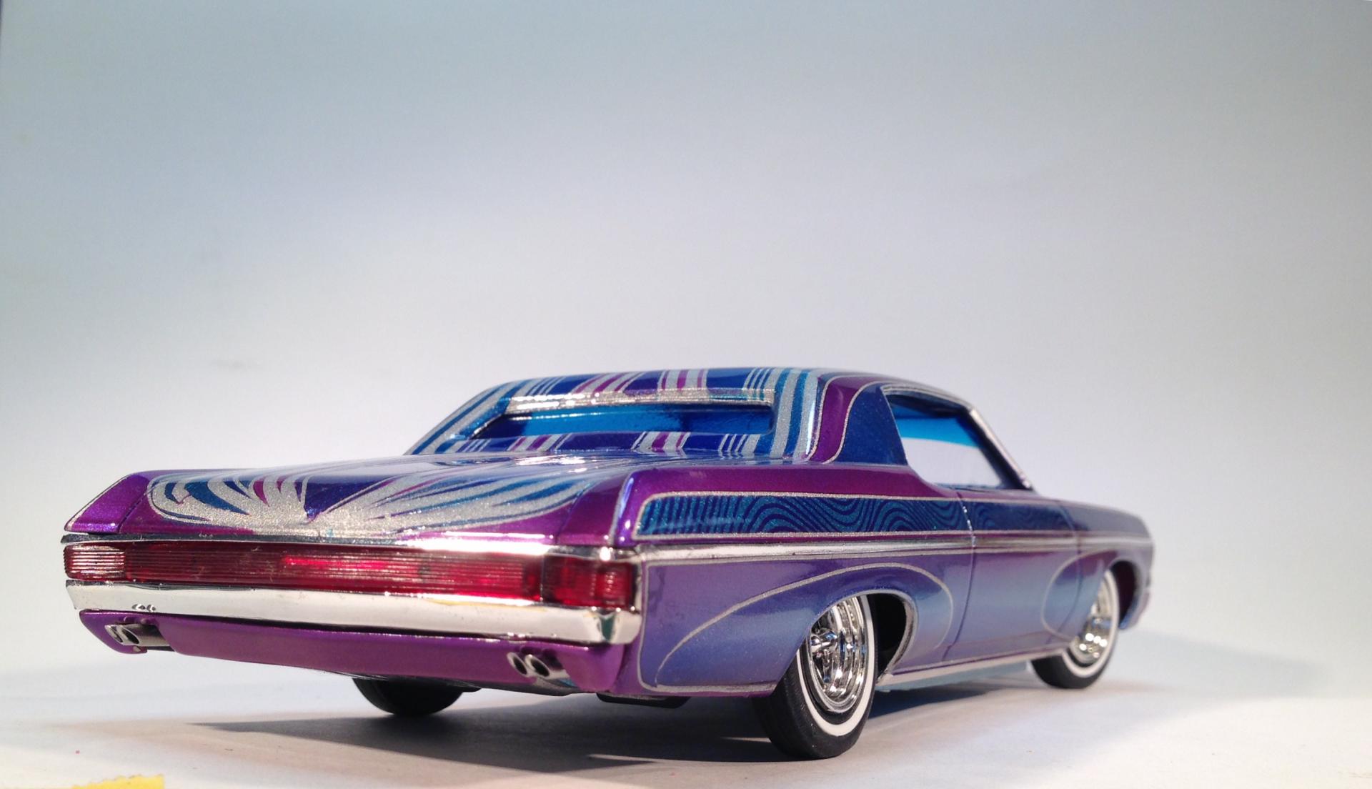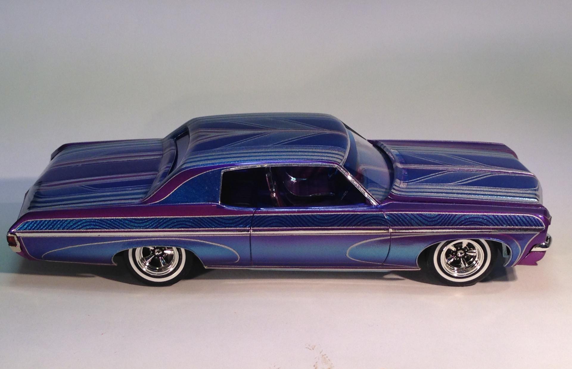 Recently finished: My 1/25 scale version of John D'Agostino's '68 Buick Riviera custom called Pantheon: The original car looks like this: I used amt's '69 Riviera kit to rebuild it in scale. I shaved the body, chopped the top, lowered the suspension, scratch built the wheels and a custom tube grille and wired the engine . Further i tried to replicate some interior details like the tuck'n'roll on the dash, package shelf and door panels, built a center console with cup holders and a TV. Used a parts box steering wheel and amt Parts Pack tires. All what was done to hold kit can be viewed here: Not my best build I must confess. Had a lot of problems with shrinking putty and leaking glue, stance seems not to be low enough and the BMF work could be cleaner... But well, it's done now and I'm happy with my scratch built wheels and glad that I managed the tricky chop. Now, the Pantheon sits in my show case next to John's '61 Oldsmobile The Golden Starfire: Thanks for watching, comments are always welcome! Greetings from Cologne, Germany