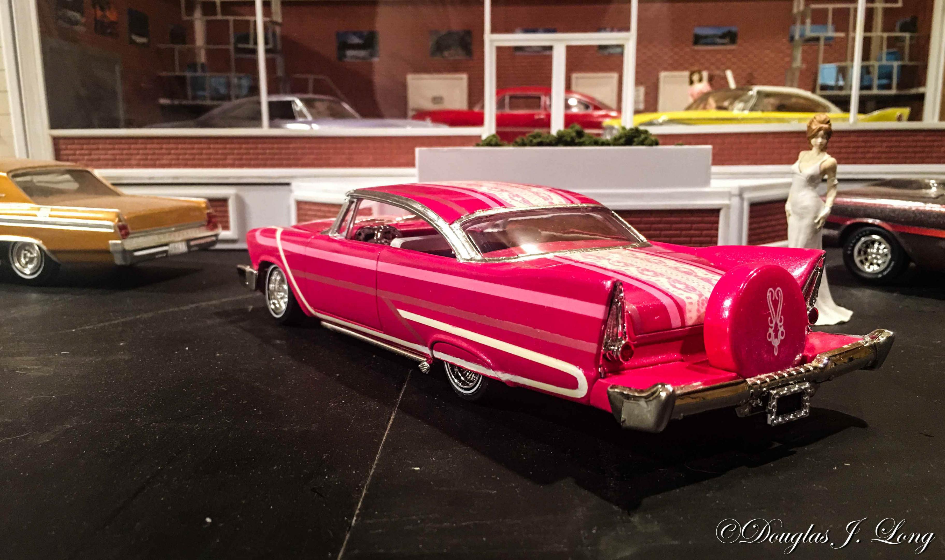 This is a rebuild from a built up I got from ebay last year. First pictures of how I got it and the last is how it looks today. Here it is rebuilt - Not perfect but I feel a bit better than when I got it. Painted Testors' Revving Red with wet look clear. The bubble rear window and custom roof came from another 63 Galaxie I have. The engine block came in the model but I used new chrome from one of the many 63 Ford kits I have to freshen it up. I also used new custom parts from the various 63 Galaxie kits I have. The spotlights are from the AMT 62 Buick kit. Thanks for looking, all comments welcomed.