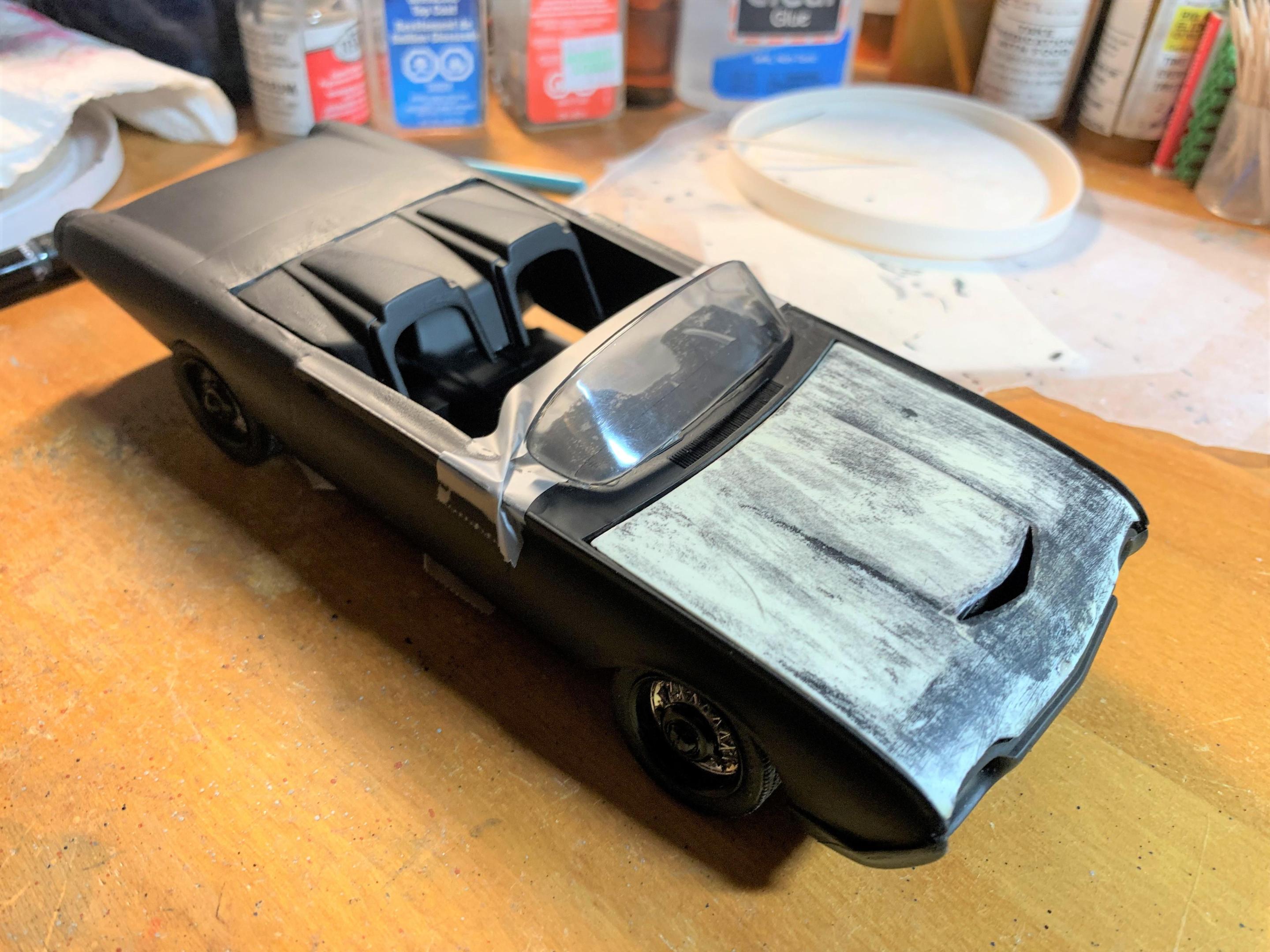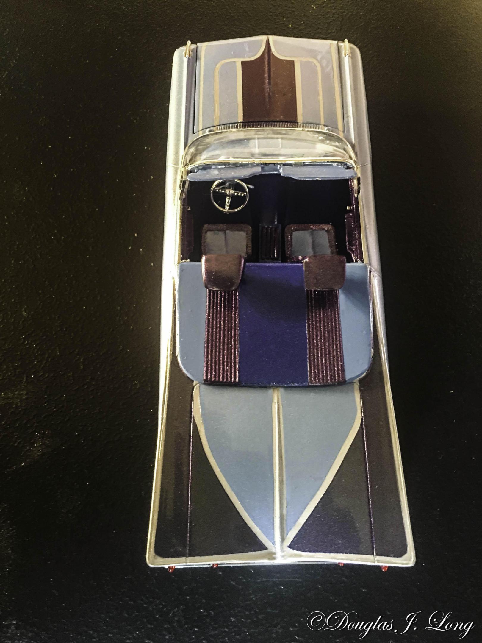 I've seen several excellent builds of the Black Beauty, so I thought I would try something a bit different. I love the look of mid-60's customs, so I thought I would get rid of the Green Hornet gadgets, and go for a straight forward custom Imperial. Rght out of the box, the kit has many of the bells & whistles of a 60's custom (roll pans, custom grill, fender skirts), so it shouldn't require too much effort to go this route. I molded in the bumper and trunk rocket launchers, and inspired by the '64 Imperial box art (courtesy of Model Roundup), I went with a black roof/light blue body: The blue is some ancient Testor's "Colors by Boyd" Ice Blue, thinned with lacquer thinner and airbrushed. I think the kit mag wheels are kind of meh, so I'm going with AMT '63 'Vette wheels mounted on vintage AMT Firestone Supreme whitewalls - That's it for now!