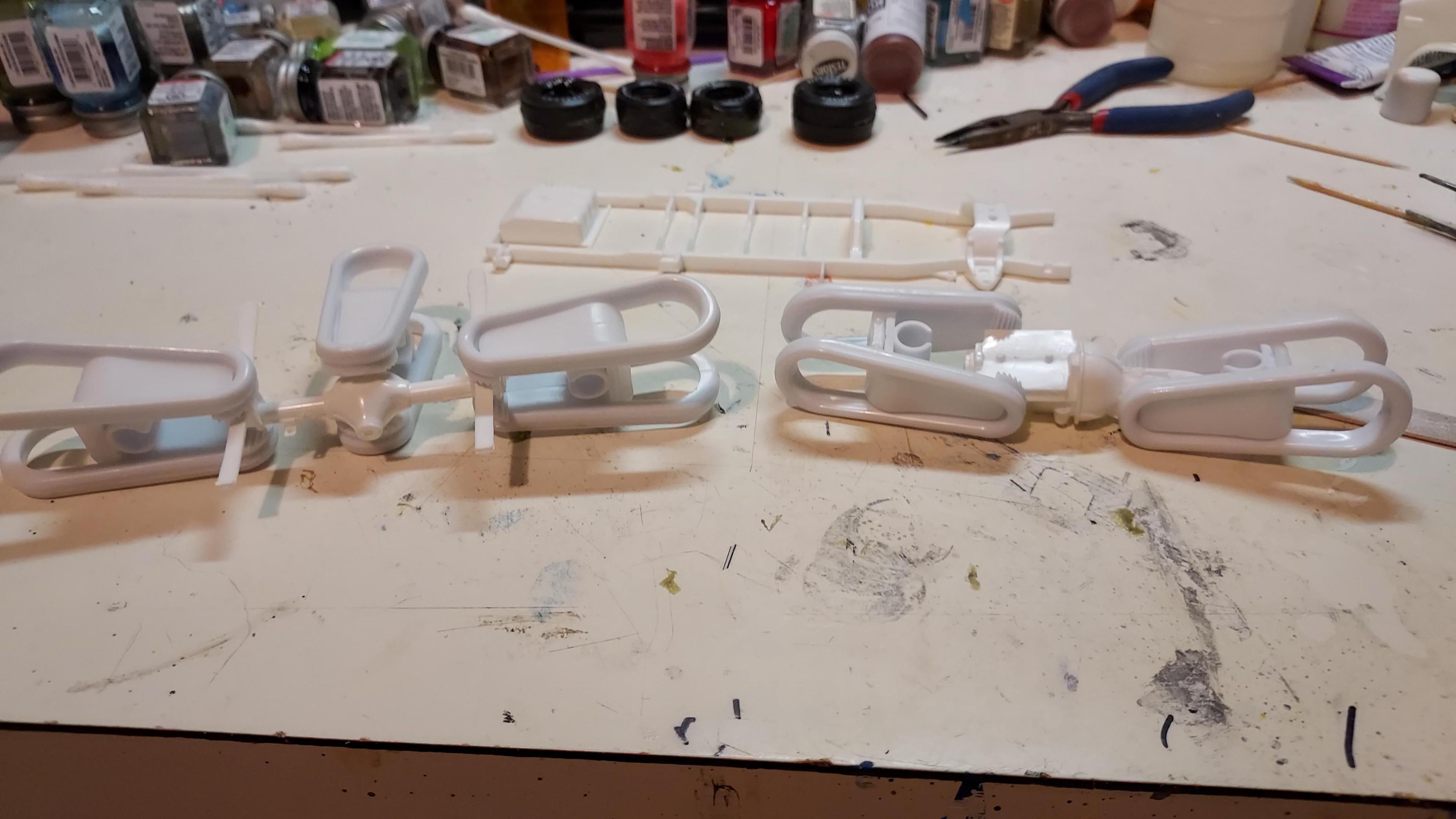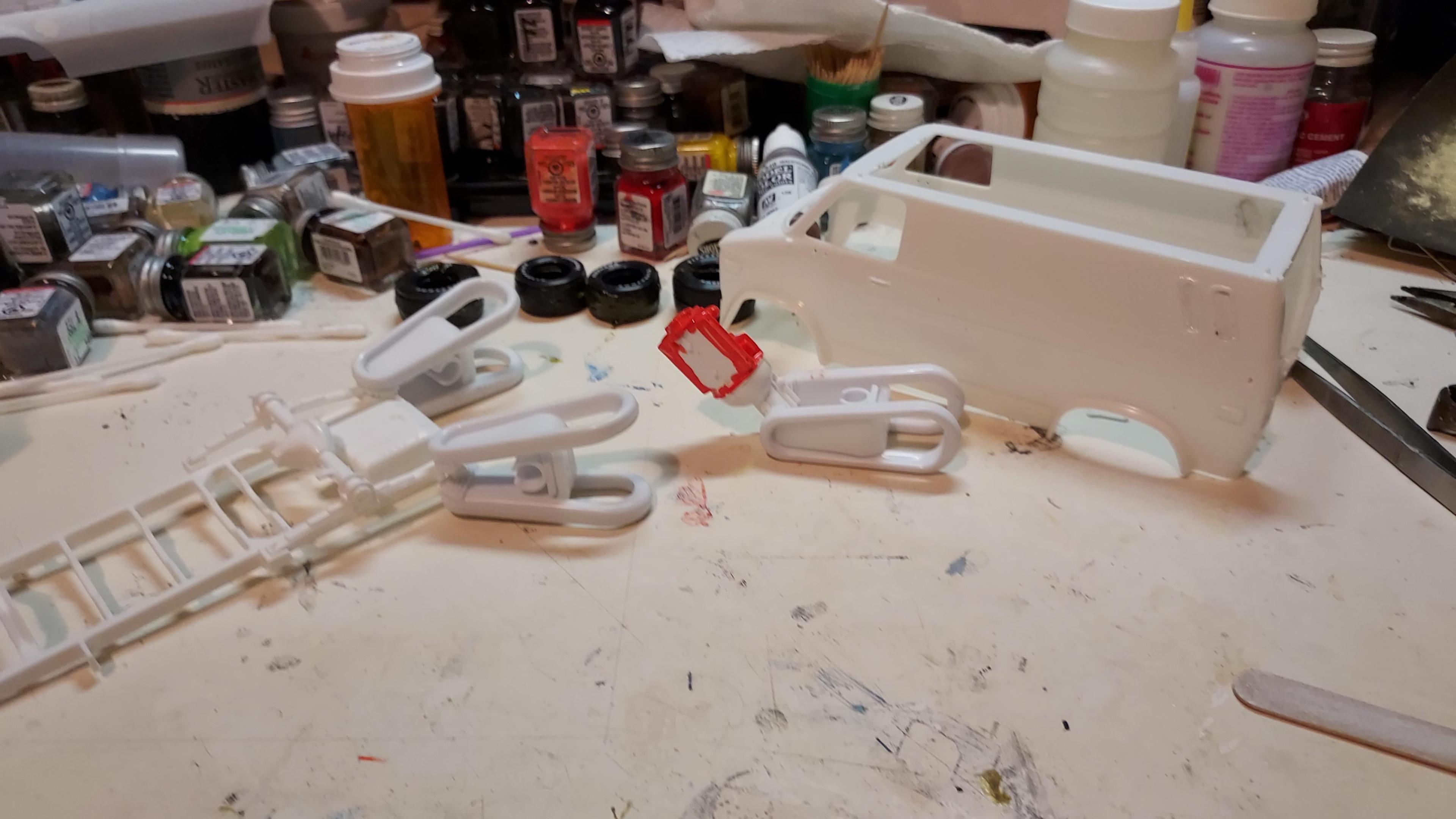 For this build, I decided to combine the Ford surfer van (graphics) with the Chevy custom van. First off, I like any porthole window in custom vans, but the graphics are so cool that I didn't want to take away from that, so I filled the windows in with some styrene strips and glued them into place. Next, they'll get some putty to smooth them out. Next if you haven't already gone to the dollar store and pick up some of these plastic clothes pins you should. They're great for everything. Strangely, the instruction sheet has a picture of an intake manifold but there is none in the kit. Or valve covers but a shiny chrome air cleaner. No biggie, this is pretty much a curbside kit anyway. Secondly, those 2-piece tires totally suck. I even used some 3M black weather-stripping adhesive and first there is no way to line the 2 halves' up. You just have to wing it. Not cool Revell. Stick with 1-piece tires from now on. This is the 2nd time I glued them together. They fall apart the moment I try to put them onto the socket to spin them to even out the tread. I'll let them set up overnight.